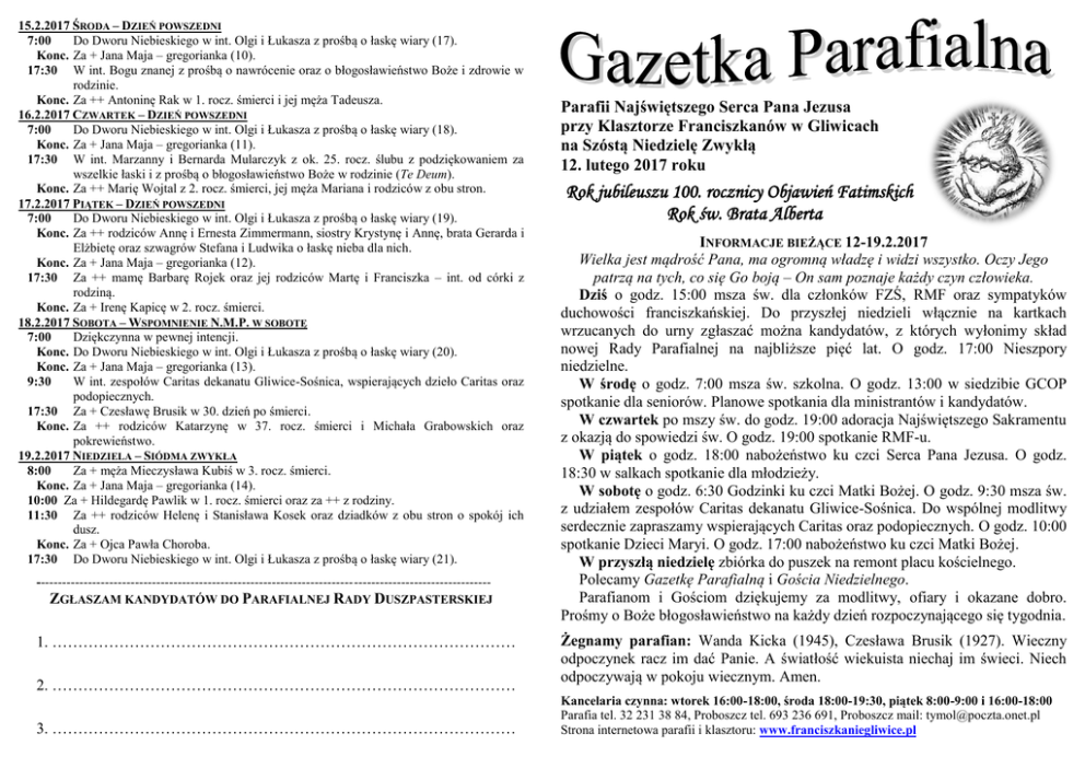 15.2.2017 ŚRODA – DZIEŃ POWSZEDNI 7:00 Do Dworu Niebieskiego w int. Olgi i Łukasza z prośbą o łaskę wiary (17). Konc. Za + Jana Maja – gregorianka (10). 17:30 W int. Bogu znanej z prośbą o nawrócenie oraz o błogosławieństwo Boże i zdrowie w rodzinie. Konc. Za ++ Antoninę Rak w 1. rocz. śmierci i jej męża Tadeusza. 16.2.2017 CZWARTEK – DZIEŃ POWSZEDNI 7:00 Do Dworu Niebieskiego w int. Olgi i Łukasza z prośbą o łaskę wiary (18). Konc. Za + Jana Maja – gregorianka (11). 17:30 W int. Marzanny i Bernarda Mularczyk z ok. 25. rocz. ślubu z podziękowaniem za wszelkie łaski i z prośbą o błogosławieństwo Boże w rodzinie (Te Deum). Konc. Za ++ Marię Wojtal z 2. rocz. śmierci, jej męża Mariana i rodziców z obu stron. 17.2.2017 PIĄTEK – DZIEŃ POWSZEDNI 7:00 Do Dworu Niebieskiego w int. Olgi i Łukasza z prośbą o łaskę wiary (19). Konc. Za ++ rodziców Annę i Ernesta Zimmermann, siostry Krystynę i Annę, brata Gerarda i Elżbietę oraz szwagrów Stefana i Ludwika o łaskę nieba dla nich. Konc. Za + Jana Maja – gregorianka (12). 17:30 Za ++ mamę Barbarę Rojek oraz jej rodziców Martę i Franciszka – int. od córki z rodziną. Konc. Za + Irenę Kapicę w 2. rocz. śmierci. 18.2.2017 SOBOTA – WSPOMNIENIE N.M.P. W SOBOTĘ 7:00 Dziękczynna w pewnej intencji. Konc. Do Dworu Niebieskiego w int. Olgi i Łukasza z prośbą o łaskę wiary (20). Konc. Za + Jana Maja – gregorianka (13). 9:30 W int. zespołów Caritas dekanatu Gliwice-Sośnica, wspierających dzieło Caritas oraz podopiecznych. 17:30 Za + Czesławę Brusik w 30. dzień po śmierci. Konc. Za ++ rodziców Katarzynę w 37. rocz. śmierci i Michała Grabowskich oraz pokrewieństwo. 19.2.2017 NIEDZIELA – SIÓDMA ZWYKŁA 8:00 Za + męża Mieczysława Kubiś w 3. rocz. śmierci. Konc. Za + Jana Maja – gregorianka (14). 10:00 Za + Hildegardę Pawlik w 1. rocz. śmierci oraz za ++ z rodziny. 11:30 Za ++ rodziców Helenę i Stanisława Kosek oraz dziadków z obu stron o spokój ich dusz. Konc. Za + Ojca Pawła Choroba. 17:30 Do Dworu Niebieskiego w int. Olgi i Łukasza z prośbą o łaskę wiary (21). ---------------------------------------------------------------------------------------------------------ZGŁASZAM KANDYDATÓW DO PARAFIALNEJ RADY DUSZPASTERSKIEJ 1. ……………………………………………………………………………… 2. ……………………………………………………………………………… 3. ……………………………………………………………………………… Parafii Najświętszego Serca Pana Jezusa przy Klasztorze Franciszkanów w Gliwicach na Szóstą Niedzielę Zwykłą 12. lutego 2017 roku Rok jubileuszu 100. rocznicy Objawień Fatimskich Rok św. Brata Alberta INFORMACJE BIEŻĄCE 12-19.2.2017 Wielka jest mądrość Pana, ma ogromną władzę i widzi wszystko. Oczy Jego patrzą na tych, co się Go boją – On sam poznaje każdy czyn człowieka. Dziś o godz. 15:00 msza św. dla członków FZŚ, RMF oraz sympatyków duchowości franciszkańskiej. Do przyszłej niedzieli włącznie na kartkach wrzucanych do urny zgłaszać można kandydatów, z których wyłonimy skład nowej Rady Parafialnej na najbliższe pięć lat. O godz. 17:00 Nieszpory niedzielne. W środę o godz. 7:00 msza św. szkolna. O godz. 13:00 w siedzibie GCOP spotkanie dla seniorów. Planowe spotkania dla ministrantów i kandydatów. W czwartek po mszy św. do godz. 19:00 adoracja Najświętszego Sakramentu z okazją do spowiedzi św. O godz. 19:00 spotkanie RMF-u. W piątek o godz. 18:00 nabożeństwo ku czci Serca Pana Jezusa. O godz. 18:30 w salkach spotkanie dla młodzieży. W sobotę o godz. 6:30 Godzinki ku czci Matki Bożej. O godz. 9:30 msza św. z udziałem zespołów Caritas dekanatu Gliwice-Sośnica. Do wspólnej modlitwy serdecznie zapraszamy wspierających Caritas oraz podopiecznych. O godz. 10:00 spotkanie Dzieci Maryi. O godz. 17:00 nabożeństwo ku czci Matki Bożej. W przyszłą niedzielę zbiórka do puszek na remont placu kościelnego. Polecamy Gazetkę Parafialną i Gościa Niedzielnego. Parafianom i Gościom dziękujemy za modlitwy, ofiary i okazane dobro. Prośmy o Boże błogosławieństwo na każdy dzień rozpoczynającego się tygodnia. Żegnamy parafian: Wanda Kicka (1945), Czesława Brusik (1927). Wieczny odpoczynek racz im dać Panie. A światłość wiekuista niechaj im świeci. Niech odpoczywają w pokoju wiecznym. Amen. Kancelaria czynna: wtorek 16:00-18:00, środa 18:00-19:30, piątek 8:00-9:00 i 16:00-18:00 Parafia tel. 32 231 38 84, Proboszcz tel. 693 236 691, Proboszcz mail: [email protected] Strona internetowa parafii i klasztoru: www.franciszkaniegliwice.pl KOMUNIKAT BISKUPA GLIWICKIEGO JANA KOPCA Drodzy Diecezjanie! Zgodnie z ustawą o działalności pożytku publicznego i o wolontariacie każdy podatnik ma możliwość przekazania 1% swojego podatku zamiast do budżetu państwa - na wybraną przez siebie organizację pożytku publicznego. Instytucją posiadającą status organizacji pożytku publicznego jest Caritas Diecezji Gliwickiej. Śpieszy ona z pomocą ludziom ubogim, chorym i potrzebującym poprzez struktury oraz placówki obejmujące całą diecezję. Prowadzi stacje opieki i gabinety rehabilitacyjne, ośrodki dla osób niepełnosprawnych, świetlice dla dzieci, młodzieży oraz osób w jesieni życia, kuchnie dla ubogich, dom pomocy społecznej. Caritas diecezjalna prowadzi również wypożyczalnie sprzętu rehabilitacyjnego. Drodzy Bracia i Siostry, zwracam się do Was z gorącą prośbą o przekazanie 1% należnego podatku na realizowane przez Caritas naszej diecezji dzieła miłosierdzia i pomocy wobec najuboższych. +Jan Kopiec, Biskup Gliwicki Ps. Informujemy również, że na stronie: www.caritas.gliwice.pl znajduje się program do rozliczania PIT-ów za rok 2016. JAK TO W KOŃCU JEST? BAĆ SIĘ BOGA CZY SIĘ NIE BAĆ? Już od dawna i często zastanawiałem się nad tym, co to wła