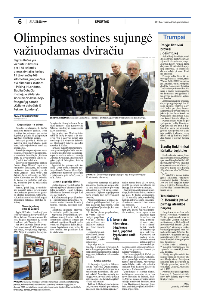 6 SPORTAS 2013 m. vasario 25 d., pirmadienis Olimpines sostines sujungė važiuodamas dviračiu Giedriaus BARANAUSKO nuotr. Sigitas Kučas yra vienintelis lietuvis, per 168 kelionės dienas dviračiu įveikęs 11 tūkstančių 468 kilometrus, jungiančius dvi olimpines sostines – Pekiną ir Londoną. Šiaulių Dviračių muziejuje atidar yta šio vilniečio keliautojo fotografijų paroda „Kelionė dviračiais iš Pekino į Londoną“. Živilė KAVALIAUSKAITĖ [email protected] Ekspozicijoje – ir dviratis Par od os atid ar ym ą S. Kuč as pas kelb ė trim ito gars ais. Toks trimit as jau aštuoner ius metus žygeivius pakelia iš palapinių ir kviečia į žemėlapio sueigą. Pristatyti parodą S. Kučas pa kvietė ir būrį bendražygių, kurie kartu keliavo įvairiomis maršruto atkarpomis. Parodoje eksponuojamos nuo traukos, žygio dalyvių atributika, eduk ac in is žem ėl ap is „Kel iauk kartu su dviratininku Sigitu Ku ču“ bei S. Kučo dviratis. Šis dviratis pagamintas olandų firmos „Koga Miyata“ pagal dvi rat in inko užs ak ym ą, sur inkt as rankomis. Ant dviračio yra už rašas „Sigitas – Silk Roud“, nes dviratis buvo pirktas žygiui Šilko keliu. Kelionėse ant šio dviračio S. Kučas yra praleidęs 460 die nų, numynęs per 30 tūkstančių kilometr ų. Pernai, prieš žygį, dviratinin kas pakeitė ratus: priekiniame rate įtaisytas generatorius gami na elektrą žibintams, GPS imtu vui, mindamas dviratininkas gali pasikrauti baterijas, mobilųjį te lefoną. Planuoja kelionę į Rio de Žaneirą Žygis „Iš Pekino į Londoną“ pra sidėjo praėjusių metų vasario 27 dieną Pekine, Tiananmenio aikš tėje, baigėsi rugpjūčio 12 dieną Londone, prie Tauerio tilto. Per 168 kelionės dienas dvira čiais nuvažiuota 11468 kilometrai per Kiniją, Pietų Korėją, Japoniją, JAV, Airiją ir Jungtinę Karalystę. BENDR AMINČIAI: Keliautojas Sigitas Kučas į parodos pristatymą pakvietė dviračių kelionių bendražygių. Daugiausia dienų keliauta Ame rikos žemyne – nuo Ramiojo iki Atlanto vandenyno nuvažiuot a 6339 kilometrai. Žygyje dalyvavo 82 dviratinin kai iš 13 šalių, 54 vyrai ir 28 mo ter ys. Tik 5 dalyviai įveikė visą maršrutą – 3 iš Naujosios Zelandi jos, 1 lenkas ir 1 lietuvis – parodos autorius S. Kučas. Pirmasis žygis Olimpiniams me tams paminėti įvyko 2004 metais: iš šiauriausio Europos taško Nord kapo dvir ač iais mint a į senąj ą Olimpiją Graikijoje. 2008 metais vyko žygis iš Olimpijos į Pekiną Šilko keliu. Žygeiviai jau galvoja apie ke lionę į 2016 metų olimpinę sos tinę – Rio de Žaneirą (Brazilija). „Planuokite pusmečio atostogas ir prisijunkite prie mūsų“, – ragi no S. Kučas. Japonai pagelbėję dėkoja „Keliauti man yra stebuklas. Ši kelionė irgi buvo pilna mažų ir di delių stebuklų“, – sakė S. Kučas, dėkodamas žmonai Marijai, kad „vis dar laukia“. S. Kučas patyrė: patys įdomiau si – susitikimai su žmonėmis. Ke lionėse sutikti žmonės kviečia į nam us, vaiš in a, sur eng ia kon certų. Išskirtiniai įspūdžiai – apie visa da norinčius padėti japonus. Japonijoje dviratininkams pri važiavus tunelį, kuriuo rieda au tom ob il iai, jap on as įspėj o: čia važiuoti negalima. Beveik du ki lometr us, bėgdamas šalia, šis ja ponas žygeiviams rodė kelią iki kito tunelio. Bet paaiškėjo, kad šis uždar ytas. PARODA: Dviračių muziejuje vilniečio keliautojo Sigito Kučo fotografijų paroda „Kelionė dviračiais iš Pekino į Londoną“ veiks iki rugpjūčio 24 dienos. 2010 metais šiame muziejuje eksponuota Sigito ir Daumanto Kučų fotografijų paroda „Dviračiais Šilko keliu“. Trumpai Ralyje lietuviai brovėsi į dešimtuką Šeštadienį Latvijoje prasi dėjo antrasis Lietuvos ir Lat vijos ralio čempionatų etapas „Sarma-2013“. Pirmąją dieną dalyvavo 88 ekipažai iš septy nių valstybių. Po pirmosios dienos ralyje pirmavo Rusi jos atstovai. Pirmąją ralio dieną iš Lie tuvių geriausiai sekėsi „Halls Winter Rally-2013“ nugalėto jui Deividui Jociui. Jam įkan din lėkė Dominykas Butvilas. Trečia riedėjo Benedikto Va nago ir Gretos Germanavičiū tės komanda. Dėl gedimo iš lenktynių pasitraukė Vytau tas Švedas. Antrąją dieną prie jau esan čių dalyvių prisijungė dar 22 ralio-sprinto varžybų daly viai. Vakar po pietų lietuvis Dominykas Butvilas bendroje įskaitoje jau buvo ketvirtas. Pirmajame dešimtuke rikia vosi keturi lietuvių ekipažai. Puikiai sekėsi vair uoti per snieg uot ą kel ią Ram ūn ui Čapk ausk ui su Tom u Šip kausk u, kur ie po ašt uon ių greičio ruožų bendroje įskai toje pakilo į aštuntą vietą. Iškart už jų finišavo Deivi das Jocius ir užėmė devintą vietą. Šiaulių tinklininkai išsilaiko trejetuke DVIRATIS: Šiuo dviračiu Sigitas Kučas per 460 dienų numynė per 30 tūkstančių kilometrų. Palydovas susiėmęs už galvos kiečio namas buvo už 10 mylių, aimanavo. Galiausiai nusprendė: pasiūlė pagalbos nuvažiuoti pas su savo maža mašinėle po vieną draugą. Šio nebuvo namuose. keliautojus perveš ankstesniuo Padėkojęs pagalbininkui ir pati ju tuneliu. Grįžtant atgal japonas kinęs, kad vakare dviratį susitvar mynė dviratį, kurį davė vienas iš kys pats, S. Kučas atsisveikino. lietuvių. Už 10 minučių prie jo stabtelėjo Atsisveikindamas japonas nu mašina, iš kurios išlipo kitas ame silenkė: padėkojo už tai, kad pa rikietis – su troseliu ir instrumen darė paslaugą žygeiviams. Tokia tais rankose. japonų filosofija: dėkoja, kai kam Pasak S. Kučo, Amer ik ai mi nors padeda. nint 200 metų nepriklausomy S. Kuč as pirm a pagalvod avo, bės metines, buvo organizuotas ar ver t a jap on o didžiulis žygis praš yt i pag alb os. dvir ač iais per Nes jei jap on as šal į, par eng Beveik du pat s než in os, dės ti maršr ut ai, kilometrus, did žiul es pas tan išl eist i žem ė gas, kad išs iaiš lap iai, pateik b