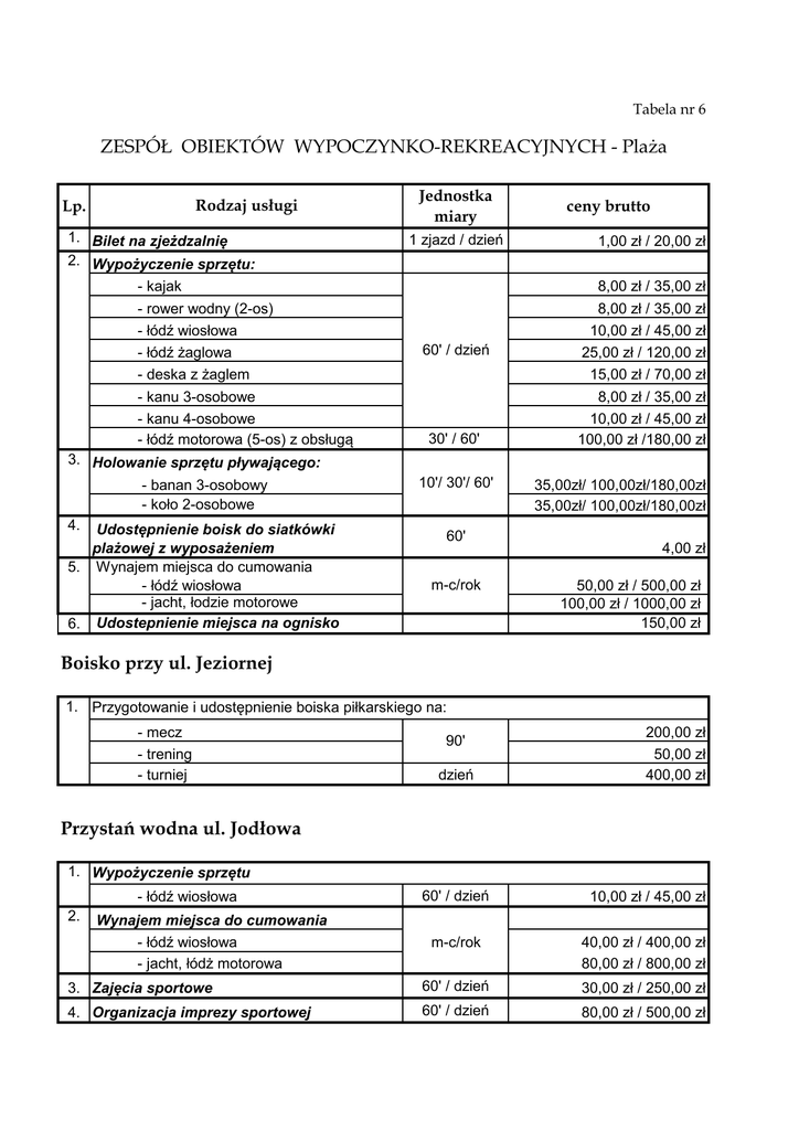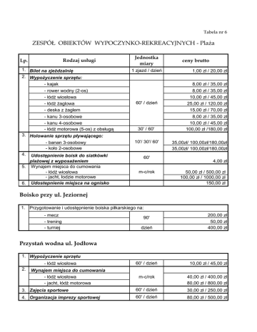 Tabela nr 6 ZESPÓŁ OBIEKTÓW WYPOCZYNKO-REKREACYJNYCH - Plaża Rodzaj usługi Lp. 1. Bilet na zjeżdzalnię 2. Wypożyczenie sprzętu: - kajak - rower wodny (2-os) - łódź wiosłowa - łódź żaglowa - deska z żaglem - kanu 3-osobowe - kanu 4-osobowe - łódź motorowa (5-os) z obsługą 3. Holowanie sprzętu pływającego: - banan 3-osobowy - koło 2-osobowe 4. Udostępnienie boisk do siatkówki plażowej z wyposażeniem 5. Wynajem miejsca do cumowania - łódź wiosłowa - jacht, łodzie motorowe 6. Udostepnienie miejsca na ognisko Jednostka miary 1 zjazd / dzień 60' / dzień 30' / 60' 10'/ 30'/ 60' 60' m-c/rok ceny brutto 1,00 zł / 20,00 zł 8,00 zł / 35,00 zł 8,00 zł / 35,00 zł 10,00 zł / 45,00 zł 25,00 zł / 120,00 zł 15,00 zł / 70,00 zł 8,00 zł / 35,00 zł 10,00 zł / 45,00 zł 100,00 zł /180,00 zł 35,00zł/ 100,00zł/180,00zł 35,00zł/ 100,00zł/180,00zł 4,00 zł 50,00 zł / 500,00 zł 100,00 zł / 1000,00 zł 150,00 zł Boisko przy ul. Jeziornej 1. Przygotowanie i udostępnienie boiska piłkarskiego na: - mecz - trening - turniej 90' dzień 200,00 zł 50,00 zł 400,00 zł Przystań wodna ul. Jodłowa 1. Wypożyczenie sprzętu 60' / dzień 10,00 zł / 45,00 zł m-c/rok 40,00 zł / 400,00 zł 80,00 zł / 800,00 zł 3. Zajęcia sportowe 60' / dzień 30,00 zł / 250,00 zł 4. Organizacja imprezy sportowej 60' / dzień 80,00 zł / 500,00 zł - łódź wiosłowa 2. Wynajem miejsca do cumowania - łódź wiosłowa - jacht, łódż motorowa