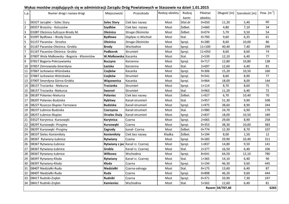 Wykaz mostów w ciągach dróg powiatowych na terenie Powiatu