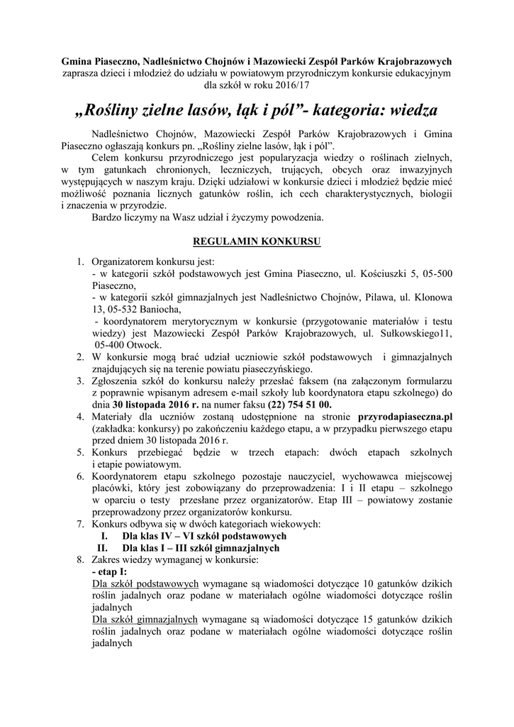 Gmina Piaseczno, Nadleśnictwo Chojnów i Mazowiecki Zespół Parków Krajobrazowych zaprasza dzieci i młodzież do udziału w powiatowym przyrodniczym konkursie edukacyjnym dla szkół w roku 2016/17 „Rośliny zielne lasów, łąk i pól”- kategoria: wiedza Nadleśnictwo Chojnów, Mazowiecki Zespół Parków Krajobrazowych i Gmina Piaseczno ogłaszają konkurs pn. „Rośliny zielne lasów, łąk i pól”. Celem konkursu przyrodniczego jest popularyzacja wiedzy o roślinach zielnych, w tym gatunkach chronionych, leczniczych, trujących, obcych oraz inwazyjnych występujących w naszym kraju. Dzięki udziałowi w konkursie dzieci i młodzież będzie mieć możliwość poznania licznych gatunków roślin, ich cech charakterystycznych, biologii i znaczenia w przyrodzie. Bardzo liczymy na Wasz udział i życzymy powodzenia. REGULAMIN KONKURSU 1. Organizatorem konkursu jest: - w kategorii szkół podstawowych jest Gmina Piaseczno, ul. Kościuszki 5, 05-500 Piaseczno, - w kategorii szkół gimnazjalnych jest Nadleśnictwo Chojnów, Pilawa, ul. Klonowa 13, 05-532 Baniocha, - koordynatorem merytorycznym w konkursie (przygotowanie materiałów i testu wiedzy) jest Mazowiecki Zespół Parków Krajobrazowych, ul. Sułkowskiego11, 05-400 Otwock. 2. W konkursie mogą brać udział uczniowie szkół podstawowych i gimnazjalnych znajdujących się na terenie powiatu piaseczyńskiego. 3. Zgłoszenia szkół do konkursu należy przesłać faksem (na załączonym formularzu z poprawnie wpisanym adresem e-mail szkoły lub koordynatora etapu szkolnego) do dnia 30 listopada 2016 r. na numer faksu (22) 754 51 00. 4. Materiały dla uczniów zostaną udostępnione na stronie przyrodapiaseczna.pl (zakładka: konkursy) po zakończeniu każdego etapu, a w przypadku pierwszego etapu przed dniem 30 listopada 2016 r. 5. Konkurs przebiegać będzie w trzech etapach: dwóch etapach szkolnych i etapie powiatowym. 6. Koordynatorem etapu szkolnego pozostaje nauczyciel, wychowawca miejscowej placówki, który jest zobowiązany do przeprowadzenia: I i II etapu – szkolnego w oparciu o testy przesłane przez organizatorów. Etap III – powiatowy zostanie przeprowadzony przez organizatorów konkursu. 7. Konkurs odbywa się w dwóch kategoriach wiekowych: I. Dla klas IV – VI szkół podstawowych II. Dla klas I – III szkół gimnazjalnych 8. Zakres wiedzy wymaganej w konkursie: - etap I: Dla szkół podstawowych wymagane są wiadomości dotyczące 10 gatunków dzikich roślin jadalnych oraz podane w materiałach ogólne wiadomości dotyczące roślin jadalnych Dla szkół gimnazjalnych wymagane są wiadomości dotyczące 15 gatunków dzikich roślin jadalnych oraz podane w materiałach ogólne wiadomości dotyczące roślin jadalnych - etap II: Dla szkół podstawowych wymagane są wiadomości dotyczące 10 gatunków roślin leczniczych oraz podane w materiałach ogólne wiadomości dotyczące roślin leczniczych, jak również wiadomości z etapu I Dla szkół gimnazjalnych wymagane są wiadomości dotyczące 15 gatunków roślin leczniczych oraz podane w materiałach ogólne wiadomości dotyczące roślin leczniczych, jak również wiadomości z etapu I - etap III – powiatowy: Dla szkół podstawowych wymagane są wiadomości dotyczące do 15 gatunków roślin chronionych, trujących i niebezpiecznych oraz podane w materiałach ogólne wiadomości dotyczące roślin chronionych, trujących i niebezpiecznych, jak również wiadomości z etapu I i II Dla szkół gimnazjalnych wymagane są wiadomości dotyczące do 20 gatunków chronionych, trujących i niebezpiecznych oraz podane w materiałach ogólne wiadomości dotyczące roślin chronionych, trujących i niebezpiecznych, jak również wiadomości z etapu I i II 9. Terminy poszczególnych etapów: - etap I – przekazanie przez nauczyciela drogą mailową wyników do dnia 6 stycznia 2017 r. (liczba uczniów którzy przeszli do kolejnego etapu) - etap II – przekazanie przez nauczyciela drogą mailową wyników do dnia 17 marca 2017 r. (liczba uczniów którzy przeszli do kolejnego etapu) - etap III – powiatowy odbędzie się w maju 2017 r. w terminie i w miejscu wskazanym przez organizatorów w terminie późniejszym. 10. Laureaci zostaną wyłonieni na podstawie ilości punktów zdobytych w poszczególnych etapach konkursu. Nad poprawnością odpowiedzi i przydzielaniem punktów czuwać będzie komisja powołana spośród przedstawicieli instytucji organizujących konkurs. 11. Nagrody za zajęcie pierwszych 3 miejsc i maksymalnie do pięciu wyróżnień wśród uczestników szkół podstawowych fundowane są przez Urząd Gminy w Piasecznie. Nagrody za zajęcie pierwszych 3 miejsc i maksymalnie do pięciu wyróżnień wśród uczestników szkół gimnazjalnych fundowane są przez Nadleśnictwo Chojnów. 12. Uroczysty finał konkursu i wręczenie nagród odbędzie się w miejscu i w terminie wskazanym przez organizatorów. 13. Organizatorzy mają prawo do przeprowadzenia kontroli etapu I i II, a koordynatorzy etapów I i II mają obowiązek udostępnić organizatorom testy wypełnione przez uczniów w etapach I i II. 14. Informacje o konkursie oraz wyniki zostaną zamieszczone na stronach: - przyrodapiaseczna.pl - parkiotwock.pl - chojnow.warszawa.lasy.gov.pl 15. Osoba do kontaktu, koordynator konkursu: Beata Zawadzka – Koordynator ds. edukacji przyrodniczej w gminie Piaseczno: e-mail: [email protected] 16. Zgłoszenia do konkursu należy kierować na adres: Chojnowski Park Krajobrazowy tel./faks (22) 754 51 00 tel. kom. 722 397 728 [email protected] www.parkiotwock.pl 17. Wszystkie informacje dotyczące organizacji przebiegu konkursu są jawne i dostępne dla wszystkich uczestników na równych zasadach. 18. Organizatorzy zastrzegają sobie prawo do zmiany regulaminu i terminów.