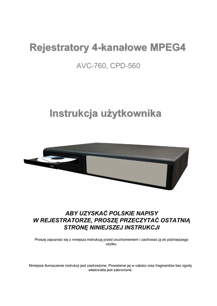 Rejestratory 4-kanałowe MPEG4 AVC-760, CPD-560 Instrukcja użytkownika ABY UZYSKAĆ POLSKIE NAPISY W REJESTRATORZE, PROSZĘ PRZECZYTAĆ OSTATNIĄ STRONĘ NINIEJSZEJ INSTRUKCJI Proszę zapoznać się z niniejsza instrukcją przed uruchomieniem i zachować ją do późniejszego użytku. Niniejsze tłumaczenie instrukcji jest zastrzeżone. Powielanie jej w całości oraz fragmentów bez zgody właściciela jest zabronione. BEZPIECZEŃSTWO UŻYTKOWANIA OSTRZEŻENIE RYZYKO PORAŻENIA PRĄDEM ELEKTRYCZNYM UWAGA: Aby uniknąć porażenia prądem elektrycznym, nie należy otwierać żadnej pokrywy, użytkownik nie może naprawiać urządzenia samodzielnie, ani dokonywać jego przeglądu technicznego. W celu naprawy bądź konserwacji urządzenia należy wezwać wykwalifikowany personel. Każdorazowa próba samodzielnej ingerencji w urządzenie grozi utratą praw gwarancyjnych. Znak ten informuje o występowaniu wysokiego napięcia wewnątrz urządzenia, które może spowodować porażenie. Ten znak informuje o konieczności używania urządzenia zgodnie z instrukcją obsługi. Wszystkie produkty oferowane przez producenta są zgodne z dyrektywami Unii Europejskiej dotyczącymi materiałów i substancji używanych do produkcji urządzeń Ten znak informuje o sposobie utylizacji urządzeń elektronicznych, dla których zakończyła się żywotność. Według dyrektyw Unii Europejskiej, urządzenia te muszą odsegregowane od pozostałych odpadów i zostać zutylizowane. Urządzeń tych nie można wyrzucać do kosza. Znak informujący, że urządzenie zostało wyprodukowane zgodnie z normami europejskimi. Producent zastrzega sobie możliwość zmian treści instrukcji w dowolnym czasie oraz możliwość dokonania zmian w urządzeniu bez uprzedniego poinformowania. UWAGA: Wersja FIRMWARE: 1088-10-K2-04-AA-11; AP VIDEO SERWER: 1055 UWAGA: Aby uzyskać informacje o zmianach w produkcie, proszę kontaktować się z dystrybutorem. . SPIS TREŚCI CECHY I ZAWARTOŚĆ ZAWARTOŚĆ 1.1 1.2 1.3 1.4 CECHY -------------------------------------------------------------------------------------------------------------------------------------------------ZAWARTOŚĆ OPAKOWANIA ------------------------------------------------------------------------------------------------------------------SPECYFIKACJE -------------------------------------------------------------------------------------------------------------------------------------PANEL PRZEDNI ------------------------------------------------------------------------------------------------------------------------------------- 1.5 PANEL TYLNY (AVC760) -------------------------------------------------------------------------------------------------------------------------- URUCHOMIENIE 2.1 URUCHOMIENIE REJESTRATORA ------------------------------------------------------------------------------------------------------------ PODSTAWOWE OPERACJE 3.1 NAGRYWANIE ---------------------------------------------------------------------------------------------------------------------------------------3.2 ODTWARZANIE --------------------------------------------------------------------------------------------------------------------------------------- SZCZEGÓ SZCZEGÓŁY KONFIGURACJI MENU 4.1 4.2 4.3 4.4 4.5 4.6 4.7 4.8 4.9 4.10 4.11 4.12 4.13 4.14 4.15 STRUKTURA MENU ------------------------------------------------------------------------------------------------------------------------------MENU GŁÓWNE - NAGRYWANIE -----------------------------------------------------------------------------------------------------------MENU GŁÓWNE - TIMER -----------------------------------------------------------------------------------------------------------------------MENU GŁÓWNE - DATA ------------------------------------------------------------------------------------------------------------------------MENU GŁÓWNE – ZAAWANSOWANE ----------------------------------------------------------------------------------------------------MENU ZAWANSOWANE - KAMERA --------------------------------------------------------------------------------------------------------MENU ZAAWANSOWANE - DETEKCJA ---------------------------------------------------------------------------------------------------MENU ZAAWANSOWANE - EKRAN --------------------------------------------------------------------------------------------------------MENU ZAAWANSOWANE - ALARM --------------------------------------------------------------------------------------------------------MENU ZAAWANSOWANE - STEROWANIE ----------------------------------------------------------------------------------------------MENU ZAAWANSOWANE - SYSTEM ------------------------------------------------------------------------------------------------------MENU ZAAWANSOWANE - SIEĆ ------------------------------------------------------------------------------------------------------------MENU ZAAWANSOWANE - KOPIA ---------------------------------------------------------------------------------------------------------MENU ZAAWANSOWANE – INFO O HDD ------------------------------------------------------------------------------------------------MENU ZAAWANSOWANE – LISTA ZDARZEŃ ------------------------------------------------------------------------------------------- OPERACJE DODATKOWE 5.1 5.2 5.3 5.4 WYSZUKIWANIE ------------------------------------------------------------------------------------------------------------------------------------BLOKOWANIE KLAWIATURY ------------------------------------------------------------------------------------------------------------------AKTUALIZACJA OPROGRAMOWANIA -----------------------------------------------------------------------------------------------------OPROGRAMOWANIE VIDEO SERVER ------------------------------------------------------------------------------------------------------INSTALACJA --------------------------------------------------------------------------------------------------------------