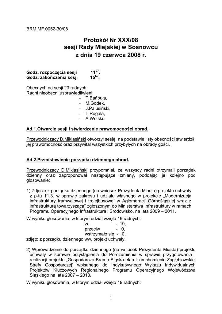BRM.MF.0052-30/08 Protokół Nr XXX/08 sesji Rady Miejskiej w Sosnowcu z dnia 19 czerwca 2008 r. Godz. rozpoczęcia sesji Godz. zakończenia sesji 1107. 1550. Obecnych na sesji 23 radnych. Radni nieobecni usprawiedliwieni: - T.Bańbuła, - M.Godek, - J.Palusiński, - T.Rogala, - A.Wolski. Ad.1.Otwarcie sesji i stwierdzenie prawomocności obrad. Przewodniczący D.Miklasiński otworzył sesję, na podstawie listy obecności stwierdził jej prawomocność oraz przywitał wszystkich przybyłych na obrady gości. Ad.2.Przedstawienie porządku dziennego obrad. Przewodniczący D.Miklasiński przypomniał, Ŝe wszyscy radni otrzymali porządek dzienny oraz zaproponował następujące zmiany, poddając je kolejno pod głosowanie: 1) Zdjęcie z porządku dziennego (na wniosek Prezydenta Miasta) projektu uchwały z p-tu 11.3. w sprawie zakresu i udziału własnego w projekcie „Modernizacja infrastruktury tramwajowej i trolejbusowej w Aglomeracji Górnośląskiej wraz z infrastrukturą towarzyszącą” zgłoszonym do Ministerstwa Infrastruktury w ramach Programu Operacyjnego Infrastruktura i Środowisko, na lata 2009 – 2011. W wyniku głosowania, w którym udział wzięło 19 radnych: za - 19, przeciw - 0, wstrzymało się - 0, zdjęto z porządku dziennego ww. projekt uchwały. 2) Wprowadzenie do porządku dziennego (na wniosek Prezydenta Miasta) projektu uchwały w sprawie przystąpienia do Porozumienia w sprawie przygotowania i realizacji projektu „Gospodarcza Brama Śląska etap I: uruchomienie Zagłębiowskiej Strefy Gospodarczej” wpisanego do Indykatywnego Wykazu Indywidualnych Projektów Kluczowych Regionalnego Programu Operacyjnego Województwa Śląskiego na lata 2007 – 2013. W wyniku głosowania, w którym udział wzięło 19 radnych: 1 za - 19, przeciw - 0, wstrzymało się - 0, wprowadzono do porządku dziennego ww. projekt uchwały. 3) Wprowadzenie do porządku dziennego projektu uchwały w sprawie skargi państwa Anny i Aleksandra Palik na Prezydenta Miasta Sosnowca. W wyniku głosowania, w którym udział wzięło 19 radnych: za - 19, przeciw - 0, wstrzymało się - 0, wprowadzono do porządku dziennego ww. projekt uchwały. 4) Wprowadzenie do porządku dziennego projektu uchwały w sprawie zatwierdzenia zmian w statucie Samodzielnego Publicznego Zespołu Zakładów Opieki Zdrowotnej „Szpital Miejski” w Sosnowcu przy ul. Szpitalnej 1 zatwierdzonego uchwałą nr 217/XV/07 Rady Miejskiej w Sosnowcu z dnia 30 sierpnia 2007 roku z późniejszymi zmianami (zmiana w załączniku – schemat organizacyjny). W wyniku głosowania, w którym udział wzięło 19 radnych: za - 19, przeciw - 0, wstrzymało się - 0, wprowadzono do porządku dziennego ww. projekt uchwały. 5) Wprowadzenie do porządku dziennego projektu uchwały w sprawie zatwierdzenia zmian w statucie Samodzielnego Publicznego Zespołu Zakładów Opieki Zdrowotnej „Szpital Miejski” w Sosnowcu przy ul. Szpitalnej 1 zatwierdzonego uchwałą nr 217/XV/07 Rady Miejskiej w Sosnowcu z dnia 30 sierpnia 2007 roku z późniejszymi zmianami (zmiana w oddziałach szpitalnych). W wyniku głosowania, w którym udział wzięło 19 radnych: za - 19, przeciw - 0, wstrzymało się - 0, wprowadzono do porządku dziennego ww. projekt uchwały. 6) Wprowadzenie do porządku dziennego projektu uchwały w sprawie zatwierdzenia zmian w statucie Samodzielnego Publicznego Zespołu Zakładów Opieki Zdrowotnej „Szpital Miejski” w Sosnowcu przy ul. Szpitalnej 1 zatwierdzonego uchwałą nr 217/XV/07 Rady Miejskiej w Sosnowcu z dnia 30 sierpnia 2007 roku z późniejszymi zmianami (zmiana w poradniach szpitalnych). W wyniku głosowania, w którym udział wzięło 19 radnych: za - 19, przeciw - 0, wstrzymało się - 0, wprowadzono do porządku dziennego ww. projekt uchwały. 2 7) Wprowadzenie do porządku dziennego projektu uchwały w sprawie zmiany Regulaminu, stanowiącego załącznik uchwały Nr 818/XLVII/05 w sprawie trybu postępowania o udzielenie dotacji z budŜetu miasta na konserwację i remont obiektów wpisanych do rejestru zabytków województwa śląskiego z terenu miasta Sosnowca, sposobu rozliczania oraz kontroli wykonywania zleconego zadania. W wyniku głosowania, w którym udział wzięło 19 radnych: za - 19, przeciw - 0, wstrzymało się - 0, wprowadzono do porządku dziennego ww. projekt uchwały. Następnie przewodniczący przeszedł do realizacji porządku dziennego, który po zmianach przedstawia się następująco: 1. Otwarcie sesji i stwierdzenie prawomocności obrad. 2. Przedstawienie porządku dziennego obrad. 3. Przyjęcie protokołu z XXIX sesji RM. 4. Informacje: 4.1.Przewodniczącego RM o działaniach Rady w okresie międzysesyjnym. 4.2.Prezydenta Miasta o pracy w okresie międzysesyjnym. 5. Odpowiedzi na interpelacje, zapytania i wnioski. 6. Oferta zajęć dydaktycznych, wychowawczych i opiekuńczych szkół, wynikających z potrzeb i zainteresowań uczniów. 6.1. Wystąpienie Prezydenta Miasta. 6.2. Zapytania, uwagi i opinie radnych. 7. Projekty realizowane we współpracy z miastami partnerskimi oraz ze stowarzyszeniami zagranicznymi w 2008 roku. 7.1.Wystąpienie Prezydenta Miasta. 7.2.Uwagi, zapytania i opinie radnych. 8. Ocena stopnia realizacji „Programu Działań na Rzecz Osób Niepełnosprawnych w Sosnowcu” za 2007 rok. 8.1.Wystąpienie Prezydenta Miasta. 8.2.Zapytania, uwagi i opinie radnych. 9. Realizacja zadań obejmujących świadczenia rodzinne przez jednostki systemu pomocy społecznej. 9.1.Wystąpienie Prezydenta Miasta. 9.2.Zapytania, uwagi i opinie radnych. 10. Zatwierdzenie ramowych planów pracy komisji stałych Rady Miejskiej w Sosnowcu na II półrocze 2008 r. 11. Rozpatrzenie projektów uchwał w sprawie: 11.1.zmian budŜetu miasta Sosnowca na 2008 rok (zmiana VI), 11.2.wyraŜenia zgody na ustanowienie słuŜebności drogowej na działce połoŜonej w Sosnowcu przy ul. Konstytucji, 3 11.3.zmiany zapisu w wieloletnim programie gospodarowania mieszkaniowym zasobem Gminy Sosnowiec w lat