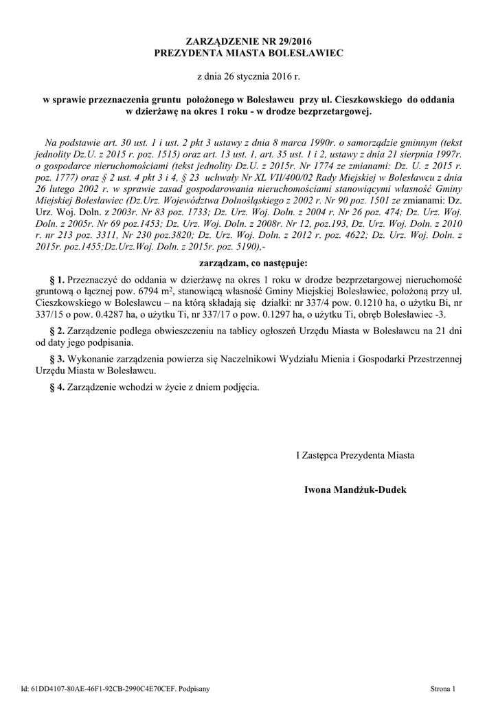 ZARZĄDZENIE NR 29/2016 PREZYDENTA MIASTA BOLESŁAWIEC z dnia 26 stycznia 2016 r. w sprawie przeznaczenia gruntu położonego w Bolesławcu przy ul. Cieszkowskiego do oddania w dzierżawę na okres 1 roku - w drodze bezprzetargowej. Na podstawie art. 30 ust. 1 i ust. 2 pkt 3 ustawy z dnia 8 marca 1990r. o samorządzie gminnym (tekst jednolity Dz.U. z 2015 r. poz. 1515) oraz art. 13 ust. 1, art. 35 ust. 1 i 2, ustawy z dnia 21 sierpnia 1997r. o gospodarce nieruchomościami (tekst jednolity Dz.U. z 2015r. Nr 1774 ze zmianami: Dz. U. z 2015 r. poz. 1777) oraz § 2 ust. 4 pkt 3 i 4, § 23 uchwały Nr XL VII/400/02 Rady Miejskiej w Bolesławcu z dnia 26 lutego 2002 r. w sprawie zasad gospodarowania nieruchomościami stanowiącymi własność Gminy Miejskiej Bolesławiec (Dz.Urz. Województwa Dolnośląskiego z 2002 r. Nr 90 poz. 1501 ze zmianami: Dz. Urz. Woj. Doln. z 2003r. Nr 83 poz. 1733; Dz. Urz. Woj. Doln. z 2004 r. Nr 26 poz. 474; Dz. Urz. Woj. Doln. z 2005r. Nr 69 poz.1453; Dz. Urz. Woj. Doln. z 2008r. Nr 12, poz.193, Dz. Urz. Woj. Doln. z 2010 r. nr 213 poz. 3311, Nr 230 poz.3820; Dz. Urz. Woj. Doln. z 2012 r. poz. 4622; Dz. Urz. Woj. Doln. z 2015r. poz.1455;Dz.Urz.Woj. Doln. z 2015r. poz. 5190),zarządzam, co następuje: § 1. Przeznaczyć do oddania w dzierżawę na okres 1 roku w drodze bezprzetargowej nieruchomość gruntową o łącznej pow. 6794 m2, stanowiącą własność Gminy Miejskiej Bolesławiec, położoną przy ul. Cieszkowskiego w Bolesławcu – na którą składają się działki: nr 337/4 pow. 0.1210 ha, o użytku Bi, nr 337/15 o pow. 0.4287 ha, o użytku Ti, nr 337/17 o pow. 0.1297 ha, o użytku Ti, obręb Bolesławiec -3. § 2. Zarządzenie podlega obwieszczeniu na tablicy ogłoszeń Urzędu Miasta w Bolesławcu na 21 dni od daty jego podpisania. § 3. Wykonanie zarządzenia powierza się Naczelnikowi Wydziału Mienia i Gospodarki Przestrzennej Urzędu Miasta w Bolesławcu. § 4. Zarządzenie wchodzi w życie z dniem podjęcia. I Zastępca Prezydenta Miasta Iwona Mandżuk-Dudek Id: 61DD4107-80AE-46F1-92CB-2990C4E70CEF. Podpisany Strona 1 Załącznik Nr 1 do Zarządzenia Nr 29/2016 Prezydenta Miasta Bolesławiec z dnia 26 stycznia 2016 r. WYKAZ - OBWIESZCZENIE nieruchomości gruntowej położonej w Bolesławcu przeznaczonej do oddania w dzierżawę na okres 1 roku – w drodze bezprzetargowej. Nieruchomość gruntową o łącznej pow. 0.6794 ha stanowiącą własność Gminy Miejskiej Bolesławiec, oznaczoną w ewidencji gruntów jako działki: nr 337/4 o pow. 0.1210 ha, o użytku Bi, Nr 337/15 o pow. 0.4287 ha, o użytku Ti, Nr 337/17 o pow. 0.1297 ha o użytku – Ti, obręb Bolesławiec - 3, KW JG1B/00015074/7, położone przy ul. Cieszkowskiego w Bolesławcu - przeznacza się do oddania w dzierżawę w drodze bezprzetargowej na okres 1 roku, począwszy od 02 stycznia 2016 r. – z przeznaczeniem pod lokalizację parkingu samochodowego ogólnodostępnego przy stacji paliw oraz na wjazd i wyjazd z niej na drogę publiczną - ul. Cieszkowskiego i Kościuszki, a także na teren zieleni urządzonej. W miejscowym planie zagospodarowania przestrzennego miasta Bolesławca przedmiotowe nieruchomości położone są na terenie obsługi komunikacji ( Symbol z planu B-KS1 ) i na terenie dróg publicznych (symbol z planu – A-KDgp1). Roczny czynsz dzierżawny za ww. grunt o pow. 6794 m2 ustala się na kwotę 24.694,08 zł,( w tym : działalność gosp. 4261 m2 x 0,37 zł x 12 m-cy + zieleń 2533 m2 x 0,19 zl x 12 m-cy) co łącznie z 23% podatkiem VAT wynosi - 30.373,72 zł (słownie: trzydzieści tysięcy trzysta siedemdziesiąt trzy i 72/100) – zgodnie z § 1 ust.1 pkt."g" i "k" Zarządzenia nr 442/2015 Prezydenta Miasta Bolesławiec z dnia 18 grudnia 2015 r. w sprawie ustalenia wysokości minimalnych stawek czynszu dzierżawnego za grunty stanowiące własność Gminy Miejskiej Bolesławiec. Czynsz płatny jest jednorazowo do 30 czerwca danego roku na konto Gminy Miejskiej Bolesławiec Nr Powszechna Kasa Oszczędności Bank Polski S.A. O/ Bolesławiec Nr 98 1020-2137 0000 9002 0046 4230 lub bezpośrednio w kasie PKO BP/O Bolesławiec w Urzędzie Miasta / Rynek 41 – Ratusz/. I Zastępca Prezydenta Miasta Iwona Mandżuk-Dudek Id: 61DD4107-80AE-46F1-92CB-2990C4E70CEF. Podpisany Strona 1 Załącznik Nr 2 do zarządzenia Prezydenta Miasta Bolesławiec nr ……/2016 z dnia …………………….. 2016r. Id: 61DD4107-80AE-46F1-92CB-2990C4E70CEF. Podpisany Strona 2 UZASADNIENIE Niniejsze zarządzenie wydaje się w celu umożliwienia wydzierżawienia działek Nr 337/4, 337/15, 337/17 o łącznej pow. 0.6794 ha, położonych przy ul. Cieszkowskiego w Bolesławcu, w trybie bezprzetargowym na okres 1 roku, z przeznaczeniem pod lokalizację parkingu samochodowego ogólnodostępnego przy stacji paliw oraz wjazd i wyjazd z niej na drogę publiczną - ul. Cieszkowskiego i Kościuszki + teren zieleni urządzonej - dla Dzierżawcy na jego wniosek. Za powyższy okres dzierżawy pobierany zostanie roczny czynsz dzierżawny zgodnie § 5 Zarządzenia nr 442/2015 Prezydenta Miasta Bolesławiec z dnia 18 grudnia 2015 r. w sprawie ustalenia wysokości minimalnych stawek czynszu dzierżawnego za grunty stanowiące własność Gminy Miejskiej Bolesławiec. JD/JD I Zastępca Prezydenta Miasta Iwona Mandżuk-Dudek Id: 61DD4107-80AE-46F1-92CB-2990C4E70CEF. Podpisany Strona 1