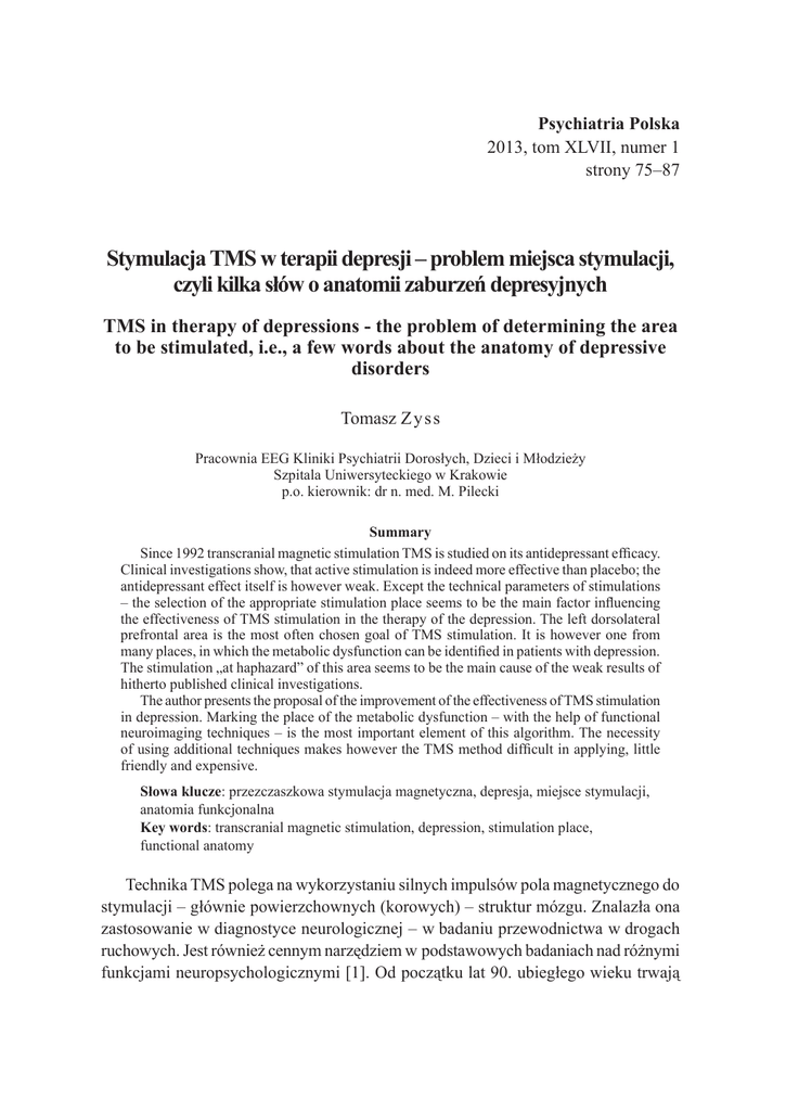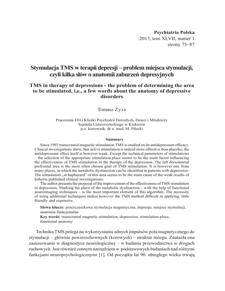 Psychiatria Polska 2013, tom XLVII, numer 1 strony 75–87 Stymulacja TMS w terapii depresji – problem miejsca stymulacji, czyli kilka słów o anatomii zaburzeń depresyjnych TMS in therapy of depressions - the problem of determining the area to be stimulated, i.e., a few words about the anatomy of depressive disorders Tomasz Zy s s Pracownia EEG Kliniki Psychiatrii Dorosłych, Dzieci i Młodzieży Szpitala Uniwersyteckiego w Krakowie p.o. kierownik: dr n. med. M. Pilecki Summary Since 1992 transcranial magnetic stimulation TMS is studied on its antidepressant efficacy. Clinical investigations show, that active stimulation is indeed more effective than placebo; the antidepressant effect itself is however weak. Except the technical parameters of stimulations – the selection of the appropriate stimulation place seems to be the main factor influencing the effectiveness of TMS stimulation in the therapy of the depression. The left dorsolateral prefrontal area is the most often chosen goal of TMS stimulation. It is however one from many places, in which the metabolic dysfunction can be identified in patients with depression. The stimulation „at haphazard” of this area seems to be the main cause of the weak results of hitherto published clinical investigations. The author presents the proposal of the improvement of the effectiveness of TMS stimulation in depression. Marking the place of the metabolic dysfunction – with the help of functional neuroimaging techniques – is the most important element of this algorithm. The necessity of using additional techniques makes however the TMS method difficult in applying, little friendly and expensive. Słowa klucze: przezczaszkowa stymulacja magnetyczna, depresja, miejsce stymulacji, anatomia funkcjonalna Key words: transcranial magnetic stimulation, depression, stimulation place, functional anatomy Technika TMS polega na wykorzystaniu silnych impulsów pola magnetycznego do stymulacji – głównie powierzchownych (korowych) – struktur mózgu. Znalazła ona zastosowanie w diagnostyce neurologicznej – w badaniu przewodnictwa w drogach ruchowych. Jest również cennym narzędziem w podstawowych badaniach nad różnymi funkcjami neuropsychologicznymi [1]. Od początku lat 90. ubiegłego wieku trwają 76 Tomasz Zyss również badania nad terapeutycznym działaniem stymulacji TMS – tak w schorzeniach neurologicznych (choroba Parkinsona, migrena itp.), jak i psychicznych (depresja, schizofrenia, mania, inne) [2, 3]. Badania nad przeciwdepresyjnym działaniem stymulacji magnetycznej TMS natrafiają na istotny problem metodologiczny, jakim jest miejsce stymulacji [4]. W przypadku wykorzystania stymulacji TMS w neurologii do badania motorycznych potencjałów wywołanych MEP – bądź też różnych cząstkowych funkcji poznawczych (układu wzroku, słuchu, ośrodków mowy) itp. – miejsce stymulacji jest dokładnie zdefiniowane. Jest nim zwykle pierwszorzędowa kora ruchowa, sensoryczna czy korowe ośrodki mowy. Pierwszorzędowa kora słuchowa i wzrokowa jest również celem stymulacji terapeutycznej w przypadku objawów wytwórczych – odpowiednio omamów słuchowych i wzrokowych. W przypadku badań nad padaczką często poddawaną stymulacji okolicą jest ognisko padaczkowe. Tymczasem brak jest pewności co tego, jaką okolicę powinno się poddać stymulacji TMS, aby uzyskać (jak najlepszy) efekt przeciwdepresyjny. Rozwiązanie tego problemu wydaje się mieć podstawowe znaczenie dla opracowania standardów wykorzystania TMS w terapii depresji. Znalezienie prawidłowej odpowiedzi na pytanie o optymalne miejsce stymulacji jest trudne. Z jednej strony pozwoliłoby to na zidentyfikowanie anatomicznego substratu zaburzeń depresyjnych, z drugiej jednak – wiadomo, iż kontrola nad nastrojem i emocjami nie jest realizowana przez jedną strukturę ośrodkowego układu nerwowego. Istnieje szereg okolic o różnym stopniu ważności, które uczestniczą w regulacji poszczególnych komponentów sfery emocjonalnej i których dysfunkcja może być odpowiedzialna za ujawnienie się objawów depresji [5]. Oczywiście w poniższych rozważaniach nie chodzi o okolice mózgu, w których identyfikowane są zmiany strukturalne (choć często zmianom tym towarzyszą zmiany funkcjonalne). Na przestrzeni dekad przyżyciowych badań neuroobrazowych i pośmiertnych badań neuropatologicznych udało się zidentyfikować szereg zmian strukturalnych mogących występować u pacjentów z zaburzeniami afektywnymi [6, 7]. Zalicza się do nich: poszerzenie komór bocznych, poszerzenie szczelin korowych, poszerzenie komory III, zwiększenie gęstości struktur podkorowych, zmniejszenie objętości w okolicy struktur czołowych i przedczołowych, zmniejszenie objętości móżdżku, zmniejszenie objętości jąder podstawy itp. Zaprezentowanie dotychczasowych badań dotyczących tych zmian oczywiście przekracza możliwości i zakres niniejszego opracowania. Ich dokładne zestawienie można znaleźć w pracach monograficznych [8, 9]. Waga zmian strukturalnych (głównie o charakterze zanikowym) w etiopatogenezie zaburzeń afektywnych wydaje się niejednoznaczna i niepewna; ponadto poddawane jest krytycznej ocenie ich realne znaczenie patogenetyczne [9]. Poza tym nie wydaje się możliwe, aby jakiekolwiek metody terapeutyczne – czy to chemiczne (farmakoterapia) czy też fizykalne (EW, TMS, inne) – były w stanie wpływać korygująco na stwierdzane zmiany strukturalne (tu: zmniejszyć szerokość komór bocznych, zmniejszyć szerokość szczelin itd.). Znacznie bardziej obiecujące i ciekawsze w zakresie zrozumienia zarówno etiopatologii zaburzeń afektywnych, jak i możliwości oddziaływań terapeutycznych są badania Stymulacja TMS w terapii depresji 77 nad zmianami funkcjonalnymi (SPECT, PET, fMRI), tj. aktywnością metaboliczną, regionalnym przepływem krwi itp. [10–14]. W literaturze polskiej zagadnienia te omawiają m.in. Jaracz [15] czy Wichowicz [16
