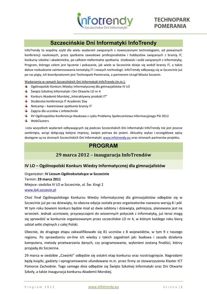 Szczecińskie Dni Informatyki InfoTrendy InfoTrendy to wspólny szyld dla wielu wydarzeń związanych z nowoczesnymi technologiami, od poważnych konferencji naukowych, przez spotkania zawodowe profesjonalistów i hobbystów związanych z branżą IT, konkursy szkolne i akademickie, po całkiem nieformalne spotkania środowisk i osób związanych z informatyką. Program, którego celem jest łączenie i pokazanie, jak wiele w Szczecinie dzieje się wokół branży IT, a także dalsze rozbudzanie zainteresowania tematyką IT i nowych technologii. InfoTrendy odbywają się w Szczecinie już po raz piąty, ich koordynatorem jest Technopark Pomerania, a partnerem Urząd Miasta Szczecin. Wydarzenia w ramach Szczecińskich Dni Informatyki InfoTrendy (m.in.): Ogólnopolski Konkurs Wiedzy Informatycznej dla gimnazjalistów IV LO Święto Szkolnej Informatyki i Dni Otwarte LO nr 4 Konkurs Akademii Morskiej „Interaktywny produkt IT” Studencka konferencja IT Academic Day Netcamp – kwietniowe spotkanie branży IT Zajęcia dla uczniów z infotechniki XV Ogólnopolska Konferencja Naukowa z cyklu Problemy Społeczeństwa Informacyjnego PSI 2012 WebClusters Lista wszystkich wydarzeń odbywających się podczas Szczecińskich Dni Informatyki InfoTrendy nie jest jeszcze zamknięta, wciąż dołączają kolejne imprezy, święto potrwa do jesieni. Aktualny wykaz i szczegółowe opisy dostępne są na stronach Szczecińskich Dni Informatyki: www.infotrendy.eu oraz stronach partnerów projektu. PROGRAM 29 marca 2012 – inauguracja InfoTrendów IV LO – Ogólnopolski Konkurs Wiedzy Informatycznej dla gimnazjalistów Organizator: IV Liceum Ogólnokształcące w Szczecinie Termin: 29 marca 2011 Miejsce: siedziba IV LO w Szczecinie, ul. Św. Kingi 2 www.lo4.szczecin.pl Choć finał Ogólnopolskiego Konkursu Wiedzy Informatycznej dla gimnazjalistów odbędzie się w Szczecinie już po raz dziewiąty, to obecna edycja została przez organizatorów nazwana wersją 8 i pół. W tym roku bowiem konkurs będzie miał aż dwie odsłony i dziewiąta, pełniejsza, planowana jest na wrzesień. Jednak uczniowie, przyzwyczajeni do wiosennych potyczek z informatyką, już teraz mogą się sprawdzić w konkursie organizowanym przez szczecińskie LO nr 4, w którym każdego roku biorą udział setki chętnych z całej Polski. Obecnie, do drugiego etapu zakwalifikowało się 81 uczniów z 8 województw, w tym 9 z naszego regionu. Po sprawdzeniu on-line ich wiedzy z takich zagadnień jak: budowa i zasada działania komputera, metody przetwarzania danych, czy programowanie, wyłonieni zostaną finaliści, którzy przyjadą do Szczecina. 29 marca w siedzibie „Czwórki” odbędzie się ostatni etap konkursu oraz rozstrzygnięcie. Nagrodami będą książki, gadżety i oprogramowanie ufundowane m.in. przez firmy ze stowarzyszenia Klaster ICT Pomorze Zachodnie. Tego samego dnia odbędzie się Święto Szkolnej Informatyki oraz Dni Otwarte Szkoły, a także inauguracja konkursu Akademii Morskiej. Program 2012 www.infotrendy.eu S t r o n a |1 IV LO – Święto Szkolnej Informatyki i Dni Otwarte Szkoły Organizator: IV Liceum Ogólnokształcące w Szczecinie Termin: 29 marca 2011 Miejsce: siedziba IV LO w Szczecinie, ul. Św. Kingi 2 www.lo4.szczecin.pl 29 marca w LO nr 4 zaprasza wszystkich gimnazjalistów na obchody Święta Szkolnej Informatyki połączonego z Dniami Otwartymi Szkoły. Organizowane przez „Czwórkę” wydarzenie każdego roku przyciąga ponad 600 gimnazjalistów, rodziców i nauczycieli ze Szczecina i okolicznych miejscowości. Podczas tegorocznych Dni Otwartych zaplanowano szereg atrakcji, także z zamysłem, aby uczniowie mogli przekonać się na miejscu, jak można wykorzystywać teoretyczną wiedzę w praktyce. W programie zaplanowano m.in. spotkania tematyczne: • doświadczenia z fizyki na klockach Lego • programowanie robotów • nauka języka obcego z użyciem tabletów • aspiryna i leki na zgagę - lekcja chemii na tablicy interaktywnej • quizy językowe • zajęcia z poligrafii prowadzone przez WI ZUT • symulator sztucznej inteligencji • wirtualna jazda samochodem w różnych warunkach • spotkanie autorskie z Ingą Iwasiów – Zależy nam, aby Święto Informatyki było jak najbardziej atrakcyjne, tak by zachęciło uczniów do spojrzenia na komputer z różnych stron i pozwoliło nam także wyłowić informatyczne talenty – mówi Błażej Gruszczyński z IV LO, koordynator wydarzenia. Tego samego dnia odbędzie się także inauguracja pierwszej edycji konkursu „Interaktywny produkt IT”, organizowanego przez Akademię Morską w Szczecinie. Konkurs Akademii Morskiej „Interaktywny produkt IT” Organizator: Akademia Morska w Szczecinie Miejsce: siedziba IV LO w Szczecinie, ul. Św. Kingi 2 http://informatyka.am.szczecin.pl/ipit/o-konkursie 29 marca – w ramach Święta Informatyki w IV LO – odbędzie się inauguracja pierwszej edycji konkursu „Interaktywny produkt IT”, organizowanego przez Akademię Morską w Szczecinie. Konkurs skierowany jest do uczniów szkół ponadgimnazjalnych z całego kraju, a jego celem jest popularyzacja branży IT i zachęcenie młodzieży do rozwoju i kształcenia w kierunku zawodów związanych z tą specjalnością. Osoby uczestniczące w konkursie będą miały za zadanie opracować interaktywny produkt z wykorzystaniem narzędzi IT, np. aplikację, animację, stronę www, film multimedialny. Szczegóły dotyczące konkursu już wkrótce na stronie: http://informatyka.am.szczecin.pl/ipit/o-konkursie. Program 2012 www.infotrendy.eu S t r o n a |2 kwiecień 2012 Studencka konferencja IT Academic Day Organizator: Koło naukowe Grupa .NET Termin: 17 kwietnia 2012 Miejsce: Wydział Informatyki ZUT, ul. Żołnierska 49 www.grupazut.studentlive.pl IT Academic Day to cykl konferencji informatycznych organizowany na uczelniach w całej Polsce przez studentów z Grup „.Net” i „IT”. Udział w konferencjach to doskonały sposób na zdoby