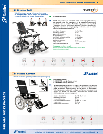 WÓZKI INWALIDZKIE RĘCZNE PODSTAWOWE Ormesa Trolli Wózek inwalidzki ręczny, składany, aluminiowy, do transportu na 4 małych kołach (typ parasolka) wersja dla dzieci oraz wersja dla dorosłych DOFINANSOWANIE: Trolli to mały, wózek typu parasolka. Został on tak zaprojektowany aby po złożeniu mógł być przewożony z w bagażniku samochodu, samolocie czy w windzie. Podnóżki regulowane na wysokoSć i odchylane na boki umożliwiają wjazd do ciasnych pomieszczeń. Tapicerka wykonana z oddychającego materiału. Jest to wózek z rodzaju wózków transportowych! szerokość siedziska wysokość oparcia głębokość siedziska długość podudzi szerokość całkowita wózka długość całkowita wysokość całkowita waga wózka maksymalne obciążenie 40, 43, 46 cm 46 cm 43 cm 37-49 cm 54, 57, 60 cm 94-104 cm 94 cm 11,5/11,9/12,2 kg 110 kg Występuje również w wersji: Wózek inwalidzki specjalny stabilizujący plecy i głowę, dla dzieci lub dla dorosłych 40, 43, 46 46 43 54, 57, 60 94-104 94 11,5/11,9/12,2 110 cm cm cm cm cm cm kg kg Classic Komfort Wózek inwalidzki specjalny stabilizujący plecy i głowę PEŁNIA MOŻLIWOŚCI DOFINANSOWANIE: P.130.00 NFZ - wersja dla dorosłych P.131.01 NFZ - wersja dla dzieci Wózek składany krzyżakowo z możliwoScią odchylenia oparcia do 90 stopni. Posiada zdejmowane podnóżki z wySciełanym podparciem łydek, z regulacją kąta nachylenia. Boczki wózka są wyjmowane. Wózek przeznaczony dla osób u których jest konieczna częsta zmiana pozycji od leżącej do siedzącej, wymagających indywidualnej stabilizacji całego tułowia wraz z głową. szerokość siedziska głębokosć siedziska wysokość oparcia szerokość całkowita wózka waga wózka maksymalne obciążenie 35, 40, 45, 50 cm 40 cm 57 cm 60, 65, 70, 75 cm 25,5 kg 125 kg 35, 40, 45, 50 40 57 60, 65, 70, 75 25,5 125 cm cm cm cm kg kg ul. Duńska 3/5 91-204 Łódź tel. (042) 214 29 11 [email protected] www.mobilex.pl