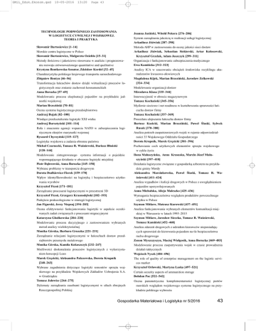 GMiL_Eduk.Ekonom.qxd 10-05-2016 13:20 Page 43 TECHNOLOGIE PODWÓJNEGO ZASTOSOWANIA W LOGISTYCE CYWILNEJ I WOJSKOWEJ. TEORIA I PRAKTYKA Joanna Jasiński, Witold Pokora [276–286] System zarządzania jakością w realizacji usługi logistycznej Arkadiusz Jóźwiak [287–298] Sławomir Bartosiewicz [1–14] Metoda AHP w zastosowaniu do oceny jakości sieci dostaw Arkadiusz Jóźwiak, Sebastian Siekierski, Artur Kołosowski, Morskie centra logistyczne w Polsce Sławomir Bartosiewicz, Małgorzta Oziebło [15–31] Krzysztof Grzelak, Adam Juszczyk [299–311] Metody ilościowe i jakościowe stosowane w analizie i prognozowaniu rozwoju zrównoważonego quantitative and qualitative Krystyna Bentkowska-Senator, Zdzisław Kordel [32–45] Charakterystyka polskiego krajowego transportu samochodowego Zbigniew Bentyn [46–56] Transformacja łańcuchów dostaw dzięki wirtualizacji procesów logistycznych oraz zmianie zachowań konsumenckich Anna Borucka [57–69] Modelowanie procesu eksploatacji pojazdów na przykładzie jednostki wojskowej Marian Brzeziński [70–81] Organizacja i funkcjonowanie zabezpieczenia medycznego Ewa Kamińska [312–323] Analizy ICA w szacowaniu obciążeń środowiska recyklingu akumulatorów kwasowo-ołowiowych Magdalena Kijek, Marian Brzeziński, Jarosław Zelkowski [324–334] Modelowanie organizacji dostaw Mirosława Klasa [335–344] Innowacyjność w obrocie magazynowym Tomasz Kochański [345–356] Ocena systemu logistycznego przedsiębiorstwa Andrzej Bujak [82–100] Myślenie sieciowe i net readiness w kształtowaniu sprawności łańcucha dostaw firmy Tomasz Kochański [357–369] Wiodące przekształcenia logistyki XXI wieku Andrzej Bursztyński [101–114] Procedura ulepszania łańcucha dostaw firmy Bartosz Kozicki, Marian Brzeziński, Paweł Ślaski, Sylwek Rola i znaczenie agencji wsparcia NATO w zabezpieczeniu logistycznym okrętów marynarki wojennej Ryszard Chyrzyński [115–127] Logistyka wojskowa a zadania obronne państwa Michał Czarnecki, Tomasz R. Waśniewski, Dariusz Błoński [128–144] Modelowanie zintegrowanego systemu informacji o pojeździe wspomagającego działania w obszarze logistyki miejskiej Piotr Dąbrowski, Anna Borucka [145–158] Wybrane problemy w transporcie drogowym Dorota Dudkiewicz-Fierek [159–170] Wpływ identyfikowalności na logistykę i bezpieczeństwo użytkowania wyrobów Krzysztof Ficoń [171–181] Zarządzanie procesami logistycznymi w przestrzeni 3D Krzysztof Ficoń, Grzegorz Krasnodębski [182–193] Analiza potrzeb zaopatrzeniowych wojsk w rejonie odpowiedzialności 33 Wojskowego Oddziału Gospodarczego Dorota Krupnik, Marek Gręzicki [381–396] Pozbawianie cech użytkowych elementów sprzętu wojskowego w cyklu życia Ilona Małuszyńska, Anna Krasuska, Marcin Józef Małuszyński [397–410] Działania logistyczne związane z gospodarką azbestem na przykładzie gminy Mordy Aleksandra Marcinkowska, Paweł Ślaski, Tomasz R. Waśniewski [411–424] Analiza wypadków i kolizji drogowych w Polsce z uwzględnieniem pojazdów uprzywilejowanych Anna Michalska, Alicja Maleszko [425–436] Wymagania bezpieczeństwa względem produktów powszechnego użytku w Polsce Szymon Mitkow, Mateusz Kurowski [437–451] Podejście prakseologiczne w strategii logistycznej Jan Figurski, Jerzy Niepsuj [194–203] Ocena efektywności funkcjonowania logistyki w aspekcie oczekiwanych zadań związanych z procesami migracyjnymi Katarzyna Głodkowska [204–220] Modelowanie procesu decyzyjnego z zastosowaniem wybranych metod analizy wielokryterialnej Monika Górska, Barbara Gruszka [221–231] Zarządzanie relacjami logistycznymi w łańcuchach dostaw przedsiębiorstw przemysłu metalowego Monika Górska, Kamila Kokoszczyk [232–247] Możliwości doskonalenia procesów logistycznych z wykorzystaniem koncepcji Lean Marek Gręzicki, Aleksandra Palczewska, Dorota Krupnik [248–263] Wybrane zagadnienia dotyczące logistyki remontów sprzętu wojskowego na przykładzie Wojskowych Zakładów Uzbrojenia S.A. w Grudziądzu Tomasz Jałowiec [264–275] Dylematy zarządzania zasobami logistycznymi w siłach zbrojnych Rzeczypospolitej Polskiej Rusak [370–380] Analiza funkcjonowania wybranych elementów komunikacji miejskiej w Warszawie w latach 1995–2015 Szymon Mitkow, Jarosław Sieczka, Tomasz R. Waśniewski, Tomasz Kamiński [452–468] Analiza zdarzeń drogowych z udziałem kierowców nieposiadających uprawnień do kierowania pojazdem na tle bezpieczeństwa ruchu drogowego Zenon Myszczyszyn, Maciej Wielgosik, Anna Borucka [469–483] Modelowanie procesu zaopatrywania wojsk w czasie prowadzenia działań taktycznych Wojciech Nyszk [484–496] The role of quality of enterprise management on the logistic services market Krzysztof Orłowski, Martyna Łaska [497–521] Certain security aspects of ammunition storage Bohdan Pac [522–542] Ocena parametryczna komplementarności logistycznej portów morskich względem wojskowego systemu logistycznego na przykładzie polskiego wybrzeża Gospodarka Materiałowa i Logistyka nr 5/2016 43 GMiL_Eduk.Ekonom.qxd 10-05-2016 13:20 Page 44 Aleksandra Palczewska, Dorota Krupnik, Marek Gręzicki [543–560] Wybrane zagadnienia dotyczące transportu materiałów niebezpiecznych (ADR) na przykładzie Wojskowych Zakładów Uzbrojenia S.A. w Grudziądzu Mieczysław Pawlisiak [561–573] Monika Szyłkowska [716–727] Cyfrowe wyłudzenia i fałszerstwa jako kluczowe zagrożenia dla przedsiębiorstw-ogniw łańcucha dostaw Krzysztof Szymański [728–739] Logistics security as a specific category of security Mieczysław Pawlisiak [574–583] Zastosowania logistyki wojskowej i cywilnej dla wsparcia sił sojuszniczych, wzmocnienia NATO w ramach realizacji przedsięwzięć przez państwo gospodarza na terytorium RP–HNS Andrzej Szymonik [740–751] The planes of security in logistics Krystyna Pieniak-Lendzion, Adam Marcysiak [584–594] Bezpieczeństwo gospodarki magazynowej Monika Ucińska, Ewa Odachowska [752