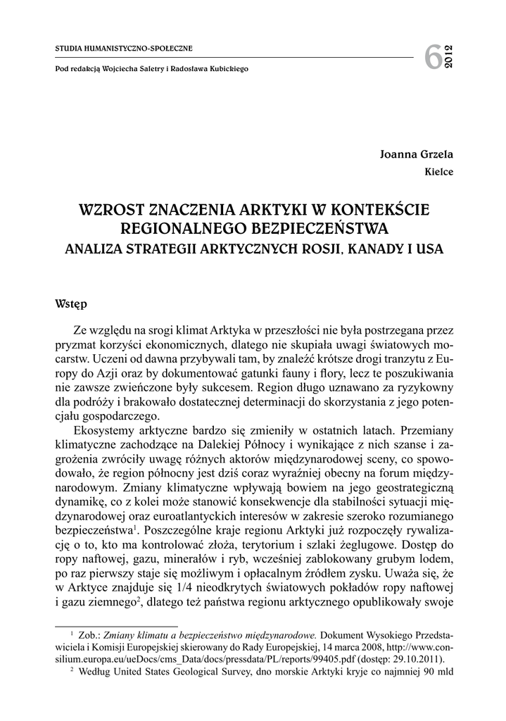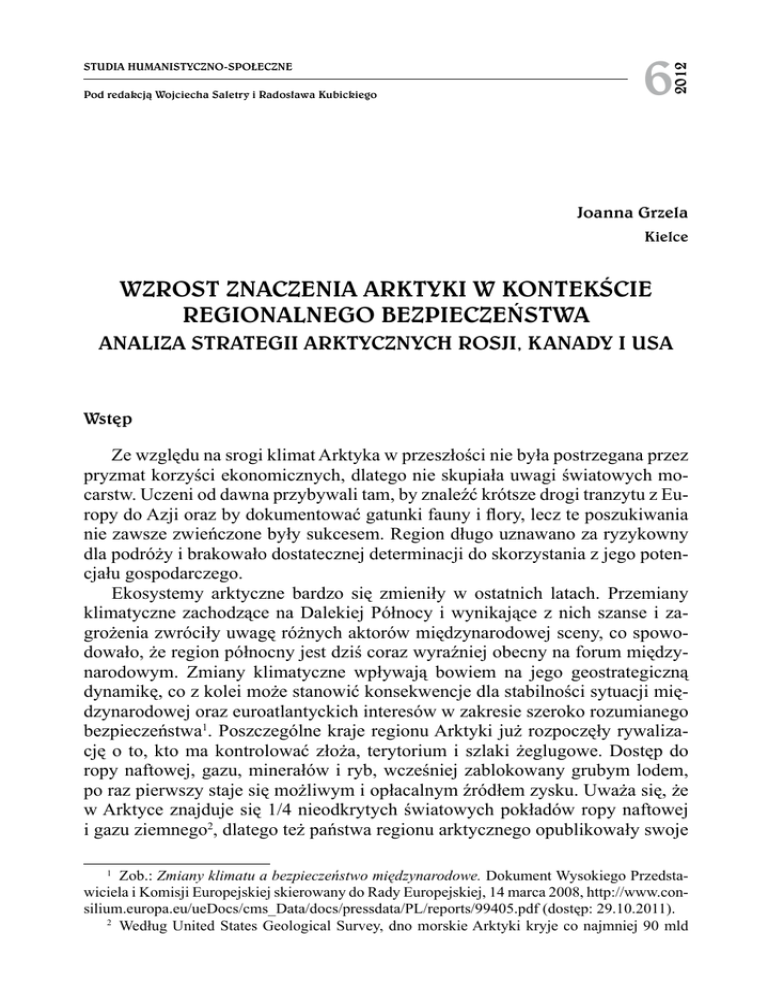 Pod redakcją Wojciecha Saletry i Radosława Kubickiego 6 2012 Studia Humanistyczno-Społeczne Joanna Grzela Kielce Wzrost znaczenia Arktyki w kontekście regionalnego bezpieczeństwa Analiza strategii arktycznych Rosji, Kanady i USA Wstęp Ze względu na srogi klimat Arktyka w przeszłości nie była postrzegana przez pryzmat korzyści ekonomicznych, dlatego nie skupiała uwagi światowych mocarstw. Uczeni od dawna przybywali tam, by znaleźć krótsze drogi tranzytu z Europy do Azji oraz by dokumentować gatunki fauny i flory, lecz te poszukiwania nie zawsze zwieńczone były sukcesem. Region długo uznawano za ryzykowny dla podróży i brakowało dostatecznej determinacji do skorzystania z jego potencjału gospodarczego. Ekosystemy arktyczne bardzo się zmieniły w ostatnich latach. Przemiany klimatyczne zachodzące na Dalekiej Północy i wynikające z nich szanse i zagrożenia zwróciły uwagę różnych aktorów międzynarodowej sceny, co spowodowało, że region północny jest dziś coraz wyraźniej obecny na forum międzynarodowym. Zmiany klimatyczne wpływają bowiem na jego geostrategiczną dynamikę, co z kolei może stanowić konsekwencje dla stabilności sytuacji międzynarodowej oraz euroatlantyckich interesów w zakresie szeroko rozumianego bezpieczeństwa1. Poszczególne kraje regionu Arktyki już rozpoczęły rywalizację o to, kto ma kontrolować złoża, terytorium i szlaki żeglugowe. Dostęp do ropy naftowej, gazu, minerałów i ryb, wcześniej zablokowany grubym lodem, po raz pierwszy staje się możliwym i opłacalnym źródłem zysku. Uważa się, że w Arktyce znajduje się 1/4 nieodkrytych światowych pokładów ropy naftowej i gazu ziemnego2, dlatego też państwa regionu arktycznego opublikowały swoje Zob.: Zmiany klimatu a bezpieczeństwo międzynarodowe. Dokument Wysokiego Przedstawiciela i Komisji Europejskiej skierowany do Rady Europejskiej, 14 marca 2008, http://www.consilium.europa.eu/ueDocs/cms_Data/docs/pressdata/PL/reports/99405.pdf (dostęp: 29.10.2011). 2 Według United States Geological Survey, dno morskie Arktyki kryje co najmniej 90 mld 1 70 Joanna Grzela strategie w oparciu o znaczenie i możliwe korzyści ekonomiczne, wynikające z eksploatacji złóż spoczywających na dnie Arktyki3. Przebieg sytuacji na Dalekiej Północy obserwują kraje z całego świata. Na temat Arktyki wypowiadają się przede wszystkim Rosja i Kanada. Częściowe roszczenia wysuwają również USA4, Norwegia i Dania5. Wpływ przeobrażeń Arktyki na jej geopolityczne znaczenie Dokonujące się w Arktyce przemiany stanowią wyzwanie w wielu obszarach: społecznym, gospodarczym, bezpieczeństwa i ochrony środowiska. Przede wszystkim ścierają się tu interesy gospodarcze (dostęp do prawdopodobnie największych na świecie złóż ropy i gazu oraz metali szlachetnych) i ekologiczne (ochrona środowiska Arktyki), polityczne (starania Rosji zmierzające do przywrócenia statusu supermocarstwa) i militarne (wzmożone patrole wojskowe Rosji czy Kanady dla podkreślenia obecności w Arktyce). Podstawową kwestią do rozstrzygnięcia pozostaje sposób, w jaki zostaną podzielone zasoby naturalne Arktyki. Kraje arktyczne mają suwerenne prawa do poszukiwania i eksploatacji żywych i nieożywionych zasobów morskich w ich wyłącznych strefach ekonobaryłek ropy naftowej i około 1,67 bilionów m3 gazu ziemnego. Obfite są również złoża klatratu metanu. Więcej zob.: 90 Billion Barrels of Oil and 1,670 Trillion Cubic Feet of Natural Gas Assessed in the Arctic, http://www.usgs.gov/newsroom/article.asp?ID=1980 (dostęp: 07.11.2011); por.: T. Kijewski, Rywalizacja o surowce energetyczne w Arktyce, „Bezpieczeństwo Narodowe” 2009, nr 9–10; L. Lindholt, S. Glomsrød, The Role of the Arctic in Future Global Petroleum Supply, Discussion Papers No. 645, February 2011 Statistics Norway, Research Departament, http:// www.ssb.no/publikasjoner/DP/pdf/dp645.pdf (dostęp: 14.11.2011). 3 K. Kubiak, Interesy i spory państw w Arktyce, Wrocław 2009; por.: Arctic strategy documents, http://www.geopoliticsnorth.org/index.php?option=com_content&view=article&id=84 (dostęp: 19.11.2011); B. Beary, Race for the Arctic, „Global Researcher” 2008, August, Vol. 2, No. 8, s. 213–242; L. Heininen, Arctic Strategies, 15.02.2011r., http://www.nrf.is/arctic-strategies (dostęp 30.11.2011). 4 Stany Zjednoczone i Rosja w 1990 r. podpisały umowę w sprawie spornych obszarów na Morzu Beringa. Senat USA ratyfikował pakt następnego roku, ale rosyjska Duma jeszcze nie zatwierdziła porozumienia; U.S. Strategic Interests in the Arctic an Assessment of Current Challenges and New Opportunities for Cooperation. A Report of the CSIS Europe Program, http://csis. org/publication/us-strategic-interests-arctic (dostęp: 04.12.2011). 5 Kanada prowadzi spór z Danią o Wyspę Hansa, a z USA o przebieg granicy morskiej na Morzu Beauforta, na północ od Alaski – obszar ten jest uważany za bogaty w ropę i gaz ziemny. Spór dotyczy też tak zwanego Przejścia Północno-Zachodniego – szlaku wodnego, łączącego Atlantyk z Pacyfikiem; L. Łukaszuk, Współpraca i spory międzynarodowe na morzach. Wybrane zagadnienia prawa, polityki morskiej i ochrony środowiska, Warszawa 2009, s. 108–110, 187 i n.; por.: Wojna na biegunie, http://www.focus.pl/cywilizacja/zobacz/publikacje/wojna-na-biegunie/ nc/1/ (dostęp: 22.11.2011); por.: N. Teeple, A Brief History of Instrusions into Canadian Arctic, http://www.army.forces.gc.ca/caj/documents/vol_12/iss_3/CAJ_Vol12.3_09_e.pdf (dostęp: 23.11.2011); O. Ch. von Roeder, „Cold War” at the North Pole, AARMS – Academic and Applied Research in Military Science 2010, Vol. 9, No. 2, s. 361–375. Wzrost znaczenia Arktyki w kontekście regionalnego bezpieczeństwa 71 micznych. Państwa arktyczne prowadzą intensywne i kosztowne badania szelfu kontynentalnego, gdyż Konwencja o prawie morza z 1982 r. (UNCLOS) pozwala na rozszerzenie wód terytorialnych i strefy eko
