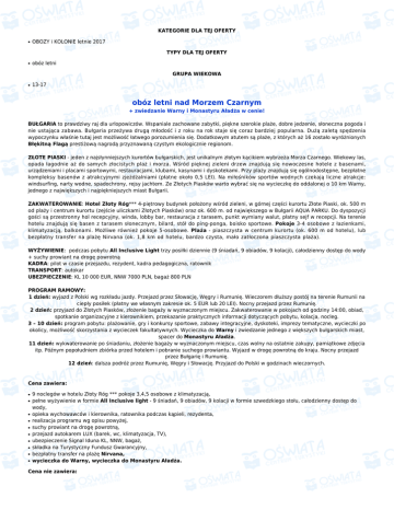 KATEGORIE DLA TEJ OFERTY ● OBOZY i KOLONIE letnie 2017 TYPY DLA TEJ OFERTY ● obóz letni GRUPA WIEKOWA ● 13-17 obóz letni nad Morzem Czarnym + zwiedzanie Warny i Monastyru Aładża w cenie! BUŁGARIA to prawdziwy raj dla urlopowiczów. Wspaniale zachowane zabytki, piękne szerokie plaże, dobre jedzenie, słoneczna pogoda i nie ustająca zabawa. Bułgaria przeżywa drugą młodość i z roku na rok staje się coraz bardziej popularna. Dużą zaletą spędzenia wypoczynku właśnie tutaj jest możliwość łatwego porozumienia się. Dodatkowym atutem są plaże, z których aż 16 zostało wyróżnionych Błękitną Flagą prestiżową nagrodą przyznawaną czystym ekologicznie regionom. ZŁOTE PIASKI - jeden z najsłynniejszych kurortów bułgarskich, jest unikalnym złotym kącikiem wybrzeża Morza Czarnego. Wiekowy las, opada łagodnie aż do samych złocistych plaż i morza. Wśród pięknej zieleni drzew znajdują się nowoczesne hotele z basenami, urządzeniami i placami sportowymi, restauracjami, klubami, kasynami i dyskotekami. Przy plaży znajdują się ogólnodostępne, bezpłatne kompleksy basenów z atrakcyjnymi zjeżdżalniami (płatne około 0,5 LEI). Na miłośników sportów wodnych czekają liczne atrakcje: windsurfing, narty wodne, spadochrony, rejsy jachtem. Ze Złotych Piasków warto wybrać się na wycieczkę do oddalonej o 10 km Warny, jednego z największych i najpiękniejszych miast Bułgarii. ZAKWATEROWANIE: Hotel Złoty Róg*** 4-piętrowy budynek położony wśród zieleni, w górnej części kurortu Złote Piaski, ok. 500 m od plaży i centrum kurortu (zejście uliczkami Złotych Piasków) oraz ok. 600 m. od największego w Bułgarii AQUA PARKU. Do dyspozycji gości są przestronny hol recepcyjny, winda, lobby bar, restauracja z tarasem, punkt wymiany walut, płatny sejf w recepcji. Na terenie hotelu znajdują się basen z tarasem słonecznym, bilard, stół do ping-ponga, boisko sportowe. Pokoje 3-4 osobowe z łazienkami, klimatyzacją, balkonami. Możliwe również pokoje 5-osobowe. Plaża - piaszczysta w centrum kurortu (ok. 600 m od hotelu), lub bezpłatny transfer na plażę Nirvana (ok. 1,8 km od hotelu, bardzo czysta, mało zatłoczona piaszczysta plaża). WYŻYWIENIE: podczas pobytu All Inclusive Light trzy posiłki dziennie (9 śniadań, 9 obiadów, 9 kolacji), całodzienny dostęp do wody + suchy prowiant na drogę powrotną KADRA: pilot w czasie przejazdu, rezydent, kadra pedagogiczna, ratownik TRANSPORT: autokar UBEZPIECZENIE: KL 10 000 EUR, NNW 7000 PLN, bagaż 800 PLN PROGRAM RAMOWY: 1 dzień: wyjazd z Polski wg rozkładu jazdy. Przejazd przez Słowację, Węgry i Rumunię. Wieczorem dłuższy postój na terenie Rumunii na ciepły posiłek (płatny we własnym zakresie ok. 5 EUR lub 20 LEI). Nocny przejazd przez Rumunię. 2 dzień: przyjazd do Złotych Piasków, złożenie bagaży w wyznaczonym miejscu. Zakwaterowanie w pokojach od godziny 14:00, obiad, spotkanie organizacyjne z kierownikiem, przekazanie praktycznych informacji dotyczących pobytu, kolacja, nocleg. 3 – 10 dzień: program pobytu: plażowanie, gry i konkursy sportowe, zabawy integracyjne, dyskoteki, imprezy tematyczne, wycieczki po okolicy, możliwość skorzystania z wycieczek fakultatywnych. Wycieczka do Warny i zwiedzanie jednego z większych bułgarskich miast, spacer do Monastyru Aładża. 11 dzień: wykwaterowanie po śniadaniu, złożenie bagaży w wyznaczonym miejscu, czas wolny na ostatnie zakupy, pamiątkowe zdjęcia itp. Późnym popołudniem zbiórka przed hotelem i pobranie suchego prowiantu. Wyjazd w drogę powrotną do kraju. Nocny przejazd przez Bułgarię i Rumunię. 12 dzień: dalsza podróż przez Rumunię, Węgry i Słowację. Przyjazd do Polski w godzinach wieczornych. Cena zawiera: ● ● ● ● ● ● ● ● ● ● 9 noclegów w hotelu Złoty Róg *** pokoje 3,4,5 osobowe z klimatyzacją, pełne wyżywienie w formie All Inclusive light - 9 śniadań, 9 obiadów, 9 kolacji w formie szwedzkiego stołu, całodzienny dostęp do wody, opieka wychowawców i kierownika, ratownika podczas kąpieli, rezydenta, realizacja programu wg opisu powyżej, suchy prowiant na drogę powrotną, przejazd autokarem LUX (barek, wc, klimatyzacja, TV), ubezpieczenie Signal Iduna KL, NNW, bagaż, składka na Turystyczny Fundusz Gwarancyjny, bezpłatny transfer na plażę Nirvana, wycieczka do Warny, wycieczka do Monastyru Aładża. Cena nie zawiera: ● ● ● ● obowiązkowej kaucji zwrotnej w wysokości 20 EUR pobieranej w dniu przyjazdu do hotelu na poczet ewentualnych szkód wyrządzonych przez uczestnika obozu w obiekcie (kaucja zwracana w dniu wyjazdu po sprawdzeniu pokoi), biletów wstępu na dyskoteki ok. 5 EUR/ os (wstęp od 16 lat), wycieczek fakultatywnych, świadczeń nie wymienionych w ofercie. FAKULTATYWNIE: Neseber ok. 23 EUR, Bałczyk i Przylądek Kaliakra (z wieczorkiem) ok. 30 EUR, Istambuł (1 dzień) ok. 60 EUR + 11 EUR (wiza), rejs statkiem ok. 20 EUR, park wodny Aquapolis ok. 15 EUR, Zatoczki Przylądka Kaliakra ok. 15 EUR, dyskoteki ok. 4 EUR. WAŻNE INFORMACJE: ● ● ● ● ● ● ● ● ● ● obowiązkowa dopłata dla uczestników powyżej 18 roku życia - 150 PLN proponujemy zabrać z sobą ok. 100 EUR kieszonkowego na własne potrzeby - pieniądze można zdeponować u wychowawców prosimy o zabranie karty kolonijno - obozowej z nr PESEL, dowodu osobistego lub paszportu, ponadto odpowiedniej odzieży i obuwia (obuwie sportowe i obuwie do wędrówek górskich), kostiumu kąpielowego, klapek, nakrycia głowy, kremu z filtrem do opalania, okularów przeciwsłonecznych, przyborów higienicznych, dwóch ręczników, małego plecaka, ochrony przeciwdeszczowej bagaż prosimy zapakować do miękkich toreb - wykluczone twarde walizy. Ilość bagażu ograniczona! (bagaż podręczny i jedna torba). Duże, twarde walizy zajmują przestrzeń w pokojach. prosimy o zaopatrzenie uczestników w podstawowe leki (przeziębienie, ból gardła, uczulenia, śr