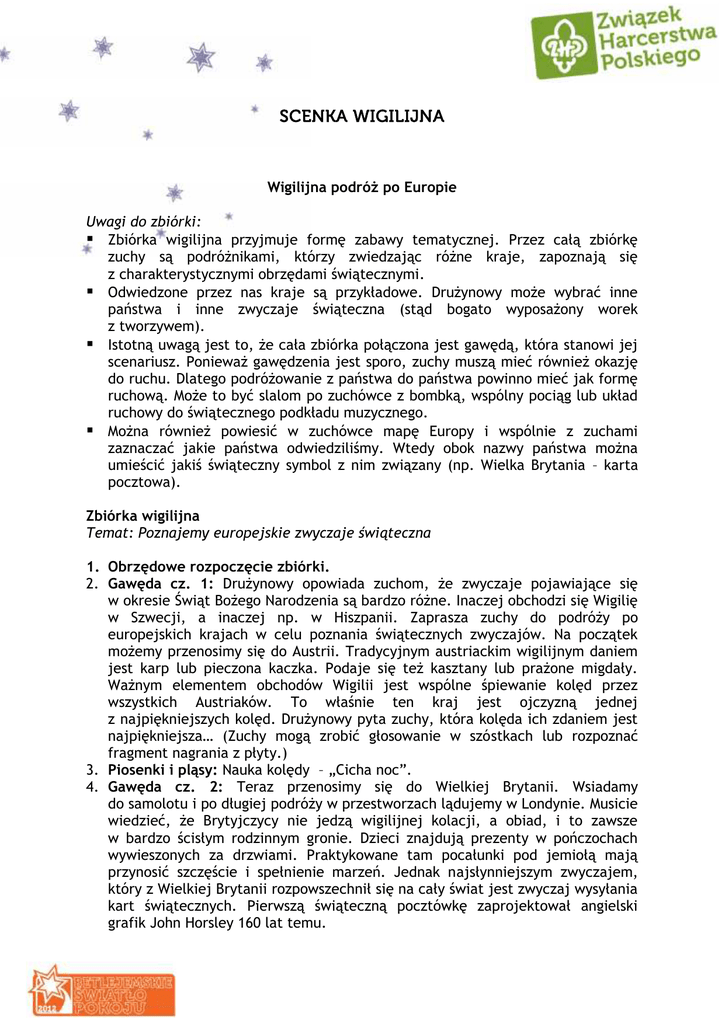 SCENKA WIGILIJNA Wigilijna podróż po Europie Uwagi do zbiórki: Zbiórka wigilijna przyjmuje formę zabawy tematycznej. Przez całą zbiórkę zuchy są podróżnikami, którzy zwiedzając różne kraje, zapoznają się z charakterystycznymi obrzędami świątecznymi. Odwiedzone przez nas kraje są przykładowe. Drużynowy może wybrać inne państwa i inne zwyczaje świąteczna (stąd bogato wyposażony worek z tworzywem). Istotną uwagą jest to, że cała zbiórka połączona jest gawędą, która stanowi jej scenariusz. Ponieważ gawędzenia jest sporo, zuchy muszą mieć również okazję do ruchu. Dlatego podróżowanie z państwa do państwa powinno mieć jak formę ruchową. Może to być slalom po zuchówce z bombką, wspólny pociąg lub układ ruchowy do świątecznego podkładu muzycznego. Można również powiesić w zuchówce mapę Europy i wspólnie z zuchami zaznaczać jakie państwa odwiedziliśmy. Wtedy obok nazwy państwa można umieścić jakiś świąteczny symbol z nim związany (np. Wielka Brytania – karta pocztowa). Zbiórka wigilijna Temat: Poznajemy europejskie zwyczaje świąteczna 1. Obrzędowe rozpoczęcie zbiórki. 2. Gawęda cz. 1: Drużynowy opowiada zuchom, że zwyczaje pojawiające się w okresie Świąt Bożego Narodzenia są bardzo różne. Inaczej obchodzi się Wigilię w Szwecji, a inaczej np. w Hiszpanii. Zaprasza zuchy do podróży po europejskich krajach w celu poznania świątecznych zwyczajów. Na początek możemy przenosimy się do Austrii. Tradycyjnym austriackim wigilijnym daniem jest karp lub pieczona kaczka. Podaje się też kasztany lub prażone migdały. Ważnym elementem obchodów Wigilii jest wspólne śpiewanie kolęd przez wszystkich Austriaków. To właśnie ten kraj jest ojczyzną jednej z najpiękniejszych kolęd. Drużynowy pyta zuchy, która kolęda ich zdaniem jest najpiękniejsza… (Zuchy mogą zrobić głosowanie w szóstkach lub rozpoznać fragment nagrania z płyty.) 3. Piosenki i pląsy: Nauka kolędy – „Cicha noc”. 4. Gawęda cz. 2: Teraz przenosimy się do Wielkiej Brytanii. Wsiadamy do samolotu i po długiej podróży w przestworzach lądujemy w Londynie. Musicie wiedzieć, że Brytyjczycy nie jedzą wigilijnej kolacji, a obiad, i to zawsze w bardzo ścisłym rodzinnym gronie. Dzieci znajdują prezenty w pończochach wywieszonych za drzwiami. Praktykowane tam pocałunki pod jemiołą mają przynosić szczęście i spełnienie marzeń. Jednak najsłynniejszym zwyczajem, który z Wielkiej Brytanii rozpowszechnił się na cały świat jest zwyczaj wysyłania kart świątecznych. Pierwszą świąteczną pocztówkę zaprojektował angielski grafik John Horsley 160 lat temu. 5. Majsterka: Wykonujemy karty świąteczne dla bliskich (pomysły: worek z tworzywem). 6. Gawęda cz. 3: Żegnamy się z mieszkańcami wyspiarskiego kraju i wsiadając na prom – przenosimy się do Włoch. W dniu Wigilii we Włoszech obowiązuje ścisły post – ludzie nie mogą jeść mięsa a jedynie ryby. Włosi twierdzą, że prezenty dzieciom roznosi Święty Mikołaj a towarzyszy mu czarownica Befana (patrz: worek z tworzywem). Najsłynniejszym włoskim zwyczajem świątecznym, który powstał 900 lat temu, jest wystawianie bożonarodzeniowych przedstawień – tzw. jasełek. 7. Zuchowy teatr: teatr samorodny – zuchy w szóstkach odgrywają krótkie jasełka (zuchy mogą losować punkty wydarzeń, a później po kolei odgrywać scenki, które złożą się w całość). 8. Gawęda cz. 4: Znów wsiadamy w nasz samolot i lecimy tym razem do Rosji. W Rosji święta Bożego Narodzenia obchodzi się dopiero 7 stycznia. Cała rodzina zasiada do kolacji wigilijnej, gdzie je się dania postne. Według tradycji dań na wigilijnym stole powinno być 12 – tyle, ilu było apostołów. W tę szczególną wigilijną noc Rosjanie w swych domach zapalają świece a na ulicach miast rozpala się ogniska, które mają rozgrzać Boże Dziecię w te mroźną noc. Prezenty dzieci otrzymują w nocy z 31 grudnia na 1 stycznia, a przynosi je Dziadek Mróz i jego wnuczka Śnieżynka. 9. Przybycie Mikołaja - (W tym momencie do sali wkracza Mikołaj, który wręcza zuchom przygotowane wcześniej prezenty.) 10. Piosenki i pląsy: Ponieważ Mikołaj bardzo zmarzł prosi zuchy o rozgrzanie go ulubionym pląsem gromady. 11. Gawęda cz. 5: Żegnamy Mikołaja, dziękujemy mu za prezenty i wracamy do Polski. Przemieszczamy się tym razem pociągiem. Odbywa się skromna kolacja wigilijna, łamanie opłatkiem, składanie życzeń itp. Na taką wigilię można zaprosić rodziców. 12.Krąg rady: Podsumowanie zbiórki. Drużynowy wraz z zuchami omawia zwyczaje świąteczne poznanych krajów, porównuje je z naszymi. Każdy zuch kończy zdanie: Moim domowym ulubionym zwyczajem świątecznym jest… 13.Zadanie międzyzbiórkowe: Wykonać prezent dla bliskiej osoby i podarować go na gwiazdkę. 14. Obrzędowe zakończenie zbiórki. WOREK Z TWORZYWEM Europejskie zwyczaje świąteczne: Niemcy: Święta w Niemczech trwają 3 dni. To właśnie tutaj, już w XVI wieku, powstał zwyczaj ozdabiania choinek. Używano do tego jabłek i papierowych ozdób. Na trzy tygodnie przed świętami w niemieckich domach wiesza się specjalny kalendarz. W niewielkich kieszonkach każdego dnia (aż do Wigilii) dzieci znajdują czekoladki lub inne słodycze. Najbardziej charakterystycznym elementem niemieckiej świątecznej obrzędowości jest ciasto z bakaliami, które swym kształtem ma przypominać zawinięte w becik dzieciątko. Innym zwyczajem jest tradycja organizowania szopki wraz ze specjalną kołyską. Zadaniem wiernym jest utulenie do snu śpiące tam niemowlę – poprzez bujanie kołyski i śpiewanie kolęd. Grecja: Święta w Grecji trwają aż 12 dni. Grecy nie wierzą w Świętego Mikołaja, natomiast istnieje tam zwyczaj hojnego obdarowywania się prezentami. Na dzień przed Bożym Narodzeniem dzieci chodzą od domu do domu i śpiewają kolędy. Ich pieśni mają błogosławi