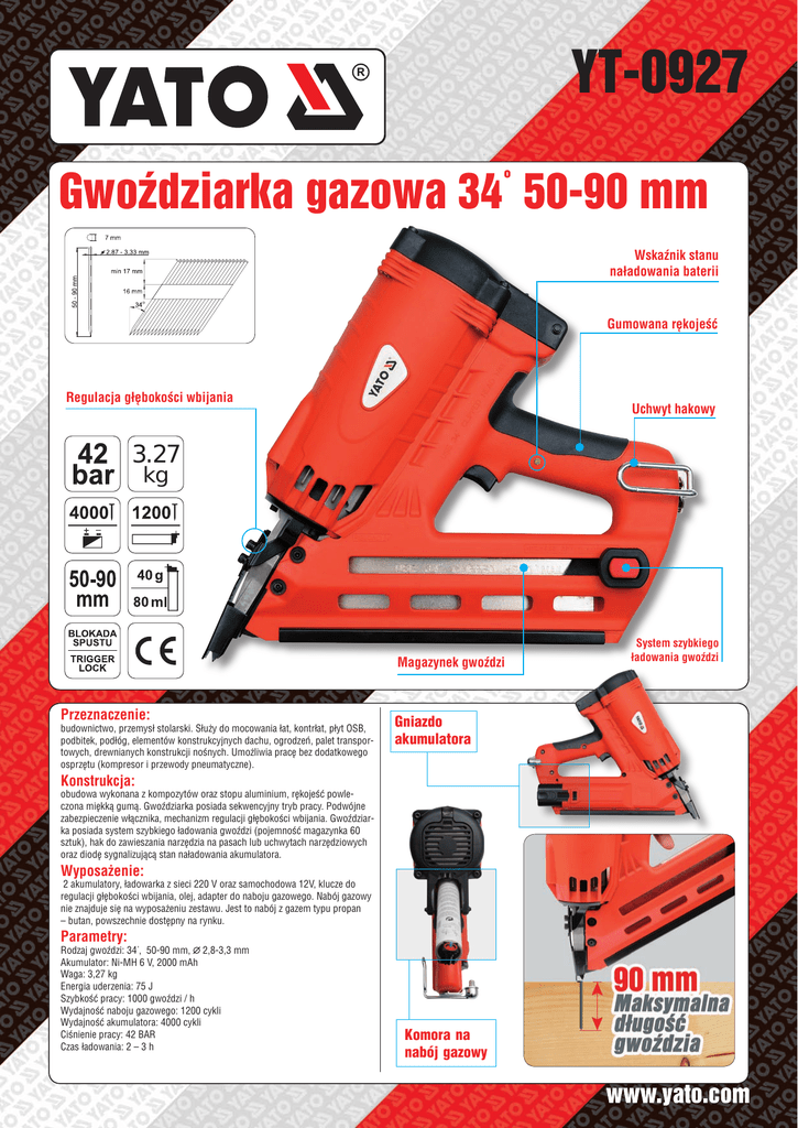 YT-0927 Gwoździarka gazowa 34° 50-90 mm Wskaźnik stanu naładowania baterii Gumowana rękojeść Regulacja głębokości wbijania Uchwyt hakowy 3.27 kg Magazynek gwoździ Przeznaczenie: budownictwo, przemysł stolarski. Służy do mocowania łat, kontrłat, płyt OSB, podbitek, podłóg, elementów konstrukcyjnych dachu, ogrodzeń, palet transportowych, drewnianych konstrukcji nośnych. Umożliwia pracę bez dodatkowego osprzętu (kompresor i przewody pneumatyczne). Gniazdo akumulatora Konstrukcja: obudowa wykonana z kompozytów oraz stopu aluminium, rękojeść powleczona miękką gumą. Gwoździarka posiada sekwencyjny tryb pracy. Podwójne zabezpieczenie włącznika, mechanizm regulacji głębokości wbijania. Gwoździarka posiada system szybkiego ładowania gwoździ (pojemność magazynka 60 sztuk), hak do zawieszania narzędzia na pasach lub uchwytach narzędziowych oraz diodę sygnalizującą stan naładowania akumulatora. Wyposażenie: 2 akumulatory, ładowarka z sieci 220 V oraz samochodowa 12V, klucze do regulacji głębokości wbijania, olej, adapter do naboju gazowego. Nabój gazowy nie znajduje się na wyposażeniu zestawu. Jest to nabój z gazem typu propan – butan, powszechnie dostępny na rynku. Parametry: Rodzaj gwoździ: 34°, 50-90 mm, 2,8-3,3 mm Akumulator: Ni-MH 6 V, 2000 mAh Waga: 3,27 kg Energia uderzenia: 75 J Szybkość pracy: 1000 gwoździ / h Wydajność naboju gazowego: 1200 cykli Wydajność akumulatora: 4000 cykli Ciśnienie pracy: 42 BAR Czas ładowania: 2 – 3 h Komora na nabój gazowy System szybkiego ładowania gwoździ