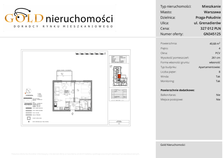 Typ nieruchomości: Mieszkanie Miasto: Warszawa Dzielnica: Praga-Południe Ulica: ul. Grenadierów Cena: 327 012 PLN Numer oferty: Powierzchnia: Piętro: Okna: GN345125 40,68 m2 4 PCV Wysokość pomieszczeń: 261 cm Forma własności gruntu: własność Typ budynku: Apartamentowiec Liczba pięter: 8 Winda: Tak Monitoring: Tak Powierzchnie dodatkowe: Balkon/taras: Nie Miejsce postojowe: Nie Gold Nieruchomości Powyższa oferta ma charakter informacyjny i nie stanowi oferty w rozumieniu art.66 $1 kodeksu cywilnego oraz innych właściwych przepsiów prawnych. Typ nieruchomości: Mieszkanie Miasto: Warszawa Dzielnica: Praga-Południe Ulica: ul. Grenadierów Cena: 327 012 PLN Numer oferty: Powierzchnia: Piętro: Okna: GN345125 40,68 m2 4 PCV Wysokość pomieszczeń: 261 cm Forma własności gruntu: własność Typ budynku: Apartamentowiec Liczba pięter: 8 Winda: Tak Monitoring: Tak Powierzchnie dodatkowe: Balkon/taras: Nie Miejsce postojowe: Nie Gold Nieruchomości Powyższa oferta ma charakter informacyjny i nie stanowi oferty w rozumieniu art.66 $1 kodeksu cywilnego oraz innych właściwych przepsiów prawnych. Typ nieruchomości: Mieszkanie Miasto: Warszawa Dzielnica: Praga-Południe Ulica: ul. Grenadierów Cena: 327 012 PLN Numer oferty: Opis Powierzchnia: Piętro: GN345125 40,68 m2 4 Wyjątkowe mieszkania na Pradze to nietuzinkowa inwestycja położona na Grochowie - w części warszawskiej Pragi. Nowoczesny projekt został zlokalizowany w jednym z najlepszych komunikacyjnie punktów dzielnicy. To tutaj najciekawsze atrybuty miejskiego życia harmonijnie przeplatają się z terenami zielonymi i mnóstwem praskich atrakcji. Okna: Kameralna i estetyczna zabudowa - zaledwie 84 mieszkania. 8 dopracowanych w każdym detalu pięter. Przestronne 1-, 2-, 3- i 4-pokojowe mieszkania już od 31 m2, a na ostatniej kondygnacji także dwupoziomowe apartamenty z dużymi tarasami o oryginalnych pergolach i metrażu 97 m2. Elegancki hol wejściowy utrzymany w minimalistycznych szarościach i beżach. Możliwość skorzystania z Inteligentnego Systemu Mieszkaniowego. Typ budynku: Apartamentowiec Liczba pięter: 8 Oferta z rynku pierwotnego, klient nie ponosi dodatkowych kosztów związanych z wynagrodzeniem pośrednika oraz PCC. Wysokość pomieszczeń: 261 cm Forma własności gruntu: własność Winda: Tak Monitoring: Tak Powierzchnie dodatkowe: Balkon/taras: Nie Miejsce postojowe: Nie Gold Nieruchomości Powyższa oferta ma charakter informacyjny i nie stanowi oferty w rozumieniu art.66 $1 kodeksu cywilnego oraz innych właściwych przepsiów prawnych. PCV