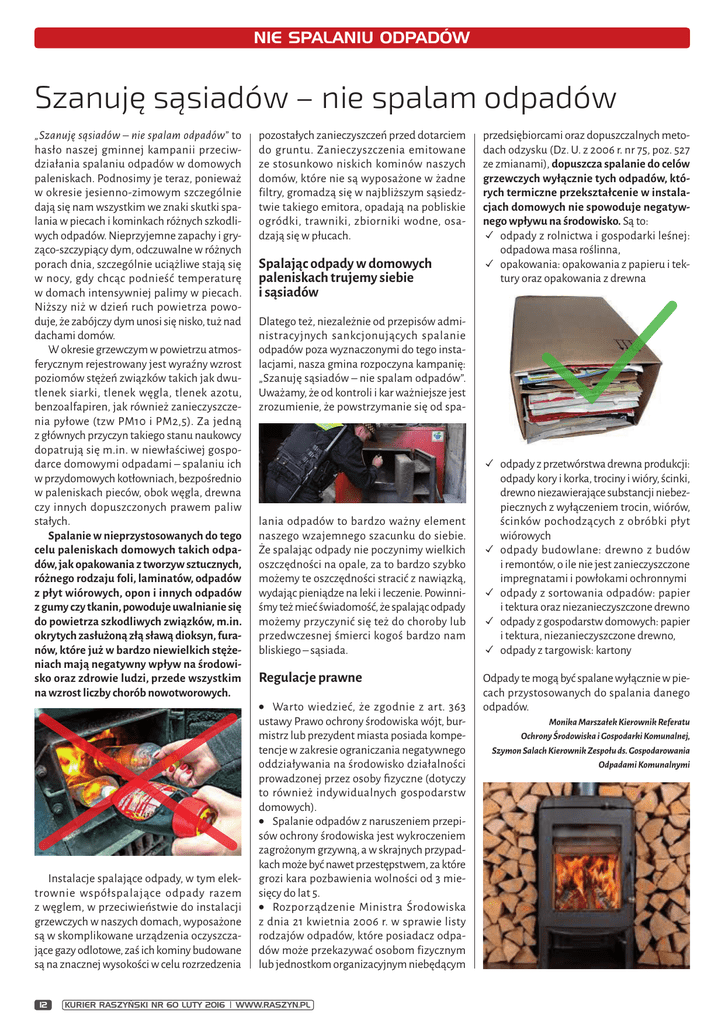 NIE SPALANIU ODPADÓW Szanuję sąsiadów – nie spalam odpadów „Szanuję sąsiadów – nie spalam odpadów” to hasło naszej gminnej kampanii przeciwdziałania spalaniu odpadów w domowych paleniskach. Podnosimy je teraz, ponieważ w okresie jesienno-zimowym szczególnie dają się nam wszystkim we znaki skutki spalania w piecach i kominkach różnych szkodliwych odpadów. Nieprzyjemne zapachy i gryząco-szczypiący dym, odczuwalne w różnych porach dnia, szczególnie uciążliwe stają się w nocy, gdy chcąc podnieść temperaturę w domach intensywniej palimy w piecach. Niższy niż w dzień ruch powietrza powoduje, że zabójczy dym unosi się nisko, tuż nad dachami domów. W okresie grzewczym w powietrzu atmosferycznym rejestrowany jest wyraźny wzrost poziomów stężeń związków takich jak dwutlenek siarki, tlenek węgla, tlenek azotu, benzoalfapiren, jak również zanieczyszczenia pyłowe (tzw PM10 i PM2,5). Za jedną z głównych przyczyn takiego stanu naukowcy dopatrują się m.in. w niewłaściwej gospodarce domowymi odpadami – spalaniu ich w przydomowych kotłowniach, bezpośrednio w paleniskach pieców, obok węgla, drewna czy innych dopuszczonych prawem paliw stałych. Spalanie w nieprzystosowanych do tego celu paleniskach domowych takich odpadów, jak opakowania z tworzyw sztucznych, różnego rodzaju foli, laminatów, odpadów z płyt wiórowych, opon i innych odpadów z gumy czy tkanin, powoduje uwalnianie się do powietrza szkodliwych związków, m.in. okrytych zasłużoną złą sławą dioksyn, furanów, które już w bardzo niewielkich stężeniach mają negatywny wpływ na środowisko oraz zdrowie ludzi, przede wszystkim na wzrost liczby chorób nowotworowych. Instalacje spalające odpady, w tym elektrownie współspalające odpady razem z węglem, w przeciwieństwie do instalacji grzewczych w naszych domach, wyposażone są w skomplikowane urządzenia oczyszczające gazy odlotowe, zaś ich kominy budowane są na znacznej wysokości w celu rozrzedzenia 12 pozostałych zanieczyszczeń przed dotarciem do gruntu. Zanieczyszczenia emitowane ze stosunkowo niskich kominów naszych domów, które nie są wyposażone w żadne filtry, gromadzą się w najbliższym sąsiedztwie takiego emitora, opadają na pobliskie ogródki, trawniki, zbiorniki wodne, osadzają się w płucach. Spalając odpady w domowych paleniskach trujemy siebie i sąsiadów przedsiębiorcami oraz dopuszczalnych metodach odzysku (Dz. U. z 2006 r. nr 75, poz. 527 ze zmianami), dopuszcza spalanie do celów grzewczych wyłącznie tych odpadów, których termiczne przekształcenie w instalacjach domowych nie spowoduje negatywnego wpływu na środowisko. Są to: ✓✓ odpady z rolnictwa i gospodarki leśnej: odpadowa masa roślinna, ✓✓ opakowania: opakowania z papieru i tektury oraz opakowania z drewna Dlatego też, niezależnie od przepisów administracyjnych sankcjonujących spalanie odpadów poza wyznaczonymi do tego instalacjami, nasza gmina rozpoczyna kampanię: „Szanuję sąsiadów – nie spalam odpadów”. Uważamy, że od kontroli i kar ważniejsze jest zrozumienie, że powstrzymanie się od spa- lania odpadów to bardzo ważny element naszego wzajemnego szacunku do siebie. Że spalając odpady nie poczynimy wielkich oszczędności na opale, za to bardzo szybko możemy te oszczędności stracić z nawiązką, wydając pieniądze na leki i leczenie. Powinniśmy też mieć świadomość, że spalając odpady możemy przyczynić się też do choroby lub przedwczesnej śmierci kogoś bardzo nam bliskiego – sąsiada. Regulacje prawne •• Warto wiedzieć, że zgodnie z art. 363 ustawy Prawo ochrony środowiska wójt, burmistrz lub prezydent miasta posiada kompetencje w zakresie ograniczania negatywnego oddziaływania na środowisko działalności prowadzonej przez osoby fizyczne (dotyczy to również indywidualnych gospodarstw domowych). •• Spalanie odpadów z naruszeniem przepisów ochrony środowiska jest wykroczeniem zagrożonym grzywną, a w skrajnych przypadkach może być nawet przestępstwem, za które grozi kara pozbawienia wolności od 3 miesięcy do lat 5. •• Rozporządzenie Ministra Środowiska z dnia 21 kwietnia 2006 r. w sprawie listy rodzajów odpadów, które posiadacz odpadów może przekazywać osobom fizycznym lub jednostkom organizacyjnym niebędącym KURIER RASZYŃSKI NR 60 LUTY 2016 | WWW.RASZYN.PL ✓✓ odpady z przetwórstwa drewna produkcji: odpady kory i korka, trociny i wióry, ścinki, drewno niezawierające substancji niebezpiecznych z wyłączeniem trocin, wiórów, ścinków pochodzących z obróbki płyt wiórowych ✓✓ o dpady budowlane: drewno z budów i remontów, o ile nie jest zanieczyszczone impregnatami i powłokami ochronnymi ✓✓ odpady z sortowania odpadów: papier i tektura oraz niezanieczyszczone drewno ✓✓ odpady z gospodarstw domowych: papier i tektura, niezanieczyszczone drewno, ✓✓ odpady z targowisk: kartony Odpady te mogą być spalane wyłącznie w piecach przystosowanych do spalania danego odpadów. Monika Marszałek Kierownik Referatu Ochrony Środowiska i Gospodarki Komunalnej, Szymon Salach Kierownik Zespołu ds. Gospodarowania Odpadami Komunalnymi