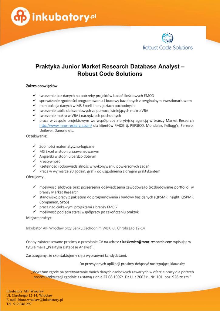 Praktyka Junior Market Research Database Analyst – Robust Code Solutions Zakres obowiązków: tworzenie baz danych na potrzeby projektów badań ilościowych FMCG sprawdzanie zgodności programowania i budowy baz danych z oryginalnym kwestionariuszem manipulacja danych w MS Excell i narzędziach pochodnych tworzenie tablic obliczeniowych za pomocą istniejących makro VBA tworzenie makro w VBA i narzędziach pochodnych praca w zespole projektowym we współpracy z brytyjską agencją w branży Market Research http://www.mmr-research.com/ dla klientów FMCG tj. PEPSICO, Mondalez, Kellogg’s, Ferrero, Unilever, Danone etc. Oczekiwania: Zdolności matematyczno-logiczne MS Excel w stopniu zaawansowanym Angielski w stopniu bardzo dobrym Kreatywność Rzetelność i odpowiedzialność w wykonywaniu powierzonych zadań Praca w wymiarze 20 godzin, grafik do uzgodnienia z drugim praktykantem Oferujemy: możliwość zdobycia oraz poszerzenia doświadczenia zawodowego (rozbudowanie portfolio) w branży Market Research stanowisko pracy z pakietem do programowania i budowy baz danych (QPSMR Insight, QSPMR Companion, SPSS) praca nad ciekawymi projektami z branży FMCG możliwość podjęcia stałej współpracy po zakończeniu praktyk Miejsce praktyk: Inkubator AIP Wrocław przy Banku Zachodnim WBK, ul. Chrobrego 12-14 Osoby zainteresowane prosimy o przesłanie CV na adres: [email protected] wpisując w tytule maila „Praktyka Database Analyst”. Zastrzegamy, że skontaktujemy się z wybranymi kandydatami. Do przesyłanych aplikacji prosimy dołączyć następującą klauzulę: „Wyrażam zgodę na przetwarzanie moich danych osobowych zawartych w ofercie pracy dla potrzeb procesu rekrutacji zgodnie z ustawą z dnia 27.08.1997r. Dz.U. z 2002 r., Nr. 101, poz. 926 ze zm.” Inkubatory AIP Wrocław Ul. Chrobrego 12-14, Wrocław E-mail: [email protected] Tel. 512 046 297