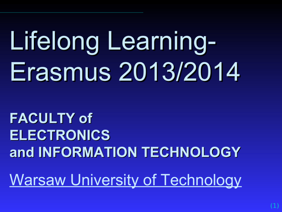 Lifelong LearningErasmus 2013/2014 FACULTY of ELECTRONICS and INFORMATION TECHNOLOGY Warsaw University of Technology (1) Lifelong LearningErasmus 2013/2014 Dr inż. Dariusz Turlej Dr inż. Wojciech Zabołotny Mgr Małgorzata Domańska (2) Plan prezentacji Lifelong Learning - Erasmus 2013/2014 Program Lifelong Learning - Erasmus Organizowanie wyjazdów studenckich Wyjazdy studenckie w roku 2012/2013 Możliwości wyjazdów w roku 2013/2014 (3) (I) Program Lifelong Learning - Erasmus Program Lifelong Learning - Erasmus Cel programu Kraje uprawnione do udziału w programie Przedsięwzięcia podejmowane w ramach programu (4) (I) Program Lifelong Learning - Erasmus -1- Cel programu Lifelong Learning Erasmus podnoszenie poziomu kształcenia i wzmacnianie jego europejskiego wymiaru w szkołach wyższych (5) (I) Program Lifelong Learning - Erasmus -2- Kraje uprawnione do udziału w programie 27 państw Unii Europejskiej: 3 kraje Europejskiego Obszaru Gospodarczego: Austria, Belgia, Bułgaria, Cypr, Czechy, Dania, Estonia, Finlandia, Francja, Grecja, Hiszpania, Holandia, Irlandia, Luksemburg, Litwa, Łotwa, Malta, Niemcy, Polska, Portugalia, Rumunia, Słowacja, Słowenia, Szwecja, Węgry, Wielka Brytania, Włochy Islandia, Lichtenstein, Norwegia Kraje kandydujące i inne: Turcja, Szwajcaria, Chorwacja (6) (7) (I) Program Lifelong Learning - Erasmus -3- Przedsięwzięcia podejmowane w ramach programu prowadzenie wymiany studentów prowadzenie wymiany nauczycieli akademickich w ramach projektów wielostronnych organizowanie kursów intensywnych ułatwiającego zaliczenie okresu studiów odbytego w innej uczelni opracowywanie nowych programów nauczania w celu prowadzenia zajęć dydaktycznych wprowadzanie systemu punktowego ECTS od 3 miesięcy do 1 roku akademickiego prowadzonych przez międzynarodowe grupy nauczycieli akademickich dla międzynarodowych grup studentów uczestniczenie w sieciach tematycznych Erasmusa szeroko zakrojonych projektach współpracy realizowanych z udziałem wszystkich krajów uczestniczących w programie (8) (II) Organizowanie wyjazdów studenckich Organizowanie wyjazdów studenckich Zasady organizacji wyjazdów studentów Zasady rekrutacji studentów na wyjazdy Organizacja wyjazdów (9) (II) Organizowanie wyjazdów studenckich -1- Zasady organizacji wyjazdów studentów Wyłącznie pomiędzy uczelniami posiadającymi ważną Kartę Uczelni Erasmusa Muszą być podpisane umowy dwustronne Wyłącznie studenci, którzy są obywatelami państwa uczestniczącego w programie lub posiadają prawo stałego pobytu lub status uchodźcy na terenie Polski są studentami co najmniej 2 roku studiów Podstawowe kryteria stawiane przed kandydatami dobre wyniki w nauce znajomość języka obcego, w jakim będą prowadzone zajęcia w uczelni zagranicznej (10) (II) Organizowanie wyjazdów studenckich -2- Zasady rekrutacji studentów na wyjazdy Rekrutację studentów przeprowadza Pełnomocnik Dziekana z udziałem opiekunów podpisanych wcześniej umów Kryteria rekrutacji średnia skumulowana ocen z całego okresu studiów znajomość języka danego kraju lub języka, w którym student będzie porozumiewał się na danej uczelni opinia o studencie zaangażowanie w opiekę nad studentami zza granicy w Politechnice Warszawskiej (+0.2 do średniej) procedurze rekrutacji ogólnej nie podlegają studenci, którzy sami zainicjowali podpisanie umowy z uczelnią zagraniczną i uzyskali wstępną akceptację przyjęcia; dotyczy to również umów zainicjowanych przez opiekunów w celu prowadzenia projektów związanych z tematami prac dyplomowych Termin składania zgłoszeń 27 lutego – 15 marca 2013 r. (11) (II) Organizowanie wyjazdów studenckich -3- Organizacja wyjazdów Obsługa programu na Wydziale Podstawowe dokumenty Dział Współpracy Międzynarodowej Dziekanat Pełnomocnik Dziekana ds. Zagranicznej Wymiany Studentów Zgłoszenie studenta (Outgoing Student Application) Porozumienie o programie studiów (Learning Agreement) Wykaz zaliczeń (Transcript of Records) Propozycja transferu zaliczeń (Course Credit Transfer) Obsługa programu na Uczelni Uczelniana Agencja Programów Edukacyjnych (12) (III) Wyjazdy studenckie w roku 2012/2013 Wyjazdy studenckie w roku 2012/2013 Wyjazdy i przyjazdy studentów (1) Wyjazdy i przyjazdy studentów (2) (13) Studenci wyjeżdżający 12/13 Niemcy Hiszpania Wielka Brytania Holandia Szwecja Francja Finlandia Malta Belgia Szwajcaria Włochy 11 10 5 4 4 3 2 2 1 1 1 Razem 44 (14) Studenci przyjeżdżający 12/13 Hiszpania Turcja Portugalia Francja Niemcy W łochy Grecja Chorwacja W ęgry Finlandia 34 20 7 6 3 3 1 1 1 1 Razem 77 (15) (IV) Możliwości wyjazdów w roku 2013/2014 Możliwości wyjazdów w roku 2013/2014 Lista umów dwustronnych (1) Lista umów dwustronnych (2) Lista kandydatów (16) Uczelnie, z którymi mamy ważne umowy Hiszpania 18 Turcja 9 Niemcy 8 Francja 8 W łochy 6 Austria 4 Holandia 4 Belgia 2 Szwecja 2 Dania 2 Portugalia 2 Finlandia 1 Grecja 1 Chorwacja 1 Litwa 1 Rumunia 1 Szwajcaria 1 W ielka Brytania 1 Razem 72 (17) ZAPRASZAMY (18)