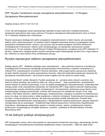 Windykacja.pl - KPF: Ryzyka i fundament rozwoju zarządzania wierzytelnościami - VI Kongres Zarządzania Wierzytelnościami KPF: Ryzyka i fundament rozwoju zarządzania wierzytelnościami - VI Kongres Zarządzania Wierzytelnościami Ostatnia zmiana: 2015-11-04 14:21:42 O tym, jak samoregulacja ryzyka reputacyjnego wpłynęła na jego wizerunek i praktykę biznesową dyskutować będą liderzy tego rynku podczas VI Kongresu Zarządzania Wierzytelnościami, który w dniach 16-17 listopada odbędzie się w Warszawie. Ryzyka reputacyjne dotykają dziś sektor zarządzania wierzytelnościami w takim stopniu, jak pozostałe sektory rynku usług finansowych. W ostatnich latach nastąpiła kardynalna zmiana w postrzeganiu branży zarządzania wierzytelnościami. Jednym z jej przyczyn było poważne podejście Członków Konferencji Przedsiębiorstw Finansowych, liderów rynku windykacyjnego, do standardów stosowanych praktyk biznesowych. Te zaś czerpały z Zasad Dobrych Praktyk Windykacyjnych, przyjętych przez KPF dokładnie 10 lat temu. Dzięki temu nastąpiło bardzo wyraźne obniżenie ryzyka reputacyjnego zarówno firm z tego sektora, jak i sektorów na rzecz których firmy windykacyjne pracują. Ryzyka reputacyjne sektora zarządzania wierzytelnościami Według raportu KPF Wielkość polskiego rynku wierzytelności , tylko podmioty zrzeszone w Konferencji Przedsiębiorstw Finansowych zarządzają wierzytelnościami konsumenckimi o wartości nominalnej 61,6 miliarda PLN, odzyskiwanymi od ponad 9 milionów dłużników. Jeśli przyjąć bardzo uproszczone założenie, że jeden dłużnik przypada na jedno gospodarstwo domowe, widać jak kardynalną kwestią jest reputacja dla zarządzania wierzytelnościami, i jak poważne skutki mogłaby mieć jej utrata lub nawet erozja. Amerykański filozof i polityk, Benjamin Franklin powiedział, że potrzeba wielu dobrych uczynków, aby stworzyć dobrą reputację, ale wystarczy jeden zły, żeby ją stracić . Jego spostrzeżenie z powodzeniem można odnieść do sektora finansowego, w tym do spółek zarządzających wierzytelnościami. Systematycznie rosnący polski rynek wierzytelności potwierdza, że Członkowie KPF z tego sektora wykonali rzetelną pracę, wypracowując wysokie standardy praktyk windykacyjnych. Konsekwentnie realizowana przez liderów rynku windykacyjnego strategia spowodowała, iż klimat, jaki towarzyszył ich działalności sprzed 10 lat, uległ zmianie. Dziś sektor bankowy, telekomunikacyjny, ubezpieczeniowy, bazujące na zaufaniu do świadczonych przez nie usług, nie widzą ryzyka w stałej współpracy z sektorem windykacji. Systematycznie korzystają one nie tylko z usług windykacji na zlecenie, ale dokonują sprzedaży portfeli wierzytelności. Ponadto firmy zarządzające wierzytelnościami wspierają jedną z najważniejszych instytucji społecznych, jaką jest lojalność i wywiązywanie się ze zobowiązań. - Działalność tego sektora przypomina o konieczności respektowania imperatywu, nakazującego spłatę długu zgodnie z zawartą umową - jednej z podstawowych instytucji społecznych, konstytuujących porządek społeczny i zaufanie - podkreśla dr Mirosław Bieszki, Doradca Ekonomiczny KPF. 10 lat dobrych praktyk windykacyjnych KPF zainicjowała zmiany, które doprowadziły do ustanowienia fundamentu etycznego, stanowiącego dla firm zarządzających wierzytelnościami podstawę kształtowania relacji z otoczeniem. - Mało kto zdaje sobie http://www.windykacja.pl/informacje-z-firm,kpf-ryzyka-i-fundament-rozwoju-zarzadzania-wierzytelnosciami-vi-kongres-zarzadzania-wierzytel.ht 1/3 2017-03-04 09:47:53 Windykacja.pl - KPF: Ryzyka i fundament rozwoju zarządzania wierzytelnościami - VI Kongres Zarządzania Wierzytelnościami sprawę, że zmiany, jakie dokonały się dzięki przyjęciu 10 lat temu dobrych praktyk przez 6 ówczesnych liderów tego rynku, w tym aktualnych Członków KPF - BEST, INTRUM JUSTITIA, KRUK i ULTIMO, miało tak kapitalne znaczenie dla dalszego rozwoju rynku. Jestem dumny, że mogę tym pożytecznym dla rozwoju rynku finansowego zmianom towarzyszyć od ich początku - mówi Andrzej Roter, Dyrektor Generalny KPF. Osią tych zmian stały się Zasady Dobrych Praktyk Windykacyjnych - dokument określający między innymi reguły komunikowania się z dłużnikiem, a także szczegółowo opisujący praktyki zakazane i niedozwolone. Ich stosowanie w działalności biznesowej przez Członków KPF z sektora zarządzania wierzytelnościami, przy pomocy corocznego, obligatoryjnego audytu etycznego, monitoruje Komisja Etyki jako statutowy organ Konferencji Przedsiębiorstw Finansowych. Podjęcie podczas VI Kongresu Zarządzania Wierzytelnościami dyskusji na temat roli dobrych praktyk windykacyjnych uzasadnia przypadające w 2015 roku 10-lecie ich przyjęcia przez KPF. - Papierkiem lakmusowym, weryfikującym racjonalność przyjętej przez Członków KPF filozofii windykacji jest i to, że dziś stosowanie metod koncyliacyjnych odzyskiwania należności stało się standardową praktyką dla całego profesjonalnego rynku. Potwierdzeniem dojrzałości biznesowej całego sektora jest fakt, że zasady dobrych praktyk windykacyjnych, KPF, zostały zaadoptowane także przez inną branżową organizację - Polski Związek Windykacji. Dobre praktyki stają się w ten sposób dobrem wspólnym i sposobem na budowania kapitału społecznego - zauważa Andrzej Roter, Dyrektor Generalny KPF. W debacie o historycznych przemianach, zachodzących na przestrzeni ostatnich lat, roli etyki w prowadzonej działalności i wpływie windykacji polubownej na postrzeganie polskiego sektora obrotu wierzytelnościami przez zagranicznych inwestorów, wezmą udział przedstawiciele firm zarządzających wierzytelnościami liderów branży, których umiejętność myślenia o długofalowym, zrównoważonym rozwoju sektora, stały się źródłem sukcesu biznesowego: BEST S.A., Intrum Justitia Sp. z o.o., Grupy KRUK S.A. i C