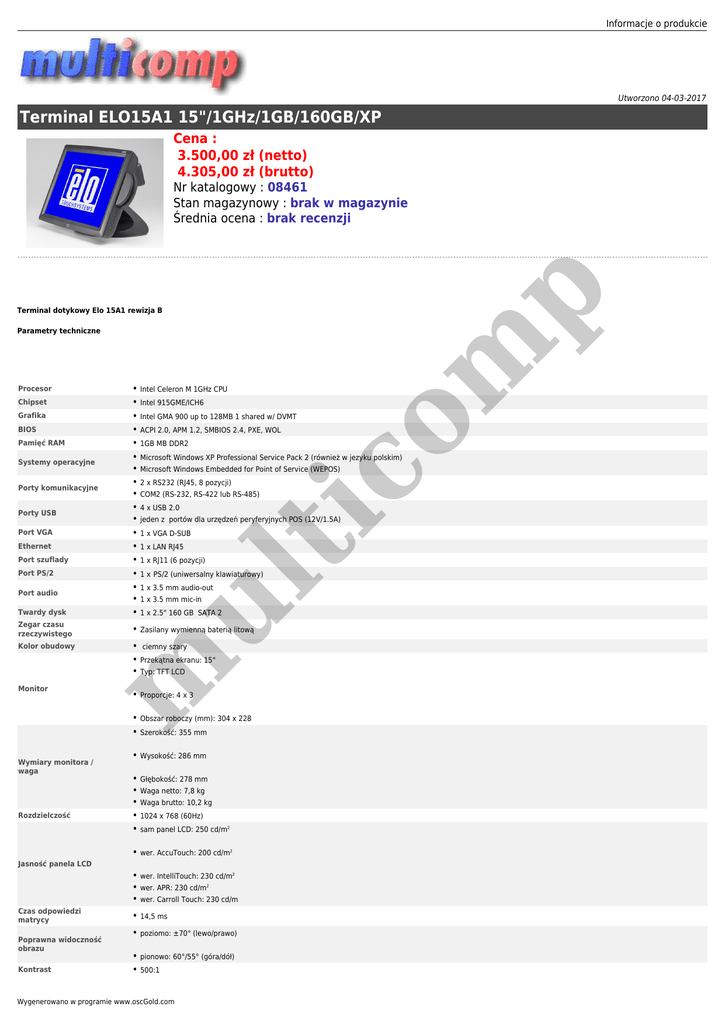 Terminal ELO15A1 15"/1GHz/1GB/160GB/XP - Sklep