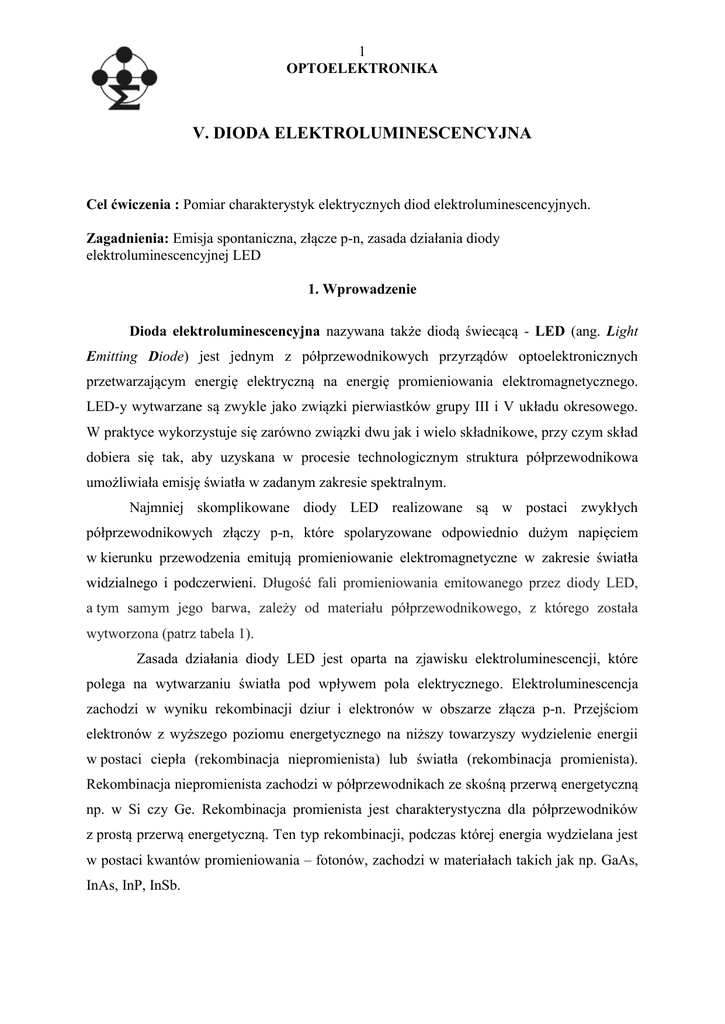 1 OPTOELEKTRONIKA V. DIODA ELEKTROLUMINESCENCYJNA Cel ćwiczenia : Pomiar charakterystyk elektrycznych diod elektroluminescencyjnych. Zagadnienia: Emisja spontaniczna, złącze p-n, zasada działania diody elektroluminescencyjnej LED 1. Wprowadzenie Dioda elektroluminescencyjna nazywana także diodą świecącą - LED (ang. Light Emitting Diode) jest jednym z półprzewodnikowych przyrządów optoelektronicznych przetwarzającym energię elektryczną na energię promieniowania elektromagnetycznego. LED-y wytwarzane są zwykle jako związki pierwiastków grupy III i V układu okresowego. W praktyce wykorzystuje się zarówno związki dwu jak i wielo składnikowe, przy czym skład dobiera się tak, aby uzyskana w procesie technologicznym struktura półprzewodnikowa umożliwiała emisję światła w zadanym zakresie spektralnym. Najmniej skomplikowane diody LED realizowane są w postaci zwykłych półprzewodnikowych złączy p-n, które spolaryzowane odpowiednio dużym napięciem w kierunku przewodzenia emitują promieniowanie elektromagnetyczne w zakresie światła widzialnego i podczerwieni. Długość fali promieniowania emitowanego przez diody LED, a tym samym jego barwa, zależy od materiału półprzewodnikowego, z którego została wytworzona (patrz tabela 1). Zasada działania diody LED jest oparta na zjawisku elektroluminescencji, które polega na wytwarzaniu światła pod wpływem pola elektrycznego. Elektroluminescencja zachodzi w wyniku rekombinacji dziur i elektronów w obszarze złącza p-n. Przejściom elektronów z wyższego poziomu energetycznego na niższy towarzyszy wydzielenie energii w postaci ciepła (rekombinacja niepromienista) lub światła (rekombinacja promienista). Rekombinacja niepromienista zachodzi w półprzewodnikach ze skośną przerwą energetyczną np. w Si czy Ge. Rekombinacja promienista jest charakterystyczna dla półprzewodników z prostą przerwą energetyczną. Ten typ rekombinacji, podczas której energia wydzielana jest w postaci kwantów promieniowania – fotonów, zachodzi w materiałach takich jak np. GaAs, InAs, InP, InSb. 2 OPTOELEKTRONIKA Tabela.1. Porównanie barwy światła emitowanego przez diody LED w zależności od materiału użytego do ich produkcji. Związek półprzewodnikowy Barwa emitowanego promieniowania AlGaAs czerwona, podczerwień AlGaP zielona AlGaInP pomarańczowo-czerwona, pomarańczowa, żółta, zielona GaAsP czerwona, czerwono – pomarańczowa, żółta GaP czerwona, żółta, zielona GaN zielona, niebieska InGaN zielona, niebieska, bliski ultrafiolet SiC niebieska Al2O3 niebieska ZnSe niebieska 1.1. Zasada działania półprzewodnikowego złącza p-n W technologii przyrządów półprzewodnikowych najczęściej realizuje się złącze p-n poprzez odpowiednie wprowadzenie do kryształu półprzewodnikowego domieszek akceptorowych (dziurowych) oraz donorowych (elektronowych). W efekcie w obrębie tego samego półprzewodnika uzyskuje się obszary o różnym typie przewodnictwa. W złączu p-n koncentracja dziur w obszarze typu p jest zdecydowanie większa niż ich ilość w obszarze typu n i analogicznie w przypadku elektronów – jest ich znacznie więcej w obszarze n w stosunku do ich koncentracji w obszarze p. Na skutek tego gradientu koncentracji nośników Rys.1. Schemat złącza p –n. powstaje tzw. prąd dyfuzyjny, który jest skutkiem przechodzenia elektronów z obszaru n do obszaru p i dziur z obszaru p do obszaru n. W wyniku dyfuzji nośników nadmiarowych (elektronów) z obszaru n pozostają w nim dodatnio naładowane jony atomów domieszki donorowej, zaś w skutek dyfuzji dziur z obszaru o przewodnictwie dziurowym pozostają w nim ujemnie naładowane atomy domieszki akceptorowej. Powstała w ten sposób 3 OPTOELEKTRONIKA w obszarze przejściowym dipolowa warstwa ładunku przestrzennego wytwarza pole elektryczne o natężeniu E0 skierowane od potencjału dodatniego (obszar typu n) do potencjału ujemnego (obszar typu p). Pole to przeciwdziała dalszej dyfuzji nośników większościowych. Jednocześnie pole to stanowi źródło prądu nośników mniejszościowych (elektronów z obszaru p do n i dziur z obszaru n do p) nazywanego prądem unoszenia. Opisaną sytuację schematycznie ilustruje rys. 1. Różnica potencjałów w warstwie zaporowej nosi nazwę bariery potencjału V0. Wysokość bariery potencjału w przypadku diod LED zwykle spelnia warunek: eV0 EG (1.1) gdzie EG [eV] jest wartością energii wzbronionej półprzewodnika, z którego wykonano badaną diodę. Dla złączy p-n silnie domieszkowanych, jak to ma miejsce w przypadku diod laserowych, eV0 EG . Wówczas poziom Fermiego po obydwu stronach złącza znajduje się w obrębie odpowiednich pasm. Na rys. 2 pokazano szereg charakterystyk I-V dla różnych diod LED. Jak wynika z rys.2, potencjał wbudowany (oznaczony na rys. 2 jako Vf) jest tym mniejszy im większa długość fali odpowiadająca maksimum zdolności emisyjnej diody LED. Rys. 2. Oznaczenie diody w schematach elektrycznych, sposób polaryzacji i charakterystyki I-V dla wybranych diod LED. Na rys. 3a przedstawiono model pasmowy złącza p-n przy zerowej polaryzacji. W przypadku, gdy w złączu utrzymuje się stan równowagi termodynamicznej prądy dyfuzyjny i 4 OPTOELEKTRONIKA unoszenia równoważą się i przez złącze nie przepływa prąd. Ponadto w stanie równowagi termodynamicznej poziom Fermiego musi leżeć tak samo po obu stronach złącza co jest równoznaczne z zakrzywieniem pasma przewodnictwa i walencyjnego w obszarze złącza (patrz rys. 3a). Przyłożenie do złącza p-n zewnętrznego napięcia polaryzującego V zaburza stan równowagi w układzie. Polaryzacja złącza w kierunku przewodzenia tj. przyłożenie potencjału dodatniego do obszaru p i ujemnego do obszaru n, skutkuje obniżeniem wysokości bariery, a zatem prowadzi do wzrostu wartości prądu nośników większościowych (rys. 3b). Prąd unoszenia nie ulega zmianie. Dla napięcia polaryzującego V równe