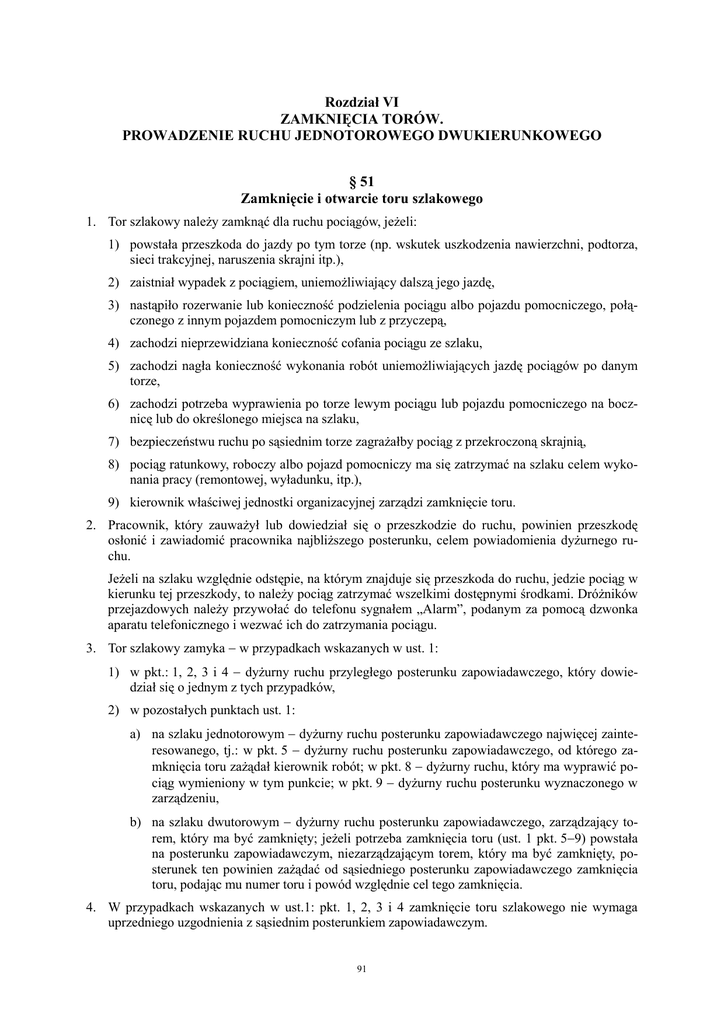 Rozdział VI ZAMKNIĘCIA TORÓW. PROWADZENIE RUCHU JEDNOTOROWEGO DWUKIERUNKOWEGO § 51 Zamknięcie i otwarcie toru szlakowego 1. Tor szlakowy naleŜy zamknąć dla ruchu pociągów, jeŜeli: 1) powstała przeszkoda do jazdy po tym torze (np. wskutek uszkodzenia nawierzchni, podtorza, sieci trakcyjnej, naruszenia skrajni itp.), 2) zaistniał wypadek z pociągiem, uniemoŜliwiający dalszą jego jazdę, 3) nastąpiło rozerwanie lub konieczność podzielenia pociągu albo pojazdu pomocniczego, połączonego z innym pojazdem pomocniczym lub z przyczepą, 4) zachodzi nieprzewidziana konieczność cofania pociągu ze szlaku, 5) zachodzi nagła konieczność wykonania robót uniemoŜliwiających jazdę pociągów po danym torze, 6) zachodzi potrzeba wyprawienia po torze lewym pociągu lub pojazdu pomocniczego na bocznicę lub do określonego miejsca na szlaku, 7) bezpieczeństwu ruchu po sąsiednim torze zagraŜałby pociąg z przekroczoną skrajnią, 8) pociąg ratunkowy, roboczy albo pojazd pomocniczy ma się zatrzymać na szlaku celem wykonania pracy (remontowej, wyładunku, itp.), 9) kierownik właściwej jednostki organizacyjnej zarządzi zamknięcie toru. 2. Pracownik, który zauwaŜył lub dowiedział się o przeszkodzie do ruchu, powinien przeszkodę osłonić i zawiadomić pracownika najbliŜszego posterunku, celem powiadomienia dyŜurnego ruchu. JeŜeli na szlaku względnie odstępie, na którym znajduje się przeszkoda do ruchu, jedzie pociąg w kierunku tej przeszkody, to naleŜy pociąg zatrzymać wszelkimi dostępnymi środkami. DróŜników przejazdowych naleŜy przywołać do telefonu sygnałem „Alarm”, podanym za pomocą dzwonka aparatu telefonicznego i wezwać ich do zatrzymania pociągu. 3. Tor szlakowy zamyka − w przypadkach wskazanych w ust. 1: 1) w pkt.: 1, 2, 3 i 4 − dyŜurny ruchu przyległego posterunku zapowiadawczego, który dowiedział się o jednym z tych przypadków, 2) w pozostałych punktach ust. 1: a) na szlaku jednotorowym − dyŜurny ruchu posterunku zapowiadawczego najwięcej zainteresowanego, tj.: w pkt. 5 − dyŜurny ruchu posterunku zapowiadawczego, od którego zamknięcia toru zaŜądał kierownik robót; w pkt. 8 − dyŜurny ruchu, który ma wyprawić pociąg wymieniony w tym punkcie; w pkt. 9 − dyŜurny ruchu posterunku wyznaczonego w zarządzeniu, b) na szlaku dwutorowym − dyŜurny ruchu posterunku zapowiadawczego, zarządzający torem, który ma być zamknięty; jeŜeli potrzeba zamknięcia toru (ust. 1 pkt. 5−9) powstała na posterunku zapowiadawczym, niezarządzającym torem, który ma być zamknięty, posterunek ten powinien zaŜądać od sąsiedniego posterunku zapowiadawczego zamknięcia toru, podając mu numer toru i powód względnie cel tego zamknięcia. 4. W przypadkach wskazanych w ust.1: pkt. 1, 2, 3 i 4 zamknięcie toru szlakowego nie wymaga uprzedniego uzgodnienia z sąsiednim posterunkiem zapowiadawczym. 91 W innych przypadkach zamknięcie toru szlakowego następuje po uprzednim uzgodnieniu z dyŜurnym ruchu sąsiedniego posterunku zapowiadawczego; jeŜeli sąsiednim posterunkiem zapowiadawczym jest posterunek odgałęźny, to uzgodnienie to powinno nastąpić równieŜ z dyŜurnym ruchu sąsiedniej stacji. Zamknięcie toru zarządza się nadając do sąsiedniego posterunku zapowiadawczego i do pośrednich posterunków ruchu telefonogram według wzoru nr 21: „Tor numer ......... od ........................ do ....................... zamknięty od ............. nazwa posterunku nazwa posterunku godz. min. z powodu (lub celem) …………………..”. W razie potrzeby zamiast „od ……….” moŜna podawać: „po przejeździe pociągu …….”. godz. min. nr JeŜeli szlak jest jednotorowy, słowo „numer” w telefonogramach wzór nr 21 i 22 zastępuje się słowem „szlakowy”. 5. Tor szlakowy zamykać naleŜy między posterunkami zapowiadawczymi. JeŜeli ma być zamknięty tor szlakowy pomiędzy stacją a posterunkiem odgałęźnym, wspólny dla ruchu pociągów jadących przez posterunek odgałęźny na wprost i na odgałęzienie, wówczas: 1) na odcinku jednotorowym − zamknąć naleŜy równieŜ pozostałe tory szlakowe przyległe do posterunku odgałęźnego, 2) na odcinku dwutorowym – gdy nie ma odpowiednich połączeń torów i nie moŜna przejechać na posterunku odgałęźnym z toru prawego na tor lewy lub odwrotnie – zamknąć naleŜy równieŜ odpowiednie tory szlakowe na pozostałych szlakach, przyległych do posterunku odgałęźnego; posterunek odgałęźny czynny jest nadal jako posterunek zapowiadawczy. 6. Z chwilą zamknięcia toru naleŜy go osygnalizować zgodnie z przepisami sygnalizacji oraz zastosować zamknięcia pomocnicze i tabliczki ostrzegawcze według postanowień § 49. 7. Otwarcie toru szlakowego moŜe nastąpić, gdy ustała przyczyna, dla której tor został zamknięty i gdy tor ten jest wolny od przeszkód do ruchu. Gdy były prowadzone roboty, otwarcie toru szlakowego moŜe nastąpić po otrzymaniu od kierownika robót zawiadomienia pisemnego lub telefonicznego według wzoru: „Roboty na torze .............. szlaku ........... zostały ukończone o godzinie .....minut ......... . Tor ten jest zdatny i nie ma przeszkód do ruchu pociągów”. Na końcu zawiadomienia naleŜy podać nazwisko i stanowisko zawiadamiającego. W zawiadomieniu naleŜy podać wymagane ograniczenia prędkości jazdy pociągów. Zawiadomienie o ukończeniu robót kierownik robót przesyła pisemnie do dyŜurnego ruchu najbliŜszego posterunku zapowiadawczego lub dyktuje telefonogram dyŜurnemu ruchu jednego z posterunków zapowiadawczych, przyległych do zamkniętego szlaku. JeŜeli zawiadomienie to otrzymał dyŜurny ruchu, który tego toru nie zamykał, to powinien on natychmiast treść zawiadomienia przekazać dyŜurnemu ruchu, który zamknął tor. Telefonogramy i pisemne zawiadomienia dotyczące zamknięcia toru oraz ukończenia robót i zgłoszenia gotowości toru do podjęcia ruchu nal