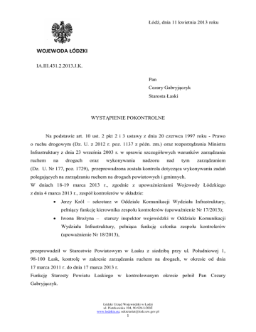 Łódź, dnia 11 kwietnia 2013 roku WOJEWODA ŁÓDZKI IA.III.431.2.2013.J.K. Pan Cezary Gabryjączyk Starosta Łaski WYSTĄPIENIE POKONTROLNE Na podstawie art. 10 ust. 2 pkt 2 i 3 ustawy z dnia 20 czerwca 1997 roku - Prawo o ruchu drogowym (Dz. U. z 2012 r. poz. 1137 z późn. zm.) oraz rozporządzenia Ministra Infrastruktury z dnia 23 września 2003 r. w sprawie szczegółowych warunków zarządzania ruchem na drogach oraz wykonywania nadzoru nad tym zarządzaniem (Dz. U. Nr 177, poz. 1729), przeprowadzona została kontrola dotycząca wykonywania zadań polegających na zarządzaniu ruchem na drogach powiatowych i gminnych. W dniach 18-19 marca 2013 r., zgodnie z upoważnieniami Wojewody Łódzkiego z dnia 4 marca 2013 r., zespół kontrolerów w składzie: Jerzy Król – sekretarz w Oddziale Komunikacji Wydziału Infrastruktury, pełniący funkcję kierownika zespołu kontrolerów (upoważnienie Nr 17/2013); Iwona Brożyna – starszy inspektor wojewódzki w Oddziale Komunikacji Wydziału Infrastruktury, pełniąca funkcję członka zespołu kontrolerów (upoważnienie Nr 18/2013), przeprowadził w Starostwie Powiatowym w Łasku z siedzibą przy ul. Południowej 1, 98-100 Łask, kontrolę w zakresie zarządzania ruchem na drogach, w okresie od dnia 17 marca 2011 r. do dnia 17 marca 2013 r. Funkcję Starosty Powiatu Łaskiego w kontrolowanym okresie pełnił Pan Cezary Gabryjączyk. Łódzki Urząd Wojewódzki w Łodzi ul. Piotrkowska 104, 90-926 ŁÓDŹ www.lodzkie.eu; [email protected] 1 W wyniku przeprowadzonej kontroli działalność Starosty Powiatu Łaskiego w kontrolowanym zakresie ocenia się pozytywnie z uchybieniami, na podstawie niżej wymienionych ustaleń. 1. W zakresie prowadzenia ewidencji projektów zatwierdzonych organizacji ruchu, zwanej dalej „ewidencją”, stwierdzono, że w ewidencji za rok 2011 umieszczono informacje o 45 zatwierdzonych projektach organizacji ruchu , za rok 2012 umieszczono informacje o 44 zatwierdzonych projektach organizacji ruchu, a w roku 2013 do dnia kontroli nie zarejestrowano żadnego projektu organizacji ruchu. Stwierdzono, że ewidencja projektów zatwierdzonych organizacji ruchu prowadzona jest prawidłowo, zawiera wszelkie niezbędne wymagane przepisami prawa zapisy. 2. W zakresie prawidłowości zatwierdzania projektów organizacji ruchu, ich przechowywania oraz spełniania przez projekt organizacji ruchu wymagań określonych w rozporządzeniu Ministra Infrastruktury z dnia 23 września 2003 r. w sprawie szczegółowych warunków zarządzania ruchem na drogach oraz wykonywania nadzoru nad tym zarządzaniem organizacji ruchu ustalono, że skontrolowane projekty czasowych oraz stałych organizacji ruchu zatwierdzone zostały zgodnie z obowiązującymi przepisami tj. posiadały wszelkie niezbędne elementy w wymienione sprawie w szczegółowych rozporządzeniu warunków Ministra zarządzania ruchem Infrastruktury na drogach oraz wykonywania nadzoru nad tym zarządzaniem. Łącznie kontroli poddano, zgodnie z programem kontroli 4 losowo wybrane zatwierdzone w 2011 r. projekty organizacji ruchu, oraz 5 losowo wybranych zatwierdzonych w 2012 r. projektów organizacji ruchu. W 2013 r. nie zatwierdzono jeszcze żadnego projektu organizacji ruchu. Projekty zatwierdzane były przez Starostę Łaskiego lub Kierownika Powiatowego Zarządu Dróg w Łasku, posiadającego w tym zakresie stosowne upoważnienie Starosty Powiatu Łaskiego. 3. W zakresie przeprowadzania przez organ zarządzający ruchem na drogach kontroli prawidłowości zastosowania, wykonania, funkcjonowania i utrzymania wszystkich znaków drogowych, urządzeń sygnalizacji świetlnej, urządzeń sygnalizacji dźwiękowej oraz urządzeń bezpieczeństwa ruchu drogowego umieszczonych na drogach powiatowych i gminnych stwierdzono, że Starosta Łaski w 2011 r. kontrolował wszystkie drogi podległe w gminach: Łask, Buczek, Wodzierady, Sędziejowice, Widawa oraz w mieście Łask. Ustalono, że w 2012 r. Starosta Łaski skontrolował wszystkie drogi powiatowe 2 razy w roku, natomiast podległe drogi Łódzki Urząd Wojewódzki w Łodzi ul. Piotrkowska 104, 90-926 ŁÓDŹ www.lodzkie.eu; [email protected] 2 gminne zostały skontrolowane tylko jeden raz w terminie od 5 lipca 2012 r. do dnia 25 lipca 2012 r. Z przedstawionej dokumentacji wynika, że nie przeprowadzono wymaganej kontroli dróg gminnych w I połowie 2012 r. W 2013 r. skontrolowano wszystkie drogi powiatowe w terminie od dnia 19 lutego 2013 r. do dnia 26 lutego 2013 r. oraz rozpoczęto i kontynuuje się zgodnie z założeniami kontrole podległych dróg gminnych. Z przeprowadzanych kontroli sporządzano protokoły, na podstawie których podejmowano działania mające na celu wyeliminowanie nieprawidłowości, wzywając zarządców dróg gminnych do ich usunięcia. Nieprawidłowości ujawnione na drogach powiatowych usuwane są własnymi służbami liniowymi. 4. W zakresie wykonywania zadań technicznych wynikających z realizacji projektu zgodnie z § 12 ust. 3 rozporządzenia Ministra Infrastruktury z dnia 23 września 2003 r., w sprawie szczegółowych warunków zarządzania ruchem na drogach ustalono, że organ zarządzający ruchem na drogach powiatowych i gminnych w powiecie Łaskim, przeprowadzał kontrole związane z wprowadzeniem stałej organizacji ruchu na drogach podległych, w ustawowym terminie do 14 dni od dnia wprowadzenia organizacji ruchu. W okresie objętym kontrolą przeprowadzono 1 kontrolę wykonania zadań technicznych wynikających z realizacji projektu. Reasumując, zarządzanie ruchem na drogach powiatowych i gminnych w powiecie Łaskim ocenia się pozytywnie z uchybieniami. Powyżej opisane ustalenia uzasadniają wydanie jednostce kontrolowanej oceny pozytywnej z uchybieniami, w przedmiocie i okresie objętym kontrolą. Kontrolerzy wpisali się do książki kontroli Starostwa Powiatowego w Łasku pod pozycją nr 6. Projekt wystąpienia pokontrolnego z dnia 28 marca 2013 r. został przekazany do St