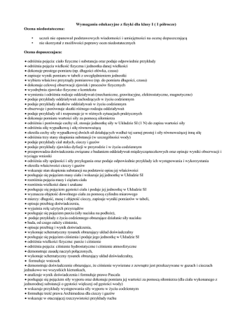 Wymagania edukacyjne z fizyki dla klasy I ( I półrocze) Ocena niedostateczna: • • uczeń nie opanował podstawowych wiadomości i umiejętności na ocenę dopuszczającą nie skorzystał z możliwości poprawy ocen niedostatecznych Ocena dopuszczajaca: odróżnia pojęcia: ciało fizyczne i substancja oraz podaje odpowiednie przykłady odróżnia pojęcia wielkość fizyczna i jednostka danej wielkości dokonuje prostego pomiaru (np. długości ołówka, czasu) zapisuje wynik pomiaru w tabeli z uwzględnieniem jednostki wybiera właściwe przyrządy pomiarowe (np. do pomiaru długości, czasu) dokonuje celowej obserwacji zjawisk i procesów fizycznych wyodrębnia zjawisko fizyczne z kontekstu wymienia i odróżnia rodzaje oddziaływań (mechaniczne, grawitacyjne, elektrostatyczne, magnetyczne) podaje przykłady oddziaływań zachodzących w życiu codziennym podaje przykłady skutków oddziaływań w życiu codziennym obserwuje i porównuje skutki różnego rodzaju oddziaływań podaje przykłady sił i rozpoznaje je w różnych sytuacjach praktycznych dokonuje pomiaru wartości siły za pomocą siłomierza odróżnia i porównuje cechy sił, stosuje jednostkę siły w Układzie SI (1 N) do zapisu wartości siły odróżnia siłę wypadkową i siłę równoważącą określa cechy siły wypadkowej dwóch sił działających wzdłuż tej samej prostej i siły równoważącej inną siłę odróżnia trzy stany skupienia substancji (w szczególności wody) podaje przykłady ciał stałych, cieczy i gazów podaje przykłady zjawiska dyfuzji w przyrodzie i w życiu codziennym przeprowadza doświadczenia związane z badaniem oddziaływań międzycząsteczkowych oraz opisuje wyniki obserwacji i wyciąga wnioski odróżnia siły spójności i siły przylegania oraz podaje odpowiednie przykłady ich występowania i wykorzystania określa właściwości cieczy i gazów wskazuje stan skupienia substancji na podstawie opisu jej właściwości posługuje się pojęciem masy ciała i wskazuje jej jednostkę w Układzie SI rozróżnia pojęcia masy i ciężaru ciała rozróżnia wielkości dane i szukane posługuje się pojęciem gęstości ciała i podaje jej jednostkę w Układzie SI wyznacza objętość dowolnego ciała za pomocą cylindra miarowego mierzy: długość, masę i objętość cieczy, zapisuje wyniki pomiarów w tabeli, opisuje przebieg doświadczenia, wyjaśnia rolę użytych przyrządów posługuje się pojęciem parcia (siły nacisku na podłoże), podaje przykłady z życia codziennego obrazujące działanie siły nacisku bada, od czego zależy ciśnienie, opisuje przebieg i wynik doświadczenia, wykonuje schematyczny rysunek obrazujący układ doświadczalny posługuje się pojęciem ciśnienia i podaje jego jednostkę w Układzie SI odróżnia wielkości fizyczne: parcie i ciśnienie odróżnia pojęcia: ciśnienie hydrostatyczne i ciśnienie atmosferyczne demonstruje zasadę naczyń połączonych, wykonuje schematyczny rysunek obrazujący układ doświadczalny, formułuje wniosek demonstruje doświadczenie obrazujące, że ciśnienie wywierane z zewnątrz jest przekazywane w gazach i cieczach jednakowo we wszystkich kierunkach, analizuje wynik doświadczenia i formułuje prawo Pascala posługuje się pojęciem siły wyporu oraz dokonuje pomiaru jej wartości za pomocą siłomierza (dla ciała wykonanego z jednorodnej substancji o gęstości większej od gęstości wody) wskazuje przykłady występowania siły wyporu w życiu codziennym formułuje treść prawa Archimedesa dla cieczy i gazów wskazuje w otaczającej rzeczywistości przykłady ruchu odróżnia pojęcia tor, droga i wykorzystuje je do opisu ruchu odróżnia ruch prostoliniowy od ruchu krzywoliniowego, podaje przykłady wykorzystuje wielkości fizyczne: droga, prędkość, czas do opisu ruchu jednostajnego prostoliniowego, wskazuje w otaczającej rzeczywistości przykłady tego ruchu posługuje się pojęciem prędkości do opisu ruchu, interpretuje wartość prędkości jako drogę przebytą przez poruszające się ciało w jednostce czasu, np. 1 s posługuje się jednostką prędkości w Układzie SI, przelicza jednostki prędkości (przelicza wielokrotności i podwielokrotności) odczytuje dane z tabeli oraz prędkość i przebytą odległość z wykresów zależności drogi i prędkości od czasu w ruchu jednostajnym prostoliniowym wykorzystuje wielkości fizyczne: droga, prędkość, czas do opisu ruchu niejednostajnego prostoliniowego, wskazuje w otaczającej rzeczywistości przykłady tego ruchu i odróżnia go od ruchu jednostajnego prostoliniowego wskazuje w otaczającej rzeczywistości przykłady ruchu jednostajnie przyspieszonego prostoliniowego wykorzystuje wielkości fizyczne: droga, prędkość, czas do opisu ruchu niejednostajnego prostoliniowego, wskazuje w otaczającej rzeczywistości przykłady tego ruchu i odróżnia go od ruchu jednostajnego prostoliniowe gowskazuje w otaczającej rzeczywistości przykłady ruchu jednostajnie przyspieszonego prostoliniowego posługuje się pojęciem przyspieszenia do opisu ruchu prostoliniowego jednostajnie zmiennego odczytuje prędkość i przyspieszenie z wykresów zależności prędkości i przyspieszenia od czasu w ruchu jednostajnie przyspieszonym prostoliniowym wyodrębnia ruch jednostajny prostoliniowy i ruch jednostajnie przyspieszony prostoliniowy z kontekstu Ocena dostateczna: Uczeń ponadto: klasyfikuje fizykę jako naukę przyrodniczą podaje przykłady powiązań fizyki z życiem codziennym wymienia podstawowe metody badawcze stosowane w naukach przyrodniczych posługuje się symbolami długości, masy, czasu i ich jednostkami w Układzie SI przelicza wielokrotności i podwielokrotności (przedrostki: mikro-, mili-, centy-); przelicza jednostki czasu (sekunda, minuta, godzina) szacuje rząd wielkości spodziewanego wyniku pomiaru np. Długości wykonuje schematyczny rysunek obrazujący pomiar np. Długości wyjaśnia, w jakim celu powtarza się p