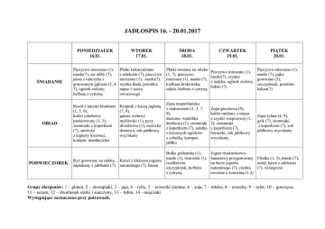 JADŁOSPIS 16. - 20.01.2017 PONIEDZIAŁEK 16.01. WTOREK 17.01. ŚRODA 18.01. ŚNIADANIE Pieczywo mieszane (1), masło(7), ser żółty (7), pasta z tuńczyka z gotowanym jajkiem (3, 4, 7), ogórek zielony, herbata z cytryną Płatki kukurydziane z mlekiem (7), pieczywo mieszane (1), masło(7), szynka biała, pomidor, napar z suszu owocowego Płatki owsiane na mleku (1, 7), pieczywo mieszane (1), masło (7), kiełbasa krakowska, sałata, herbata z cytryną Pieczywo mieszane (1), Pieczywo mieszane (1), masło (7), jajko masło(7), szynka gotowane (3), z indyka, ogórek zielony, szczypiorek, pomidor, kakao (7) kakao(7) OBIAD Rosół z lanymi kluskami (1, 3, 9), kotlet schabowy panierowany (1, 3), ziemniaki z koperkiem (7), surówka z kapusty kiszonej, kompot, mandarynka Krupnik z kaszą jaglaną (7, 9), gulasz wołowy myśliwski (1), pyzy drożdżowe (1), surówka domowa, sok jabłkowy wyciskany Zupa neapolitańska z makaronem (1, 3, 7, 9), duszona wątróbka drobiowa (1), ziemniaki z koperkiem (7), sałatka z kiszonych ogórków z cebulką, kompot, jabłko Zupa grochowa (9), kotlet mielony z mięsa z szynki wieprzowej (1, 3), ziemniaki z koperkiem (7), buraczki, sok jabłkowy wyciskany Bułka grahamka (1), masło (1), twarożek (1), rzodkiewki, szczypiorek, herbata z cytryną Jogurt truskawkowobananowy przygotowany Chałka (1, 3), masło (7), na bazie jogurtu miód, kawa z mlekiem naturalnego (7), ciastka (7), winogrono owsiane z żurawiną (1,3) PODWIECZOREK Ryż gotowany na mleku , Kisiel z kleksem jogurtu zapiekany z jabłkami (7) naturalnego (7), banan CZWARTEK 19.01. PIĄTEK 20.01. Zupa rybna (4, 9), gzik (7), ziemniaki z koperkiem (7), sok jabłkowy wyciskany Grupy alergenów: 1 – gluten, 2 – skorupiaki, 3 – jaja, 4 – ryby, 5 – orzeszki ziemne, 6 – soja, 7 – mleko, 8 – orzechy, 9 – seler, 10 – gorczyca, 11 – sezam, 12 – dwutlenek siarki i siarczyny, 13 – łubin, 14 - mięczaki Występujące zaznaczono przy potrawach.