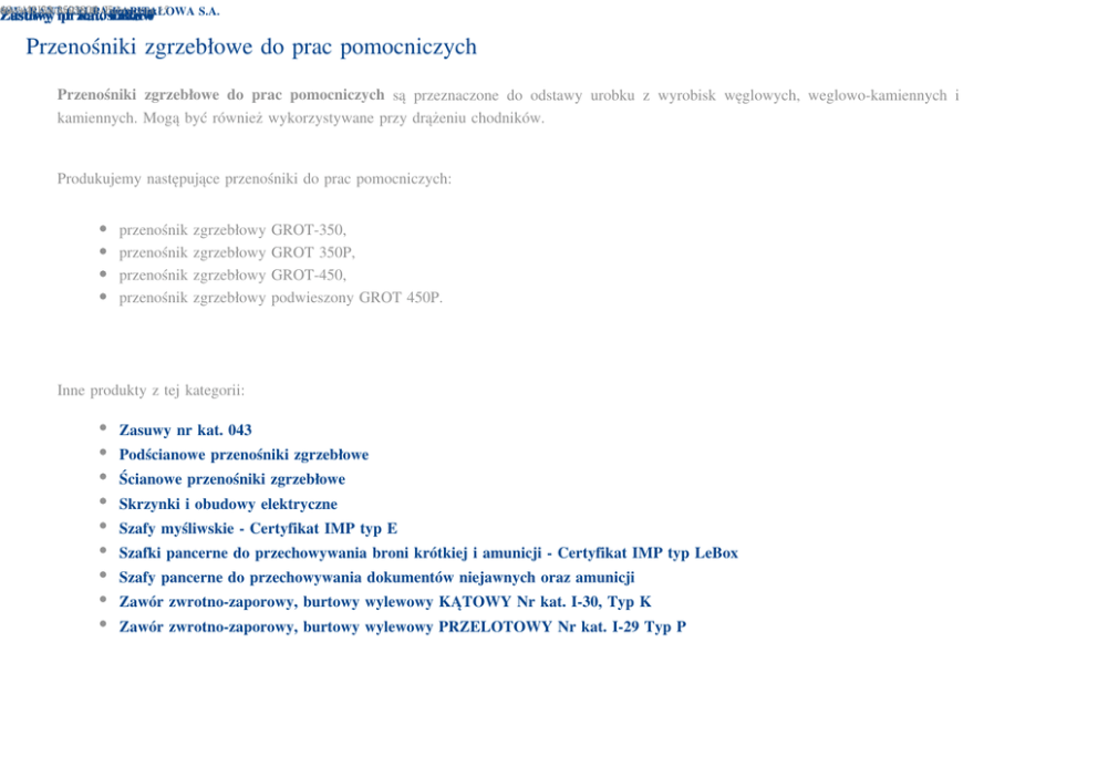 40-611 tel. fax +48Katowice, 32 3593800-05 3593806 ul. Fabryczna 15 GWARANT GRUPA KAPITAŁOWA S.A. Zasuwy Zestawy nr przenośników kat. ZR150 190S 122 122SW 055 Przenośniki zgrzebłowe do prac pomocniczych Przenośniki zgrzebłowe do prac pomocniczych są przeznaczone do odstawy urobku z wyrobisk węglowych, weglowo-kamiennych i kamiennych. Mogą być również wykorzystywane przy drążeniu chodników. Produkujemy następujące przenośniki do prac pomocniczych: przenośnik przenośnik przenośnik przenośnik zgrzebłowy zgrzebłowy zgrzebłowy zgrzebłowy GROT-350, GROT 350P, GROT-450, podwieszony GROT 450P. Inne produkty z tej kategorii: Zasuwy nr kat. 043 Podścianowe przenośniki zgrzebłowe Ścianowe przenośniki zgrzebłowe Skrzynki i obudowy elektryczne Szafy myśliwskie - Certyfikat IMP typ E Szafki pancerne do przechowywania broni krótkiej i amunicji - Certyfikat IMP typ LeBox Szafy pancerne do przechowywania dokumentów niejawnych oraz amunicji Zawór zwrotno-zaporowy, burtowy wylewowy KĄTOWY Nr kat. I-30, Typ K Zawór zwrotno-zaporowy, burtowy wylewowy PRZELOTOWY Nr kat. I-29 Typ P