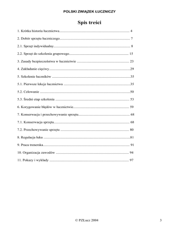 POLSKI ZWIĄZEK ŁUCZNICZY Spis treści 1. Krótka historia łucznictwa.............................................................................. 4 2. Dobór sprzętu łuczniczego.............................................................................. 7 2.1. Sprzęt indywidualny..................................................................................... 8 2.2. Sprzęt do szkolenia grupowego.................................................................. 15 3. Zasady bezpieczeństwa w łucznictwie .......................................................... 23 4. Zakładanie cięciwy..........................................................................................29 5. Szkolenie łuczników .......................................................................................35 5.1. Pierwsze lekcje łucznictwa ..........................................................................35 5.2. Celowanie ....................................................................................................50 5.3. Średni etap szkolenia .................................................................................. 53 6. Korygowanie błędów w łucznictwie.............................................................. 59 7. Konserwacja i przechowywanie sprzętu......................................................... 68 7.1. Konserwacja sprzętu.................................................................................... 68 7.2. Przechowywanie sprzętu ............................................................................ 80 8. Regulacja łuku ................................................................................................81 9. Praca trenerska................................................................................................ 91 10. Organizacja zawodów ................................................................................. 94 11. Pokazy i wykłady ........................................................................................ 97 © PZŁucz 2004 3 POLSKI ZWIĄZEK ŁUCZNICZY 1. Krótka historia łucznictwa Wielu badaczy dziejów ludzkości sądzi, że historia łuku sięga w przeszłość do ery paleozoicznej (epoka kamienia łupanego), tj, okresu, który zakończył się około roku 8000 p.n.e. Jest to potwierdzone wizerunkami łuczników odkrytymi w jaskiniach hiszpańskich, datowanymi na okres górnego paieozoiku. Groty strzał odłupane z kamienia stanowiły tu dowód, na którym archeologowie oparli swoje teorie. Ślady łucznictwa starożytnego były znajdowane na całym świecie, także w Australii, mimo iż wcześniej uważano, że łuk nie był tam używany. Łuk był prawdopodobnie wynaleziony przez przypadek, lecz walczy o doniosłość z odkryciem ognia i wynalazkiem koła w rozwoju kulturowym człowieka, od kiedy stał się jednym z pierwszych usiłowań człowieka, aby zmagazynować energię - łuk jest napinany i przy zwalnianiu energia naciągniętego łuku jest przekazywana strzale, która zostaje wyrzucona do przodu. Pomiędzy ludami starożytnymi Egipcjanie byli pierwszymi świetnymi łucznikami, wykorzystującymi łuk jako swą główną broń podczas zmagań wojennych. Ich łuki były nieco krótsze niż wzrost człowieka, a długość strzały wahała się od 61 do 81 cm. Pomimo że groty krzemienne nie należały do rzadkości, najczęściej używanym materiałem był brąz. W tym czasie również Izraelici używali łuków wykonywanych z trzciny, drewna, rogu - zarówno na wojnie, jak i na polowaniu. Ten okres historii łuku na Bliskim Wschodzie pokrywał się z czasem pisania Biblii, która zawiera liczne odniesienia na jego temat. Wiele innych grup miało również wkład w łucznictwo w tamtych czasach. Narodem łuczników byli Asyryjczycy, w przeciwieństwie do Greków, którzy w swoich armiach mieli Kreteńskich łuczników. Rzymianie, podobnie jak Grecy, nie byli zbyt dobrze obeznani z łucznictwem, lecz jako łuczników werbowali do swoich legionów również Kreteńczyków, a ponadto Azjatów. Ich stosunek do łucznictwa zmienił się, kiedy został zburzony stary system legionów. Od 378 r. n.e. armie imperium liczyły wielu łuczników konnych. Attyla, król Hunów i Dżyngis Chan. Attyla, „Bicz Boski", grasował ze swoim oddziałem wojowników Chinach i we wschodniej części imperium rzymskiego, dochodząc aż do Dunaju i Renu. Hunowie byli ludem koczowniczym, strzelającym konno, długo nieśli zniszczenie i byli niepokonani, aż dopiero legiony rzymskie ostatecznie pogromiły Attytę pod Chalonssur-Marne we Francji w 451 r. n.e. Z kolei Dżyngis Chan (1162-1227) był wodzem grupy małych plemion mongolskich i w szczytowym okresie swoich podbojów zajmował tereny Chin, Indii, Iranu i Rosji- Podobnie jak Attyla wiele sukcesów zawdzięczał świetnej strategii wojskowej i szybkiemu ogniowi wielkiej liczby strzał wystrzeliwanych przez tuczników z grzbietów końskich. Łucznictwo w średniowieczu Wielu historyków uważa, że długi łuk przybył do Anglii wraz Wilhelmem Zdobywcą, księciem Normandii, który przepłynął kanał La Manche i zaatakował południowe wybrzeże wyspy. Król Anglii Harold został zabity przez normańską strzałę i wtedy Anglicy docenili wartość łuku jako narzędzia walki. © PZŁucz 2004 4 POLSKI ZWIĄZEK ŁUCZNICZY Wojna stuletnia (1337-1453) trwała przez okres rządów pięciu królów francuskich i angielskich. Łuk podczas niej stał się znaczącym środkiem bojowym. Angielscy łucznicy i piechota wygrała trzy wielkie bitwy podczas tego okresu. Pierwszym i największym zwycięstwem była bitwa pod Grecy w 1346 r. W tej bitwie pierwsze szeregi armii francuskiej składały się z olbrzymich kuszników genueńskich skierowanych do walki z angielskimi łucznikami. W związku z kilkoma burzami i zwiększoną wilgotnością powietrza Genueńczycy ponieśli klęskę, ponieważ ich cięciwy nie były zabezpieczone przed wodą. Cięciwy