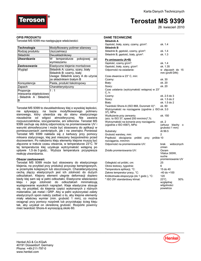 Karta Danych Technicznych Terostat MS 9399 26 kwiecień-2010 OPIS PRODUKTU Terostat MS 9399 ma następujące właściwości: Technologia Rodzaj produktu Składniki Utwardzanie Zastosowanie Wygląd Konsystencja Zapach Proporcje mieszania objętościowo - Składnik A : Składnik B Modyfikowany polimer silanowy Uszczelniacz Dwuskładnikowy W temperaturze pokojowej po wymieszaniu Elastyczne klejenie montażowe Składnik A: czarny, szary, biały Składnik B: czarny, biały Uwaga: Składnik szary A do użycia ze składnikiem białym B Pasta, produkt tiskotropowy Charakterystyczny 1:1 Terostat MS 9399 to dwuskładnikowy klej o wysokiej lepkości, nie spływający, na bazie modyfikowanego polimeru sianowego, który utwardza się do stanu elastycznego niezależnie od wilgoci atmosferycznej. Nie zawiera rozpuszczalników, izocyjanianów, ani silikonów. Terostat MS 9399 cechuje się dobrą odpornością na promieniowanie UV i warunki atmosferyczne i może być stosowany do aplikacji w pomieszczeniach zamkniętych, jak i na zewnątrz. Ponieważ Terostat MS 9399 nakłada się z kartuszy przy pomocy miksera statycznego, klej jest mieszany bezpośrednio przed dozowaniem. Po nałożeniu kleju elementy klejone muszą być złączone w trakcie czasu otwarcia, w temperaturze 23°C. W tej temperaturze klej uzyskuje wytrzymałość wstępną po upływie 1,5 do 3 godz.. Wyższa temperatura przyspiesza reakcję utwardzania. Obszar zastosowań: Terostat MS 9399 może być stosowany do elastycznego klejenia, na przykład przy produkcji przyczep kempingowych, w przemyśle kolejowym lub stoczniowym. Charakterystyczną cechą złączy elastycznych jest ich zdolność do dużych odkształceń. Klejony element ulegnie deformacji dopiero kiedy klej sam się w pełni odkształci. Elastyczne właściwości kleju i jego zdolność do odkształceń minimalizują występowanie wysokich naprężeń. Kleje elastyczne stosuje się, na przykład, do klejenia części wykonanych z różnych materiałów, jak metal i GRP. Aby w pełni wykorzystać zalety elastycznych spoin należy zadbać o to, aby klejone elementy miały właściwy wymiar (min. grubość 1 mm), co można osiągnąć przy pomocy rozpórek lub przyciskając ścieg kleju tak, aby uzyskał on określoną grubość. Rozpórki powinny mieć twardość Shore-A wynoszącą około 60. DANE TECHNICZNE Składnik A Gęstość, biały, szary, czarny, g/cm³: Składnik B Składnik B, gęstość, czarny, g/cm³: Składnik B, gęstość, biały, g/cm³: Po zmieszaniu (A+B) Gęstość, czarny g/cm³: Gęstość, biały, szary, g/cm³: Odporność na osiadanie: ok. 1.4 ok. 1.4 ok. 1.3 ok. 1.4 ok. 1.35 w złączach do 15 mm (profil DIN) Czas otwarcia w 23° C, min: Czarny: ok. 30 Biały: ok. 20 Szary: ok. 20 Czas ustalania (wytrzymałość wstępna) w 23° C, h: Czarny: ok. 2.5 do 3 Szary: ok. 1.5 do 2 Biały: ok. 1.5 do 2 Twardość Shore-A (ISO 868, Durometr A)*: ok. 60 Wytrzymałość na rozciąganie (zgodnie z ISO ok. 3.0 37), MPa: Wydłużenie przy zerwaniu ok. 150 (acc. to ISO 37, speed 200 mm/min)*,%: Wytrzymałość na ścinanie przy rozciąganiu ok. 2 (zgodnie z ISO 4587), MPa: (arkusz blachy o grubości 1 mm) Substraty: Al 99.5 Grubość warstwy, mm: 2 Prędkość obciążania próbki przy próbie 10 rozciągania, mm/min: Odporność na promieniowanie UV: brak widocznych zmian Źródło promieniowania UV: Osram Vitalux 300W, suche promieniowanie UV Odległość od próbki, cm: 25 Okres testowy, tygodnie: 6 Temperatura aplikacji, °C: 15 do 40 Zakres temperatur pracy, °C: -40 do +100 Krótkotrwała ekspozycja (do 1 godz.), °C: 120 * ISO 291 standardowy klimat: 23°C, 50% względnej wilgotności powietrza ______________________________________________________________________________________________________ Henkel AG & Co.KGaA 40191 Düsseldorf. Germany Phone: +49-211-797-0 www.henkel.com WSKAZÓWKI DOTYCZĄCE UŻYCIA Uwaga wstępna: Przed użyciem kleju koniecznie należy zapoznać się z Kartą Charakterystyki, która opisuje środki ostrożności i zasady stosowania produktu. Również w przypadku produktów nie objętych obowiązkiem znakowania ze względu na bezpieczeństwo pracy, należy zawsze zachować ogólne środki ostrożności związane ze stosowaniem środków chemicznych. Przygotowanie powierzchni: Klejone powierzchnie muszą być suche, oczyszczone i odtłuszczone. W zależności od rodzaju powierzchni może wystąpić konieczność jej mechanicznego szorstkowania lub zastosowania podkładu w celu polepszenia adhezji. Do powierzchni wykonanych z tworzyw sztucznych zaleca się stosowanie Terostat 450. Do produkcji tworzyw sztucznych często stosuje się zewnętrzne środki antyadhezyjne, które muszą być całkowicie usunięte przed rozpoczęciem aplikacji klejenia lub uszczelniania. Ze względu na różny skład lakierów, a w szczególności lakierów proszkowych i dużą liczbę różnych substratów, należy przeprowadzić próbne aplikacje. Podczas klejenia i uszczelniania takich substratów jak PMMA, np. Plexiglas®, poliwęglanów, np. Makrolon® lub Lexan® istnieje niebezpieczeństwo powstawania pęknięć naprężeniowych. Przed użyciem należy koniecznie przeprowadzić próbne aplikacje. Terostat MS 937 nie ma przyczepności do polietylenu, polipropylenu ani PTFE. W przypadku substratów nie wymienionych powyżej zalecamy przeprowadzenie aplikacji próbnych. INFORMACJE DODATKOWE Klauzula zrzeczenia się odpowiedzialności: Podane informacje, szczególnie zalecenia odnośnie aplikacji i stosowania pasty są oparte na naszej wiedzy i doświadczeniu. Ze względu na wielką różnorodność materiałów i będące poza naszym wpływem zróżnicowane warunki pracy, zalecamy każdorazowo przeprowadzenie testów w celu sprawdzenia przydatności naszych produktów do konkretnego procesu lub aplikacji. Ani wskazówki zawarte w niniejszej karcie technicznej, ani porady udzielone ustnie nie mogą być podstawą do odpowiedzialności, jeżeli nie wynikn