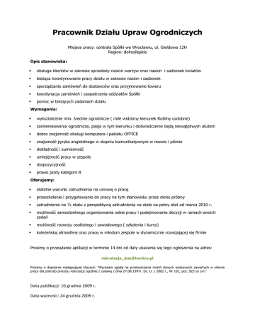 Pracownik Działu Upraw Ogrodniczych Miejsce pracy: centrala Spółki we Wrocławiu, ul. Giełdowa 12H Region: dolnośląskie Opis stanowiska: obsługa klientów w zakresie sprzedaŜy nasion warzyw oraz nasion i sadzonek kwiatów bieŜąca koordynowanie pracy działu w zakresie nasion i sadzonek sporządzanie zamówień do dostawców oraz przyjmowanie towaru koordynacja zamówień i zaopatrzenia oddziałów Spółki pomoc w bieŜących zadaniach działu Wymagania: wykształcenie min. średnie ogrodnicze ( mile widziany kierunek Rośliny ozdobne) zainteresowania ogrodnicze, pasja w tym kierunku i doświadczenie będą niewątpliwym atutem dobra znajomość obsługi komputera i pakietu OFFICE znajomość języka angielskiego w stopniu komunikatywnym w mowie i piśmie dokładność i sumienność umiejętność pracy w zespole dyspozycyjność prawo jazdy kategorii B Oferujemy: stabilne warunki zatrudnienia na umowę o pracę przeszkolenie i przygotowanie do pracy na tym stanowisku przez okres próbny zatrudnienie na ½ etatu z perspektywą zatrudnienia na stałe na pełny etat od marca 2010 r. moŜliwość samodzielnego organizowania sobie pracy i podejmowania decyzji w ramach swoich zadań moŜliwość rozwoju osobistego i zawodowego ( szkolenia i kursy) koleŜeńską atmosferę oraz pracę w młodym zespole w dynamicznie rozwijającej się firmie Prosimy o przesyłanie aplikacji w terminie 14 dni od daty ukazania się tego ogłoszenia na adres: [email protected] Prosimy o dopisanie następującej klauzuli: "WyraŜam zgodę na przetwarzanie moich danych osobowych zawartych w ofercie pracy dla potrzeb procesu rekrutacji zgodnie z ustawą z dnia 27.08.1997r. Dz. U. z 2002 r., Nr 101, poz. 923 ze zm." Data publikacji: 10 grudnia 2009 r. Data ważności: 24 grudnia 2009 r.