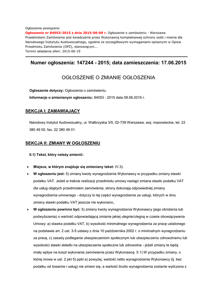 Ogłoszenie powiązane: Ogłoszenie nr 84053-2015 z dnia 2015-06-09 r. Ogłoszenie o zamówieniu - Warszawa Przedmiotem Zamówienia jest świadczenie przez Wykonawcę kompleksowej ochrony osób i mienia dla Narodowego Instytutu Audiowizualnego, zgodnie ze szczegółowymi wymaganiami opisanymi w Opisie Przedmiotu Zamówienia (OPZ), stanowiącym... Termin składania ofert: 2015-06-19 Numer ogłoszenia: 147244 - 2015; data zamieszczenia: 17.06.2015 OGŁOSZENIE O ZMIANIE OGŁOSZENIA Ogłoszenie dotyczy: Ogłoszenia o zamówieniu. Informacje o zmienianym ogłoszeniu: 84053 - 2015 data 09.06.2015 r. SEKCJA I: ZAMAWIAJĄCY Narodowy Instytut Audiowizualny, ul. Wałbrzyska 3/5, 02-739 Warszawa, woj. mazowieckie, tel. 22 380 49 00, fax. 22 380 49 01. SEKCJA II: ZMIANY W OGŁOSZENIU II.1) Tekst, który należy zmienić: Miejsce, w którym znajduje się zmieniany tekst: IV.3). W ogłoszeniu jest: 5) zmiany kwoty wynagrodzenia Wykonawcy w przypadku zmiany stawki podatku VAT. Jeżeli w trakcie realizacji przedmiotu umowy nastąpi zmiana stawki podatku VAT dla usług objętych przedmiotem zamówienia, strony dokonają odpowiedniej zmiany wynagrodzenia umownego - dotyczy to tej części wynagrodzenia za usługi, których w dniu zmiany stawki podatku VAT jeszcze nie wykonano,. W ogłoszeniu powinno być: 5) zmiany kwoty wynagrodzenia Wykonawcy (jego obniżenia lub podwyższenia) o wartość odpowiadającą zmianie jakiej ulegnie/ulegną w czasie obowiązywania Umowy: a) stawka podatku VAT, b) wysokość minimalnego wynagrodzenia za pracę ustalonego na podstawie art. 2 ust. 3-5 ustawy z dnia 10 października 2002 r. o minimalnym wynagrodzeniu za pracę, c) zasady podlegania ubezpieczeniom społecznym lub ubezpieczeniu zdrowotnemu lub wysokości stawki składki na ubezpieczenia społeczne lub zdrowotne - jeżeli zmiany te będą miały wpływ na koszt wykonania zamówienia przez Wykonawcę. 5.1) W przypadku zmiany, o której mowa w ust. 2 pkt 5) ppkt a) powyżej, wartość netto wynagrodzenia Wykonawcy (tj. bez podatku od towarów i usług) nie zmieni się, a wartość brutto wynagrodzenia zostanie wyliczona z uwzględnieniem stawki podatku od towarów i usług, wynikającej ze zmienionych przepisów. 5.2) W przypadku zmiany, o której mowa w ust. 2 pkt 5) ppkt b) i c) powyżej, wynagrodzenie Wykonawcy zostanie podwyższone lub obniżone o wartość, o jaką wzrosną koszty wykonania Zamówienia przez Wykonawcę, wynikającą ze zmian: wysokości wynagrodzenia minimalnego za pracę, wysokości stawki składki na ubezpieczenia społeczne lub zdrowotne lub zasad podlegania tym ubezpieczeniom. 5.3) W przypadkach, o których mowa w ust. 2 pkt 5) ppkt a), b) i c), w sytuacji zaistnienia podstaw do zwiększenia wynagrodzenia, Wykonawca jest zobowiązany złożyć Zamawiającemu pisemny wniosek o podwyższenie wynagrodzenia w tym zakresie wraz z uzasadnieniem i przedstawić Zmawiającemu bez zbędnej zwłoki niezbędne dokumenty i stosowne wyliczenia wykazujące poniesienie wyższych kosztów w związku ze zmianą stawki podatku VAT lub trybu naliczania lub wysokości składek na ubezpieczenia społeczne lub zdrowotne lub zmianą wysokości minimalnego wynagrodzenia za pracę w terminie umożliwiającym Zamawiającemu sprawdzenie w okresie 3 dni roboczych poprawności przedłożonych dokumentów, a zwłaszcza zasadności zawartych w nich wyliczeń, w celu zgłoszenia ewentualnych zastrzeżeń oraz podpisanie aneksu do umowy w tym zakresie i wystawienie faktury w prawidłowo naliczonej wysokości za usługi, których w momencie wejścia w życie nowych regulacji jeszcze nie wykonano. 5.4) W sytuacji zgłoszenia przez Zamawiającego zastrzeżeń w zakresie poprawności dokumentów i zasadności wyliczeń, o których mowa w pkt 5.3) powyżej, Wykonawca ma obowiązek niezwłocznie, nie później niż w terminie 3 dni roboczych, ustosunkować się do zgłoszonych zastrzeżeń. W razie zwłoki Wykonawcy w dostarczeniu dokumentów i wyliczeń, o których mowa w pkt 5.3) lub zwłoki w odniesieniu się do zgłoszonych przez Zamawiającego zastrzeżeń w ww. terminie, Zamawiający zastrzega możliwość nieuwzględnienia kwot waloryzacyjnych za okres pozostawania w zwłoce. 5.5) W przypadkach, o których mowa w ust. 2 pkt 5) ppkt a), b) i c), w sytuacji zaistnienia podstaw do obniżenia wynagrodzenia, Zamawiający poinformuje pisemnie Wykonawcę o zmniejszeniu wynagrodzenia przedstawiając stosowne obliczenia w terminie umożliwiającym podpisanie aneksu w tym zakresie i wystawienie faktury w prawidłowo naliczonej wysokości za usługi, których w momencie wejścia w życie nowych regulacji jeszcze nie wykonano. W takiej sytuacji Wykonawca, na wezwanie Zamawiającego, jest zobowiązany do udzielenia informacji i przedstawienia do wglądu niezbędnych dokumentów umożliwiających dokonanie Zamawiającemu stosownych obliczeń.. Miejsce, w którym znajduje się zmieniany tekst: IV.4.4). W ogłoszeniu jest: 19.06.2015. W ogłoszeniu powinno być: 22.06.2015.