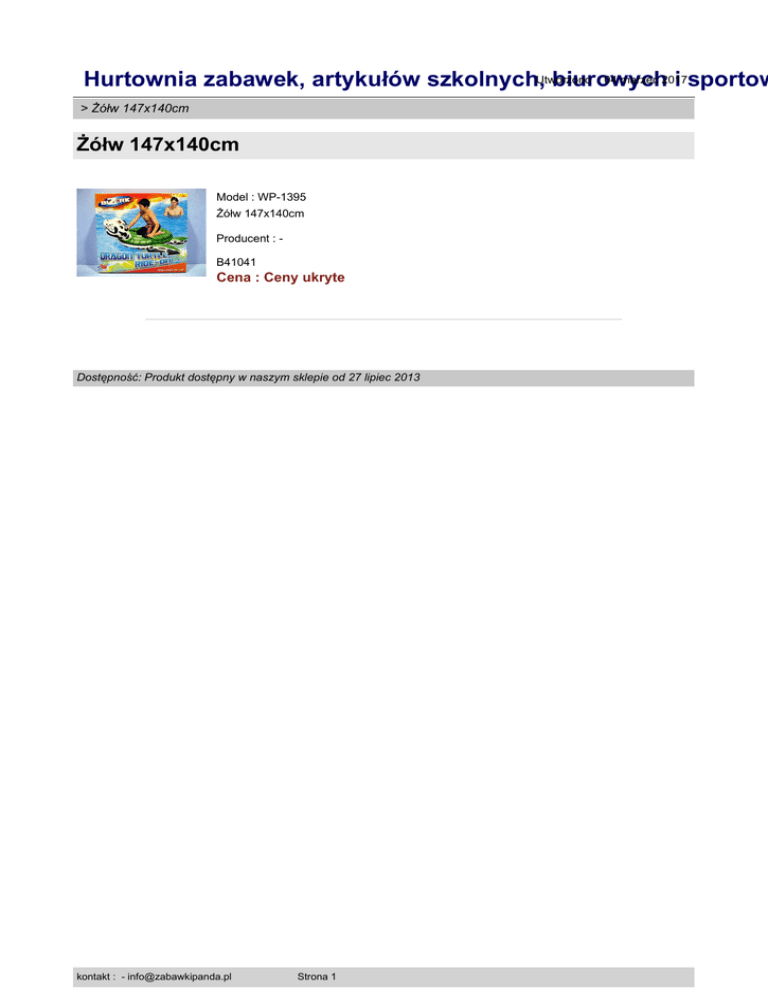 : 04 marzec 2017 Hurtownia zabawek, artykułów szkolnych,Utworzono biurowych i sportow > Żółw 147x140cm Żółw 147x140cm Model : WP-1395 Żółw 147x140cm Producent : B41041 Cena : Ceny ukryte Dostępność: Produkt dostępny w naszym sklepie od 27 lipiec 2013 kontakt : - [email protected] Strona 1