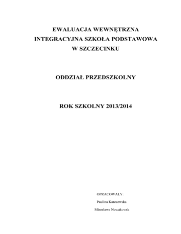 EWALUACJA WEWNĘTRZNA INTEGRACYJNA SZKOŁA PODSTAWOWA W SZCZECINKU ODDZIAŁ PRZEDSZKOLNY ROK SZKOLNY 2013/2014 OPRACOWAŁY: Paulina Karczewska Mirosława Nowakowsk Wymagania 2. Procesy wspomagania rozwoju i edukacji dzieci są zorganizowane w sposób sprzyjający uczeniu się. 3. Dzieci nabywają wiadomości i umiejętności określone w podstawie programowej. W ramach ewaluacji wewnętrznej w Integracyjnej Szkoły Podstawowej w Szczecinku na przełomie marca i kwietnia przeprowadzona została wśród nauczyciela i rodziców ankieta mająca na celu zbadanie efektywności działalności dydaktycznej. W szczególności zwrócona uwagę na realizację wymagań: Procesy wspomagania rozwoju i edukacji dzieci są zorganizowane w sposób sprzyjający uczeniu się. a. Procesy wspomagania i edukacji dzieci są podporządkowane indywidualnym potrzebom edukacyjnym i rozwojowym oraz możliwościom psychofizycznym dzieci. Stosowane metody pracy są dostosowane do potrzeb dzieci i grupy przedszkolnej W jaki sposób są rozpoznawane indywidualne potrzeby, zdolności poszczególnych dzieci? Procesy wsparcia indywidualnych potrzeb edukacyjnych i rozwojowych dzieci są planowane oraz realizowane z wykorzystaniem zalecanych warunków i sposobów podstawy programowej dla dzieci sześcioletnich. Działania są zorganizowane w sposób sprzyjający uczeniu się. Zajęcia w oddziale przedszkolnym służą wszechstronnemu rozwojowi. Nauczyciel systematycznie doskonali przebieg zajęć opierając się na osiągnięciach dzieci z przeprowadzonych zajęć oraz ewaluacji własnej pracy. W oddziale przedszkolnym rozpoznaje się indywidualne potrzeby i zdolności dzieci poprzez obserwacje z przeprowadzonych zajęć dydaktycznych, kartę obserwacji dziecka 6 –letniego, zapisy w dzienniku zajęć dydaktycznych, a także zajęć terapii logopedycznej, artterapii i języka angielskiego. Czy przeprowadzone jest diagnozowanie dzieci? Jak wykorzystuje się wnioski? Diagnozowanie dzieci jest przeprowadzane na początku roku szkolnego w miesiącach wrzesień -październik oraz w miesiącach marzec – kwiecień przeprowadzając badanie i prowadząc kartę obserwacji dziecka 6- -letniego. Wnioski z przeprowadzonego badania pozwalają zapoznać się nauczycielowi co dziecko potrafi na początku roku szkolnego, wyrównać braki edukacyjne i sprawdzić jakie zrobiło postępy edukacyjne w przeciągu 6 miesięcy i czy jest gotowe do podjęcia nauki w klasie pierwszej. Czy proces edukacyjny ulega ewaluacji w ciągu roku szkolnego? Proces edukacyjny ulega ewaluacji w ciągu roku szkolnego, który jest dostosowywany do możliwości dzieci, a także zgodny z podstawą programową i proponowanym scenariuszem zajęć. Sala lekcyjna, w której przebywają dzieci składa się z dwóch części: zabawowo – wypoczynkowej oraz edukacyjnej. Czy warunki lokalowe sprzyjają rozwojowi dzieci? Na wyposażeniu sali są: gry edukacyjne, klocki konstrukcyjne, puzzle, układanki gry planszowe, karty pracy wspomagające edukacje dziecka, liczmany, stoliki z krzesłami do pracy w ćwiczeniach. Pomieszczenie Sali oddziału przedszkolnego wymagałoby wyposażenia w meble dostosowane do wieku rozwojowego dzieci. Ponadto systematycznego uzupełnienia i wyposażenia w pomoce dydaktyczne oraz zabawki w związku konieczności uatrakcyjnienia zajęć i zużywaniem się przedmiotów związanych z korzystaniem ich przez dzieci. Jakie podejmuje Pani działania wspomagające rozwój dziecka? Zajęcia edukacyjne prowadzone w sposób pokazowy i oglądowy. Wykorzystywane są na zajęciach edukacyjnych metody aktywizujące, plansze dydaktyczne, filmy edukacyjne. Organizowane są wyjścia - wycieczki klasowe na dany temat zajęć dydaktycznych, wyjścia do teatru, biblioteki, a także pogadanki. W bieżącym roku szkolnym dzieci uczestniczyły w integracyjnych zabawach klasowych, szkolnym turnieju Mikołajkowym dla 0 –III, szkolnej zabawie karnawałowej dla klas 0 – III, w spotkaniach w Straży Miejskiej i Komendy Powiatowej Policji w Szczecinku na temat bezpieczeństwa, szkolne imprezy integracyjne, szkolne apele, wycieczka klasowa, klasowe występy okolicznościowe dla Rodziców i starszych dzieci z klas I- III, jak również udział w zajęciach czytelniczych w bibliotece miejskiej w Szczecinku w ramach akcji „Cała Polska czyta dzieciom, różnego rodzaju konkursy plastyczne i edukacyjne. b. Procesy wspomagania rozwoju i edukacji dzieci są planowane, monitorowane i doskonalone. Wnioski z monitorowani są wykorzystywane w planowaniu i realizowaniu tego procesu. Jakie są formy monitorowania procesów edukacyjnych w oddziale przedszkolnym. Procesy edukacyjne monitorowane są w sposób ciągły i systematyczny. Monitoring prowadzony jest przez obserwacje dzieci w różnych sytuacjach edukacyjnych, rozmowę indywidualną, celową lub okazjonalną z dzieckiem, a także podczas zabaw dowolnych, uroczystości, imprez wewnętrznych, w trakcie udziałów w konkursach, występach, spacerów, wycieczek. Wszyscy nauczyciele prowadzący zajęcia w oddziale przedszkolnym analizują prace i wytwory dziecięce wyciągając wnioski dotyczące rozwoju dziecka, jego potrzeb oraz zagrożeń. Prowadzone jest obserwacja pedagogiczna, diagnoza i analiza efektów pracy korekcyjno – kompensacyjnej oraz diagnoza gotowości dziecka do podjęcia nauki w szkole. Wszystkie dzieci poddawane są przesiewowemu badaniu mowy, po którym obejmowane są terapia pedagogiczną. c. Wdrażane wnioski z monitorowania procesu wspomagania rozwoju i edukacji dzieci podnoszą efektywność tego procesu. Do czego są wykorzystywane wnioski z monitorowania rozwoju i edukacji dzieci? Wnioski z monitorowania procesów wspomagania rozwoju i edukacji dzieci wykorzystywane są do prawidłowego doboru programów edukacyjnych i opracowanie własnych programów wzbogacających i wspomagających rozwój i edukację dzieci. Ponadto do określania poziomu rozwoju fizycznego, psychicznego i społecznego każdego