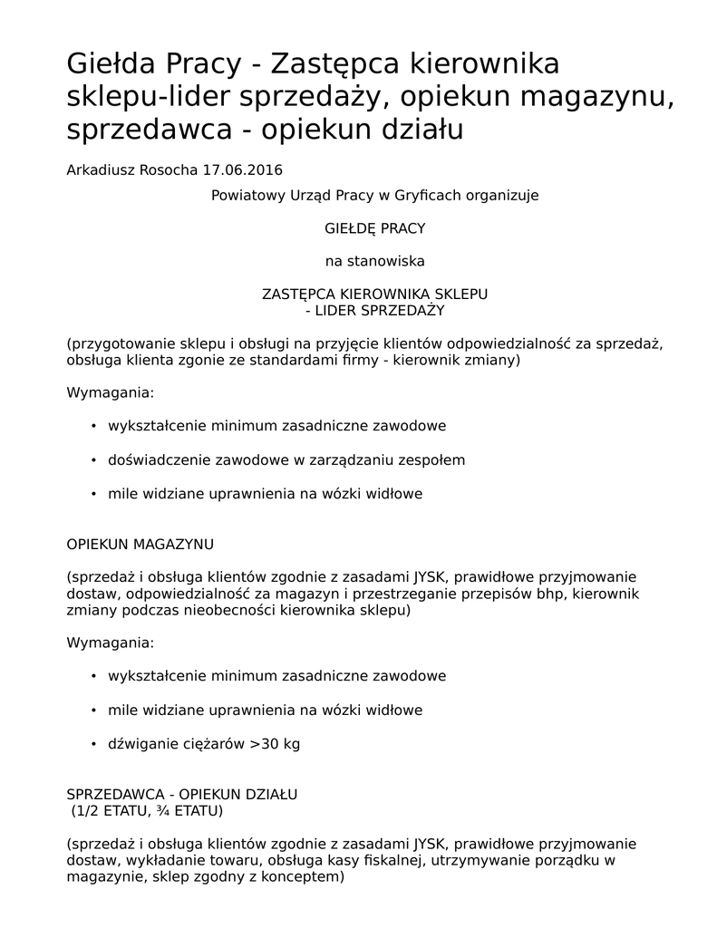 Giełda Pracy - Zastępca kierownika sklepu-lider sprzedaży, opiekun magazynu, sprzedawca - opiekun działu Arkadiusz Rosocha 17.06.2016 Powiatowy Urząd Pracy w Gryficach organizuje GIEŁDĘ PRACY na stanowiska ZASTĘPCA KIEROWNIKA SKLEPU - LIDER SPRZEDAŻY (przygotowanie sklepu i obsługi na przyjęcie klientów odpowiedzialność za sprzedaż, obsługa klienta zgonie ze standardami firmy - kierownik zmiany) Wymagania: • wykształcenie minimum zasadniczne zawodowe • doświadczenie zawodowe w zarządzaniu zespołem • mile widziane uprawnienia na wózki widłowe OPIEKUN MAGAZYNU (sprzedaż i obsługa klientów zgodnie z zasadami JYSK, prawidłowe przyjmowanie dostaw, odpowiedzialność za magazyn i przestrzeganie przepisów bhp, kierownik zmiany podczas nieobecności kierownika sklepu) Wymagania: • wykształcenie minimum zasadniczne zawodowe • mile widziane uprawnienia na wózki widłowe • dźwiganie ciężarów >30 kg SPRZEDAWCA - OPIEKUN DZIAŁU (1/2 ETATU, ¾ ETATU) (sprzedaż i obsługa klientów zgodnie z zasadami JYSK, prawidłowe przyjmowanie dostaw, wykładanie towaru, obsługa kasy fiskalnej, utrzymywanie porządku w magazynie, sklep zgodny z konceptem) Wymagania: • wykształcenie minimum zasadniczne zawodowe • mile widziane uprawnienia na wózki widłowe • dźwiganie ciężarów >30 kg Miejsce wykonywania pracy: Gryfice sklep JYSK Giełda odbędzie się 27 sierpnia 2015 r. Sala nr 29 Godzina 1000 Bliższe informacje można uzyskać w pokoju nr 5