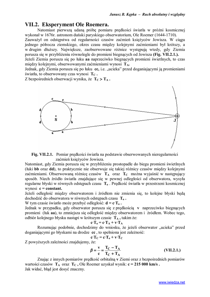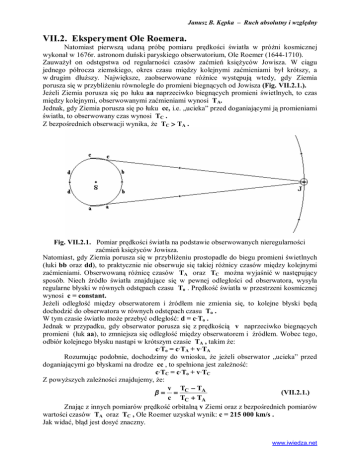 Janusz B. Kępka – Ruch absolutny i względny VII.2. Eksperyment Ole Roemera. Natomiast pierwszą udaną próbę pomiaru prędkości światła w próżni kosmicznej wykonał w 1676r. astronom duński paryskiego obserwatorium, Ole Roemer (1644-1710). Zauważył on odstępstwa od regularności czasów zaćmień księżyców Jowisza. W ciągu jednego półrocza ziemskiego, okres czasu między kolejnymi zaćmieniami był krótszy, a w drugim dłuższy. Największe, zaobserwowane różnice występują wtedy, gdy Ziemia porusza się w przybliżeniu równolegle do promieni biegnących od Jowisza (Fig. VII.2.1.). Jeżeli Ziemia porusza się po łuku aa naprzeciwko biegnących promieni świetlnych, to czas między kolejnymi, obserwowanymi zaćmieniami wynosi TA. Jednak, gdy Ziemia porusza się po łuku cc, i.e. „ucieka” przed doganiającymi ją promieniami światła, to obserwowany czas wynosi TC . Z bezpośrednich obserwacji wynika, że TC > TA . Fig. VII.2.1. Pomiar prędkości światła na podstawie obserwowanych nieregularności zaćmień księżyców Jowisza. Natomiast, gdy Ziemia porusza się w przybliżeniu prostopadle do biegu promieni świetlnych (łuki bb oraz dd), to praktycznie nie obserwuje się takiej różnicy czasów między kolejnymi zaćmieniami. Obserwowaną różnicę czasów TA oraz TC można wyjaśnić w następujący sposób. Niech źródło światła znajdujące się w pewnej odległości od obserwatora, wysyła regularne błyski w równych odstępach czasu To . Prędkość światła w przestrzeni kosmicznej wynosi c = constant. Jeżeli odległość między obserwatorem i źródłem nie zmienia się, to kolejne błyski będą dochodzić do obserwatora w równych odstępach czasu To . W tym czasie światło może przebyć odległość: d = c·To . Jednak w przypadku, gdy obserwator porusza się z prędkością v naprzeciwko biegnących promieni (łuk aa), to zmniejsza się odległość między obserwatorem i źródłem. Wobec tego, odbiór kolejnego błysku nastąpi w krótszym czasie TA , takim że: c·To = c·TA + v·TA Rozumując podobnie, dochodzimy do wniosku, że jeżeli obserwator „ucieka” przed doganiającymi go błyskami na drodze cc , to spełniona jest zależność: c·TC = c·To + v·TC Z powyższych zależności znajdujemy, że: v T - TA b= = C (VII.2.1.) c TC + TA Znając z innych pomiarów prędkość orbitalną v Ziemi oraz z bezpośrednich pomiarów wartości czasów TA oraz TC , Ole Roemer uzyskał wynik: c = 215 000 km/s . Jak widać, błąd jest dosyć znaczny. www.iwiedza.net Janusz B. Kępka – Ruch absolutny i względny Jednak wynik uzyskany przez O. Roemera ma inne, fundamentalne znaczenie. Po pierwsze: Roemer udowodnił, że światło ma skończoną prędkość. Po drugie: był to pierwszy pomiar ruchu absolutnego, i.e. pomiar prędkości fali świetlnej w próżni kosmicznej, czyli w hipotetycznym eterze. www.iwiedza.net