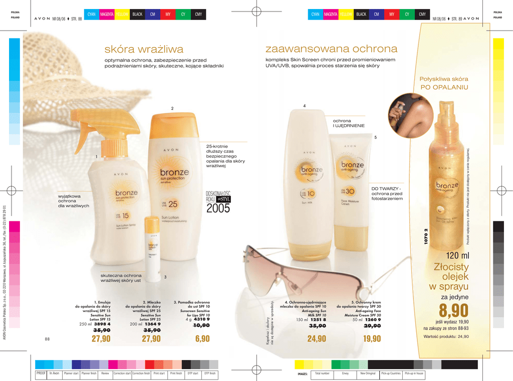 POLSKA NR 08/06 ♦ STR. 88 POLAND CYAN MAGENTA YELLOW BLACK CM MY CY CMY CYAN MAGENTA YELLOW BLACK CM MY skóra wrażliwa zaawansowana ochrona optymalna ochrona, zabezpieczenie przed podrażnieniami skóry, skuteczne, kojące składniki kompleks Skin Screen chroni przed promieniowaniem UVA/UVB, spowalnia proces starzenia się skóry CY CMY POLSKA NR 08/06 ♦ STR. 89 POLAND Połyskliwa skóra PO OPALANIU 4 2 ochrona I UJĘDRNIENIE 25-krotnie dłuższy czas bezpiecznego opalania dla skóry wrażliwej DO TWARZY ochrona przed fotostarzeniem 1070 2 wyjątkowa ochrona dla wrażliwych 120 ml skuteczna ochrona wrażliwej skóry ust In Avon 3 1. Emulsja do opalania do skóry wrażliwej SPF 15 Sensitive Sun Lotion SPF 15 2. Mleczko do opalania do skóry wrażliwej SPF 25 Sensitive Sun Lotion SPF 25 3. Pomadka ochronna do ust SPF 10 Sunscreen Sensitive for Lips SPF 10 250 ml 3898 4 200 ml 1364 9 35,90 35,90 10,90 27,90 27,90 88 PROOF Złocisty olejek w sprayu Planner start Planner finish Review Correction start Correction finish Print start 4 g 4310 9 6,90 Print finish DTP start DTP finish Kapelusz i okulary nie są dostępne w sprzedaży. AVON Cosmetics Polska Sp. z o.o., 02-220 Warszawa, ul. Łopuszańska 36, tel./fax (0-22) 878 29 01 1 Produkt wyłączony z oferty. Produkt nie jest dostępny w cenie regularnej. 5 za jedyne 4. Ochronno-ujędrniające mleczko do opalania SPF 10 Anti-ageing Sun Milk SPF 10 5. Ochronny krem do opalania twarzy SPF 30 Anti-ageing Face Moisture Cream SPF 30 150 ml 1251 8 50 ml 1260 9 35,90 29,90 jeśli wydasz 19,90 na zakupy ze stron 88-93 24,90 19,90 Wartość produktu: 24,90 IMAGES: Total number Envoy New Oringinal 8,90 Pick-up Countries Pick-up in house