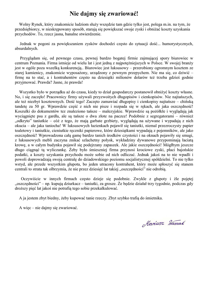 Nie dajmy się zwariować! Wolny Rynek, który znakomicie ludziom służy wszędzie tam gdzie tylko jest, polega m.in. na tym, że przedsiębiorcy, w nieskrępowany sposób, starają się powiększać swoje zyski i obniżać koszty uzyskania przychodów. To, rzecz jasna, banalne stwierdzenie. Jednak w pogoni za powiększaniem zysków dochodzi często do sytuacji dość... humorystycznych, absurdalnych. Przyglądam się, od pewnego czasu, pewnej bardzo bogatej firmie zajmującej spory biurowiec w centrum Poznania. Firma istnieje od wielu lat i jest jedną z najpotężniejszych w Polsce. W swojej branży jest w ogóle poza wszelką konkurencją.. Biurowiec jest luksusowy – przerobiony ogromnym kosztem ze starej kamienicy, znakomicie wyposażony, urządzony z pewnym przepychem. Nie ma się, co dziwić – firmę na to stać, a i kontrahentów często na dziesiątki milionów dolarów też trzeba gdzieś godnie przyjmować. Prawda? Jasne, że prawda! Wszystko było w porządku aż do czasu, kiedy to dział gospodarczy postanowił obniżyć koszty własne. No, i się zaczęło! Pracownicy firmy używali przyzwoitych długopisów i cienkopisów. Nie najtańszych, ale też niezbyt kosztownych. Dość tego! Zaczęto zamawiać długopisy i cienkopisy najtańsze – chińską tandetę za 50 gr. Wprawdzie część z nich nie pisze i rozpada się w rękach, ale jaka oszczędność! Koszulki do dokumentów tez znaleziono tańsze – malezyjskie. Wprawdzie są pożółkłe i wyglądają jak wyciągnięte psu z gardła, ale są tańsze o dwa złote na paczce! Podobnie z segregatorami – również „odkryto” taniutkie – cóż z tego, że mają garbate grzbiety, wyglądają na używane i wypadają z nich okucia – ale jaka taniocha! W luksusowych łazienkach pojawił się taniutki, niemal przezroczysty papier toaletowy i taniutkie, cieniutkie ręczniki papierowe, które dziesiątkami wypadają z pojemników, ale jako oszczędność! Wprowadzona całą gamę bardzo tanich środków czystości i na oknach pojawiły się smugi, z luksusowych mebli zaczyna znikać szlachetny połysk, wykładziny dywanowe przypominają łaciatą krowę, a w całym budynku pojawił się podejrzany zapaszek. Ale jakie oszczędności! Mógłbym jeszcze długo ciągnąć tą wyliczankę. Żeby było śmieszniej firma przynosi krociowe zyski, płaci bajońskie podatki, a koszty uzyskania przychodu może sobie od nich odliczać. Jednak jakoś na to nie wpadli i powoli doprowadzają swoją centralę do dziadowskiego poziomu socjalistycznej spółdzielni. To nie tylko wstyd, ale przede wszystkim głupota, bo jeden utracony kontrahent, który może spłoszyć się stanem centrali to strata tak olbrzymia, że nie przez dziesięć lat takiej „oszczędności” nie odrobią. Oczywiście w innych firmach często dzieje się podobnie. Zwykle z głupoty i źle pojętej „oszczędności” – np. kupują dziurkacz – taniutki, za grosze. Że będzie działał trzy tygodnie, podczas gdy droższy pięć lat jakoś nie potrafią tego sobie przekalkulować. A ja jestem zbyt biedny, żeby kupować tanie rzeczy. Zbyt szybko trafią do śmietnika. A więc – nie dajmy się zwariować.