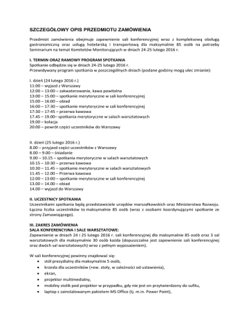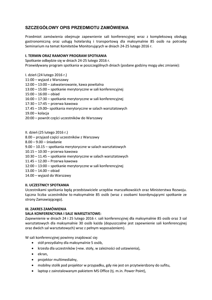 SZCZEGÓŁOWY OPIS PRZEDMIOTU ZAMÓWIENIA Przedmiot zamówienia obejmuje zapewnienie sali konferencyjnej wraz z kompleksową obsługą gastronomiczną oraz usługą hotelarską i transportową dla maksymalnie 85 osób na potrzeby Seminarium na temat Komitetów Monitorujących w dniach 24-25 lutego 2016 r. I. TERMIN ORAZ RAMOWY PROGRAM SPOTKANIA Spotkanie odbędzie się w dniach 24-25 lutego 2016 r. Przewidywany program spotkania w poszczególnych dniach (podane godziny mogą ulec zmianie): I. dzień (24 lutego 2016 r.) 11:00 – wyjazd z Warszawy 12:00 – 13:00 – zakwaterowanie, kawa powitalna 13:00 – 15:00 – spotkanie merytoryczne w sali konferencyjnej 15:00 – 16:00 – obiad 16:00 – 17:30 – spotkanie merytoryczne w sali konferencyjnej 17:30 – 17:45 – przerwa kawowa 17.45 – 19.00– spotkania merytoryczne w salach warsztatowych 19.00 – kolacja 20:00 – powrót części uczestników do Warszawy II. dzień (25 lutego 2016 r.) 8.00 – przyjazd części uczestników z Warszawy 8.00 – 9.00 – śniadanie 9.00 – 10.15 – spotkania merytoryczne w salach warsztatowych 10.15 – 10:30 – przerwa kawowa 10:30 – 11.45 – spotkanie merytoryczne w salach warsztatowych 11.45 – 12.00 – Przerwa kawowa 12:00 – 13:00 – spotkanie merytoryczne w sali konferencyjnej 13.00 – 14.00 – obiad 14.00 – wyjazd do Warszawy II. UCZESTNICY SPOTKANIA Uczestnikami spotkania będą przedstawiciele urzędów marszałkowskich oraz Ministerstwa Rozwoju. Łączna liczba uczestników to maksymalnie 85 osób (wraz z osobami koordynującymi spotkanie ze strony Zamawiającego). III. ZAKRES ZAMÓWIENIA SALA KONFERENCYJNA I SALE WARSZTATOWE: Zapewnienie w dniach 24 i 25 lutego 2016 r. sali konferencyjnej dla maksymalnie 85 osób oraz 3 sal warsztatowych dla maksymalnie 30 osób każda (dopuszczalne jest zapewnienie sali konferencyjnej oraz dwóch sal warsztatowych) wraz z pełnym wyposażeniem). W sali konferencyjnej powinny znajdować się: stół prezydialny dla maksymalnie 5 osób, krzesła dla uczestników (+ew. stoły, w zależności od ustawienia), ekran, projektor multimedialny, mobilny stolik pod projektor w przypadku, gdy nie jest on przytwierdzony do sufitu, laptop z zainstalowanym pakietem MS Office (tj. m.in. Power Point), pilot do zmieniania slajdów, 2 mikrofony bezprzewodowe lub multifony na stołach, bezprzewodowy dostęp do Internetu, tablica typu „flipchart” i flamastry, obsługa techniczna sprzętu. W salach warsztatowych powinny znajdować się: stoły i krzesła dla uczestników, laptop z zainstalowanym pakietem MS Office (tj. m.in. Power Point), projektor multimedialny, mobilny stolik pod projektor w przypadku, gdy nie jest on przytwierdzony do sufitu, pilot do zmieniania slajdów, bezprzewodowy dostęp do Internetu, tablica typu „flipchart” i flamastry, obsługa techniczna sprzętu. USŁUGI HOTELOWE: Nocleg w hotelu/ośrodku położonym maksymalnie w odległości do 1 godziny jazdy autokarem od siedziby MR (ul. Wspólna 2/4, Warszawa) dla maks. 85 osób w dniach 24-25 lutego 2016 r. (1 doba hotelowa), z czego koszt 10 (liczba może ulec zmniejszeniu) noclegów objęty zamówieniem, reszta wyłącznie w postaci rezerwacji płatnych przez uczestników spotkania: pokoje jedno- lub dwuosobowe, wszystkie pokoje, sala, w której podawane będą posiłki, miejsca, w których będą organizowane przerwy kawowe, sala konferencyjna oraz sale warsztatowe muszą znajdować się w jednym kompleksie, w cenę pokoju powinno być włączone śniadanie w formie bufetu. USŁUGI TRANSPORTOWE: transport z Warszawy na miejsce spotkania w dniu 24 lutego 2016 r. (dla maksymalnie 85 osób) oraz z powrotem do Warszawy w dniu 24 lutego 2016 r. (dla maksymalnie 20 osób), a także z Warszawy na miejsce spotkania 25 lutego 2016 r. (dla maksymalnie 20 osób ) oraz z powrotem do Warszawy w dniu 25 lutego 2016 r. (dla maksymalnie 85 osób) – ostateczna decyzja dot. zorganizowania transportu z powrotem do Warszawy w dniu 24 lutego 2016 r. (dla maksymalnie 20 osób), a także z Warszawy na miejsce spotkania 25 lutego 2016 r. (dla maksymalnie 20 osób ) zostanie podjęta najpóźniej w 19 lutego 2016 r.; środki transportu (autokary, busy) nie starsze niż 5 lat, z ważną polisą ubezpieczeniową. Wykonawca, bądź podmiot świadczący usługę transportu na rzecz Wykonawcy, musi posiadać licencję na wykonywanie krajowego transportu drogowego osób. USŁUGI GASTRONOMICZNO-RESTAURACYJNE: a) Kawa powitalna/przerwy kawowe (I i II dzień zgodnie z harmonogramem) – w formie szwedzkiego stołu: kawa, herbata (różne rodzaje), mleko do kawy, cytryna, cukier, woda mineralna (gazowana, niegazowana), soki, ciasteczka, ciasto (I dnia dla maksymalnie 85 osób, II dnia dla maksymalnie 85 osób) b) Lunch w formie szwedzkiego stołu (I i II dzień zgodnie z harmonogramem) – zupa, drugie danie (w wersji mięsnej i bezmięsnej), deser, napoje (I dnia dla maksymalnie 85 osób, II dnia dla maksymalnie 85 osób) c) Kolacja w formie szwedzkiego stołu (I dzień zgodnie z harmonogramem) – przystawki, danie ciepłe (w wersji mięsnej i bezmięsnej), deser, napoje (dla maksymalnie 85 osób) d) Śniadanie (II dzień zgodnie z harmonogramem) – w formie szwedzkiego stołu, wliczone w cenę noclegu. e) Serwis gastronomiczny (przygotowanie, obsługa kelnerska, nakrycie stołów/obrusy, zastawa porcelanowa i szklana, sprzątanie). IV. WARUNKI WYBORU WYKONAWCY 1. W celu zapewnienia porównywalności wszystkich ofert, Zamawiający zastrzega sobie prawo do skontaktowania się z właściwymi Oferentami w celu uzupełnienia lub doprecyzowania ofert. 2. Po wyborze Wykonawcy Zamawiający zastrzega sobie prawo negocjacji warunków zamówienia. 3. Zamawiający zastrzega sobie prawo do odpowiedzi tylko na wybraną ofertę. 4. Oferty, które wpłyną po terminie nie będą rozpatrywane. 5. Menu będzie ustalane z Zamawiającym na podstawie propozycji przedstawionych przez Wykonawcę. 6. Ostateczna liczba uczestnik