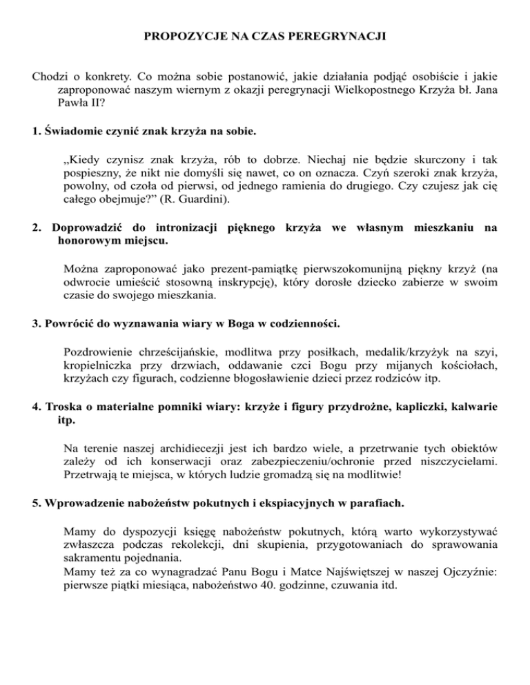 PROPOZYCJE NA CZAS PEREGRYNACJI Chodzi o konkrety. Co można sobie postanowić, jakie działania podjąć osobiście i jakie zaproponować naszym wiernym z okazji peregrynacji Wielkopostnego Krzyża bł. Jana Pawła II? 1. Świadomie czynić znak krzyża na sobie. „Kiedy czynisz znak krzyża, rób to dobrze. Niechaj nie będzie skurczony i tak pospieszny, że nikt nie domyśli się nawet, co on oznacza. Czyń szeroki znak krzyża, powolny, od czoła od pierwsi, od jednego ramienia do drugiego. Czy czujesz jak cię całego obejmuje?” (R. Guardini). 2. Doprowadzić do intronizacji pięknego krzyża we własnym mieszkaniu na honorowym miejscu. Można zaproponować jako prezent-pamiątkę pierwszokomunijną piękny krzyż (na odwrocie umieścić stosowną inskrypcję), który dorosłe dziecko zabierze w swoim czasie do swojego mieszkania. 3. Powrócić do wyznawania wiary w Boga w codzienności. Pozdrowienie chrześcijańskie, modlitwa przy posiłkach, medalik/krzyżyk na szyi, kropielniczka przy drzwiach, oddawanie czci Bogu przy mijanych kościołach, krzyżach czy figurach, codzienne błogosławienie dzieci przez rodziców itp. 4. Troska o materialne pomniki wiary: krzyże i figury przydrożne, kapliczki, kalwarie itp. Na terenie naszej archidiecezji jest ich bardzo wiele, a przetrwanie tych obiektów zależy od ich konserwacji oraz zabezpieczeniu/ochronie przed niszczycielami. Przetrwają te miejsca, w których ludzie gromadzą się na modlitwie! 5. Wprowadzenie nabożeństw pokutnych i ekspiacyjnych w parafiach. Mamy do dyspozycji księgę nabożeństw pokutnych, którą warto wykorzystywać zwłaszcza podczas rekolekcji, dni skupienia, przygotowaniach do sprawowania sakramentu pojednania. Mamy też za co wynagradzać Panu Bogu i Matce Najświętszej w naszej Ojczyźnie: pierwsze piątki miesiąca, nabożeństwo 40. godzinne, czuwania itd. 6. Rozkrzewianie nabożeństw pasyjnych: Gorzkie Żale, Droga Krzyżowa. Warto propagować nabożeństwa Drogi Krzyżowej na ulicach miast i wsi (oprócz tradycyjnych nabożeństw w kościołach). Gorzkie Żale to okazja do kazań pasyjnych i adoracji krzyża. 7. Obrona prawd wiary, zasad moralnych, chrześcijańskich świętości. Wobec powszechnych ataków na Kościół i głoszoną naukę Chrystusa, nie można milczeć. Zwłaszcza dzieci i ludzie młodzi potrzebują jasnego przekazu zasad wiary, zanim ich duch zostanie zatruty przez mass media. „Ja wiem, w Kogo ja wierzę” – czyli formacja chrześcijańska potrzebna będzie każdemu z nas do końca życia (stąd: katolickie mass media muszą być obecne w każdym domu!). 8. Propagowanie nauczania papieża bł Jana Pawła II. Na szczęście mamy do dyspozycji wiele opracowań tego, co pozostawił Ojciec Święty zwłaszcza nam, Polakom. Uwaga: od śmierci papieża (2 kwietnia 2005 r.) minęło już 8 lat i stąd młodzi najczęściej nie zetknęli się z nauczaniem bł. Jana Pawła II. Szansa? Np. katecheza. 9. Troska o chrześcijański charakter dni pokuty: okresu Wielkiego Postu i wszystkich piątków w ciągu roku (z wyjątkiem uroczystości przypadających w piątki). Jeśli coś tak prostego jak powstrzymanie się od pokarmów mięsnych w piątki wydaje się wielu ludziom nie do przyjęcia – jakże zdobędą się oni na postawy znacznie trudniejsze? Warto zawalczyć o to, by w piątki w szkołach (i innych miejscach) nie urządzano zabaw tanecznych nawet dla dzieci (cóż dopiero przyjęć weselnych!). Współczesny katolik musi wiedzieć, co wydarzyło się w Wieki Piątek na Kalwarii i dlaczego każdy piątek w roku ma mieć szczególny charakter. 10. Wynagradzanie i pokutowanie za grzechy własne i bliźnich. Wzór? Krzyże pokutne! To są pomniki świadczące o nawróceniu i zadośćuczynieniu za popełnione zło (morderstwo). Dziś taką formą wynagrodzenia może być: wolontariat na rzecz potrzebujących, udział w remontowaniu/budowaniu świątyń czy kapliczek, wspieranie misji św., pisanie artykułów do czasopism parafialnych czy na strony internetowe, obrona życia nienarodzonych itd.
