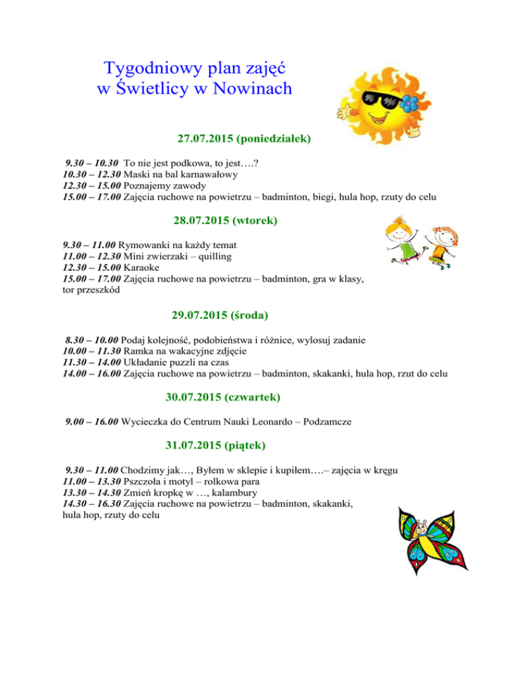 Tygodniowy plan zajęć w Świetlicy w Nowinach 27.07.2015 (poniedziałek) 9.30 – 10.30 To nie jest podkowa, to jest….? 10.30 – 12.30 Maski na bal karnawałowy 12.30 – 15.00 Poznajemy zawody 15.00 – 17.00 Zajęcia ruchowe na powietrzu – badminton, biegi, hula hop, rzuty do celu 28.07.2015 (wtorek) 9.30 – 11.00 Rymowanki na każdy temat 11.00 – 12.30 Mini zwierzaki – quilling 12.30 – 15.00 Karaoke 15.00 – 17.00 Zajęcia ruchowe na powietrzu – badminton, gra w klasy, tor przeszkód 29.07.2015 (środa) 8.30 – 10.00 Podaj kolejność, podobieństwa i różnice, wylosuj zadanie 10.00 – 11.30 Ramka na wakacyjne zdjęcie 11.30 – 14.00 Układanie puzzli na czas 14.00 – 16.00 Zajęcia ruchowe na powietrzu – badminton, skakanki, hula hop, rzut do celu 30.07.2015 (czwartek) 9.00 – 16.00 Wycieczka do Centrum Nauki Leonardo – Podzamcze 31.07.2015 (piątek) 9.30 – 11.00 Chodzimy jak…, Byłem w sklepie i kupiłem….– zajęcia w kręgu 11.00 – 13.30 Pszczoła i motyl – rolkowa para 13.30 – 14.30 Zmień kropkę w …, kalambury 14.30 – 16.30 Zajęcia ruchowe na powietrzu – badminton, skakanki, hula hop, rzuty do celu