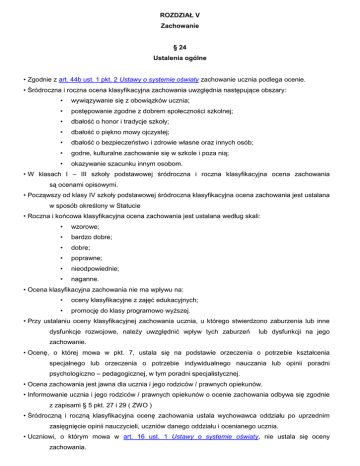 ROZDZIAŁ V Zachowanie § 24 Ustalenia ogólne • Zgodnie z art. 44b ust. 1 pkt. 2 Ustawy o systemie oświaty zachowanie ucznia podlega ocenie. • Śródroczna i roczna ocena klasyfikacyjna zachowania uwzględnia następujące obszary: • wywiązywanie się z obowiązków ucznia; • postępowanie zgodne z dobrem społeczności szkolnej; • dbałość o honor i tradycje szkoły; • dbałość o piękno mowy ojczystej; • dbałość o bezpieczeństwo i zdrowie własne oraz innych osób; • godne, kulturalne zachowanie się w szkole i poza nią; • okazywanie szacunku innym osobom. • W klasach I – III szkoły podstawowej śródroczna i roczna klasyfikacyjna ocena zachowania są ocenami opisowymi. • Począwszy od klasy IV szkoły podstawowej śródroczna klasyfikacyjna ocena zachowania jest ustalana w sposób określony w Statucie • Roczna i końcowa klasyfikacyjna ocena zachowania jest ustalana według skali: • wzorowe; • bardzo dobre; • dobre; • poprawne; • nieodpowiednie; • naganne. • Ocena klasyfikacyjna zachowania nie ma wpływu na: • oceny klasyfikacyjne z zajęć edukacyjnych; • promocję do klasy programowo wyższej. • Przy ustalaniu oceny klasyfikacyjnej zachowania ucznia, u którego stwierdzono zaburzenia lub inne dysfunkcje rozwojowe, należy uwzględnić wpływ tych zaburzeń lub dysfunkcji na jego zachowanie. • Ocenę, o której mowa w pkt. 7, ustala się na podstawie orzeczenia o potrzebie kształcenia specjalnego lub orzeczenia o potrzebie indywidualnego nauczania lub opinii poradni psychologiczno – pedagogicznej, w tym poradni specjalistycznej. • Ocena zachowania jest jawna dla ucznia i jego rodziców / prawnych opiekunów. • Informowanie ucznia i jego rodziców / prawnych opiekunów o ocenie zachowania odbywa się zgodnie z zapisami § 5 pkt. 27 i 29 ( ZWO ) • Śródroczną i roczną klasyfikacyjna ocenę zachowania ustala wychowawca oddziału po uprzednim zasięgnięcie opinii nauczycieli, uczniów danego oddziału i ocenianego ucznia. • Uczniowi, o którym mowa w art. 16 ust. 1 Ustawy o systemie oświaty, nie ustala się oceny zachowania. § 25 Zasady oceny zachowania • Podczas lekcji, innych zajęć edukacyjnych oraz uroczystości szkolnych obowiązuje bezwzględny nakaz wyłączania przez uczniów telefonów komórkowych i innych sprzętów elektronicznych. • Robienie zdjęć i kręcenie filmów na terenie szkoły bez zgody dyrektora lub nauczyciela jest zabronione. • W przypadku nieprzestrzegania powyższych ustaleń sprzęt zostanie zdeponowany (po uprzednim wyłączeniu) w sekretariacie. Rodzice ucznia zobowiązani są do odbioru zdeponowanego sprzętu. • Począwszy od klasy IV szkoły podstawowej ustala się zasady oceniania (pkt.23) • Z każdej kategorii wybiera się ten opis, który najlepiej charakteryzuje konkretnego ucznia i przyporządkowuje mu się cyfrę określającą liczbę punktów w danej kategorii. • Ocenę wzorową otrzymuje uczeń, który uzyskał 20 punktów oraz spełnił trzy z poniższych kryteriów (zwanych bonusami): • reprezentuje szkołę lub klasę w różnorodnych konkursach i zawodach sportowych • inicjuje oraz bierze udział w przygotowaniu uroczystości i wydarzeń kulturalnych szkoły i klasy • • systematycznie dba o wystrój sal lekcyjnych i holu szkoły; • wyróżnia się swoją postawą w realizacji programu kół zainteresowań; • wyróżnia się wzorową postawą wobec kolegów Oceny zachowania mogą ulec podwyższeniu w przypadku spełnienia minimum trzech kryteriów (zwanych bonusami) z pkt. 18. • Na kryterium punktowe nakłada się następujące ograniczenia: • uczeń, który otrzymał choć w jednej kategorii 2 punkty, nie może mieć zachowania wyższego niż poprawne. • uczeń, który otrzymał choć w jednej kategorii 3 punkty nie może mieć zachowania wyższego niż dobre. • Ocena zachowania podlega obniżeniu w szczególnych przypadkach: • za nieprzestrzeganie regulaminu ujętego w Statucie dotyczącego używania telefonów komórkowych i innych sprzętów elektronicznych – minus 1 punkt za każde 5 uwag. • w przypadku stwierdzenia zachowań agresywnych, przejawów przemocy, kradzieży oraz używania narkotyków, picia alkoholu, palenia papierosów – patrz pkt. 22. • W sytuacji rażącego naruszenia Regulaminu Szkoły następuje obniżenie oceny zachowania bez względu na klasyfikację punktową (po uprzedniej analizie przypadku z Radą Pedagogiczną lub Zespołem Wychowawczym). • Śródroczna i roczna klasyfikacyjna ocena zachowania ustalana jest według kryteriów: OPISOWE KATEGORIE ZACHOWAŃ KATEGORIA A Wypełnia wychowawca klasy oraz inni nauczyciele UWAGI Stosunek do nauki z uwzględnieniem potencjału intelektualnego ucznia 1. Aktywnie i sumiennie uczestniczy 5 punktów we wszystkich lekcjach, nie zakłóca przebiegu (bardzo dobry) lekcji, systematycznie i sumiennie wypełnia swoje obowiązki szkolne. 2. Aktywnie i sumiennie uczestniczy 4punkty we wszystkich lekcjach, nie zakłóca przebiegu (dobry) lekcji, systematycznie i sumiennie wypełnia swoje obowiązki szkolne, ale zdarza się mu przeszkadzać w prowadzeniu zajęć (do 3 uwag- rozmowy, przerywanie wypowiedzi nauczyciela i innych uczniów, nieuważne słuchanie nauczyciela, sporadyczne nie przygotowanie do zajęć). 3 . Wykazuj e brak systematyczności 3 punkty i sumienności. Sporadycznie wykonuje (przeciętny) powierzone prace. Przeszkadza w prowadzeniu zajęć (do 5 uwag), często nie jest przygotowany do zajęć- powyżej 5 razy. 4. Pracuje niesystematycznie i mało sumiennie 2 punkty w szkole i w domu. Niestarannie wykonuje (niski) powierzone prace. Przeszkadza w prowadzeniu lekcji (powyżej 5 uwag). 5. Pracuje niesystematycznie i mało sumiennie, 1 punkt notorycznie przeszkadza w prowadzeniu zajęć, (nieodpowiedni) nagminnie nie odrabia zadań domowych. B Wypełnia wychowawca klasy oraz inni nauczyciele Takt, kultura osobista i postawa moralna 1. Zawsze zachowuj