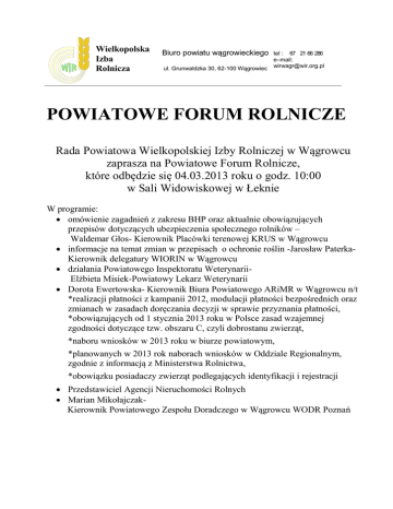 Wielkopolska Izba Rolnicza Biuro powiatu wągrowieckiego ul. Grunwaldzka 30, 62-100 Wągrowiec tel : 67 21 66 286 e–mail: [email protected] POWIATOWE FORUM ROLNICZE Rada Powiatowa Wielkopolskiej Izby Rolniczej w Wągrowcu zaprasza na Powiatowe Forum Rolnicze, które odbędzie się 04.03.2013 roku o godz. 10:00 w Sali Widowiskowej w Łeknie W programie: omówienie zagadnień z zakresu BHP oraz aktualnie obowiązujących przepisów dotyczących ubezpieczenia społecznego rolników – Waldemar Głos- Kierownik Placówki terenowej KRUS w Wągrowcu informacje na temat zmian w przepisach o ochronie roślin -Jarosław PaterkaKierownik delegatury WIORIN w Wągrowcu działania Powiatowego Inspektoratu WeterynariiElżbieta Misiek-Powiatowy Lekarz Weterynarii Dorota Ewertowska- Kierownik Biura Powiatowego ARiMR w Wągrowcu n/t *realizacji płatności z kampanii 2012, modulacji płatności bezpośrednich oraz zmianach w zasadach doręczania decyzji w sprawie przyznania płatności, *obowiązujących od 1 stycznia 2013 roku w Polsce zasad wzajemnej zgodności dotyczące tzw. obszaru C, czyli dobrostanu zwierząt, *naboru wniosków w 2013 roku w biurze powiatowym, *planowanych w 2013 rok naborach wniosków w Oddziale Regionalnym, zgodnie z informacją z Ministerstwa Rolnictwa, *obowiązku posiadaczy zwierząt podlegających identyfikacji i rejestracji Przedstawiciel Agencji Nieruchomości Rolnych Marian MikołajczakKierownik Powiatowego Zespołu Doradczego w Wągrowcu WODR Poznań