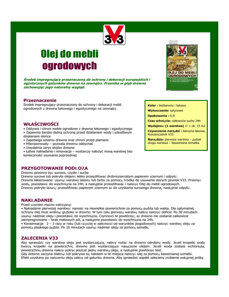 Olej do mebli ogrodowych Środek impregnujący przeznaczony do ochrony i dekoracji europejskich i egzotycznych gatunków drewna na zewnątrz. Przenika w głąb drewna zachowując jego naturalny wygląd. Przeznaczenie Środek impregnujący przeznaczony do ochrony i dekoracji mebli ogrodowych z drewna tekowego i egzotycznego na zewnątrz. Kolor : bezbarwny i tekowy Wykończenie: satynowe Opakowania : 0,5l Czas schnięcia: całkowicie suchy 24h WŁAŚCIWOŚCI • OdŜywia i chroni meble ogrodowe z drewna tekowego i egzotycznego • Zapewnia bardzo dobrą ochronę przed działaniem wody i szkodliwym działaniem słońca • Zapobiega sinieniu drewna oraz chroni przed plamami • Mikroporowaty – pozwala drewnu oddychać • Uwydatnia zarys słojów drewna • Łatwe nakładanie i renowacja – wystarczy nałoŜyć nową warstwę bez konieczności usuwania poprzedniej Wydajność (1 warstwa) 1l = ok. 15 m2 Czyszczenie narzędzi : benzyna lakowa, Rozcieńczalnik V33 Narzędzia: pierwsza warstwa – pędzel druga warstwa – bawełniana szmatka PRZYGOTOWANIE PODŁOśA Drewno powinno być surowe, czyste i suche Drewno surowe lub pokryte olejem: lekko przeszlifować drobnoziarnistym papierem ściernym i odpylić. Drewno lakierowane: usunąć warstwy lakieru lub farby za pomocą Środka do usuwania starych powłok V33. Przemyć wodą, pozostawić do wyschnięcia na 24h, a następnie przeszlifować i nałoŜyć Olej do mebli ogrodowych. Drewno pokryte lazurą: przeszlifować papierem ściernym aŜ do uzyskania surowego drewna, następnie odpylić. NAKŁADANIE Przed uŜyciem mocno wstrząsnąć • Nakładanie pierwszej warstwy: nanosić na niewielkie powierzchnie za pomocą pędzla lub wałka. Dla optymalnej ochrony olej musi wniknąć głęboko w drewno. W tym celu pierwszą warstwę naleŜy nałoŜyć obficie. Po 30 minutach usunąć nadmiar oleju i pozostawić do wyschnięcia. Czynności te powtórzyć, aŜ drewno nie zostanie całkowicie zaimpregnowane – brak matowych pól, a następnie pozostawić do wyschnięcia na 24h. • Konserwacja: 2 – 3 razy w roku (lub częściej w zaleŜności od warunków pogodowych) nałoŜyć warstwę oleju za pomocą płaskiego pędzla. Po 10 minutach usunąć nadmiar oleju za pomocą szmatki. ZALECENIA V33 Aby sprawdzić czy warstwa oleju jest wystarczająca, naleŜy rozlać na drewno odrobinę wody. JeŜeli kropelki wody tworzą kropelki na powierzchni, drewno jest wystarczająco nasączone olejem. JeŜeli woda została wchłonięta, powierzchnię drewna naleŜy pokryć jeszcze jedną warstwą oleju, a następnie powtórzyć test. Gdy drewno zaczyna blaknąć lub pokrywa się nalotem w te miejsca nałoŜyć olej za pomocą bawełnianej szmatki. Efekt uzyskany po nałoŜeniu oleju zaleŜy od gatunku drewna. Aby sprawdzić aspekt zalecamy zrobienie wstępnej próby.
