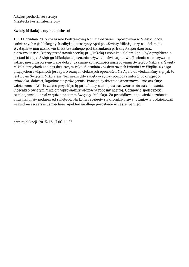 Artykuł pochodzi ze strony: Miastecki Portal Internetowy Święty Mikołaj uczy nas dobroci 10 i 11 grudnia 2015 r w szkole Podstawowej Nr 1 z Oddziałami Sportowymi w Miastku obok codziennych zajęć lekcyjnych odbył się uroczysty Apel pt. ,,Święty Mikołaj uczy nas dobroci''. Wystąpili w nim uczniowie kółka teatralnego pod kierunkiem p. Ireny Kacperskiej oraz pierwszoklasiści, którzy przedstawili scenkę pt. ,,Mikołaj i choinka''. Celem Apelu było przybliżenie postaci biskupa Świętego Mikołaja: zapoznanie z żywotem świętego, uwrażliwienie na okazywanie wdzięczności za otrzymywane dobro, ukazanie konieczności naśladowania Świętego Mikołaja. Święty Mikołaj przychodzi do nas dwa razy w roku: 6 grudnia – w dniu swoich imienin i w Wigilię, a z jego przybyciem związanych jest sporo różnych ciekawych opowieści. Na Apelu dowiedzieliśmy się, jak to jest z tym Świętym Mikołajem. Ten niezwykły święty uczy nas pomocy i miłości do drugiego człowieka, dobroci, łagodności i poświęcenia. Pomaga dyskretnie i anonimowo – nie oczekuje wdzięczności. Warto zatem przybliżyć tę postać, aby stał się dla nas wzorem do naśladowania. Piosenki o Świętym Mikołaju wprowadziły widzów w radosny nastrój. Uczniowie społeczności szkolnej wzięli udział w quizie na temat Świętego Mikołaja. Za prawidłową odpowiedź uczniowie otrzymali mały podarek od świętego. Na koniec rozległy się gromkie brawa, uczniowie podziękowali wszystkim szczerym uśmiechem. Apel ten na długo pozostanie w naszej pamięci. data publikacji: 2015-12-17 08:11:32
