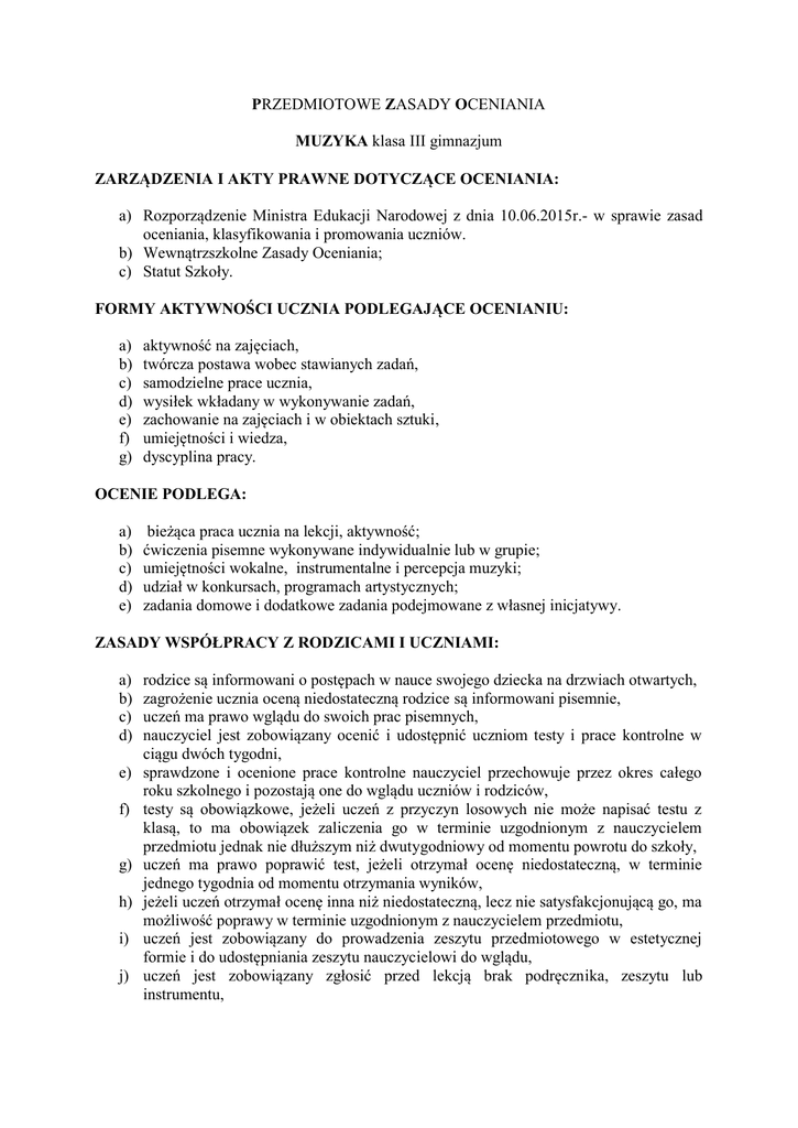 PRZEDMIOTOWE ZASADY OCENIANIA MUZYKA klasa III gimnazjum ZARZĄDZENIA I AKTY PRAWNE DOTYCZĄCE OCENIANIA: a) Rozporządzenie Ministra Edukacji Narodowej z dnia 10.06.2015r.- w sprawie zasad oceniania, klasyfikowania i promowania uczniów. b) Wewnątrzszkolne Zasady Oceniania; c) Statut Szkoły. FORMY AKTYWNOŚCI UCZNIA PODLEGAJĄCE OCENIANIU: a) b) c) d) e) f) g) aktywność na zajęciach, twórcza postawa wobec stawianych zadań, samodzielne prace ucznia, wysiłek wkładany w wykonywanie zadań, zachowanie na zajęciach i w obiektach sztuki, umiejętności i wiedza, dyscyplina pracy. OCENIE PODLEGA: a) b) c) d) e) bieżąca praca ucznia na lekcji, aktywność; ćwiczenia pisemne wykonywane indywidualnie lub w grupie; umiejętności wokalne, instrumentalne i percepcja muzyki; udział w konkursach, programach artystycznych; zadania domowe i dodatkowe zadania podejmowane z własnej inicjatywy. ZASADY WSPÓŁPRACY Z RODZICAMI I UCZNIAMI: a) b) c) d) e) f) g) h) i) j) rodzice są informowani o postępach w nauce swojego dziecka na drzwiach otwartych, zagrożenie ucznia oceną niedostateczną rodzice są informowani pisemnie, uczeń ma prawo wglądu do swoich prac pisemnych, nauczyciel jest zobowiązany ocenić i udostępnić uczniom testy i prace kontrolne w ciągu dwóch tygodni, sprawdzone i ocenione prace kontrolne nauczyciel przechowuje przez okres całego roku szkolnego i pozostają one do wglądu uczniów i rodziców, testy są obowiązkowe, jeżeli uczeń z przyczyn losowych nie może napisać testu z klasą, to ma obowiązek zaliczenia go w terminie uzgodnionym z nauczycielem przedmiotu jednak nie dłuższym niż dwutygodniowy od momentu powrotu do szkoły, uczeń ma prawo poprawić test, jeżeli otrzymał ocenę niedostateczną, w terminie jednego tygodnia od momentu otrzymania wyników, jeżeli uczeń otrzymał ocenę inna niż niedostateczną, lecz nie satysfakcjonującą go, ma możliwość poprawy w terminie uzgodnionym z nauczycielem przedmiotu, uczeń jest zobowiązany do prowadzenia zeszytu przedmiotowego w estetycznej formie i do udostępniania zeszytu nauczycielowi do wglądu, uczeń jest zobowiązany zgłosić przed lekcją brak podręcznika, zeszytu lub instrumentu, k) uczeń może być nieprzygotowany do lekcji z powodów osobistych – dwukrotnie w ciągu semestru, zaznaczone minusy nie wpływają na ocenę końcową. Kolejne nieprzygotowania do lekcji są równoważne ocenie niedostatecznej, l) aktywność ucznia w czasie zajęć lekcyjnych może zostać nagrodzona oceną lub znakiem (+) trzykrotne uzyskanie powoduje wpisanie oceny bdb, m) reprezentowanie szkoły w konkursach, występy artystyczne są nagradzane dodatkowo oceną bardzo dobrą lub celującą, n) uczeń jest zobowiązany zgłosić nauczycielowi przeciwwskazania do czynnego udziału w lekcji (np. choroba krtani itp.) – jest zwolniony z czynnego udziału bez konsekwencji. o) osiągnięcia dotyczące wiedzy o muzyce w zakresie: oceny bardzo dobrej (5) – odpowiadają wytyczonym celom poznawczym i kształcącym; na ocenę celującą (6) – uczeń powinien opanować wiedzę i umiejętności w zakresie rozszerzonym w stosunku do proponowanego materiału nauczania, odnosi sukcesy artystyczne w konkursach, rozwija swoje talenty muzyczne itp. KRYTERIA OCENY: Kryteria oceny uczniów ukierunkowane będą przede wszystkim na zakres realizacji przez uczniów celów: a) wychowawczych: • czynne uczestniczenie w zajęciach, • wykazywanie pozytywnej motywacji do przedmiotu, • umiejętność samodzielnego wykonywania zadań, • mobilizowanie kolegów do aktywności, • integrowanie, systematyzowanie i konstruowanie zadań, b) kształcących: • osiągnięcia w zakresie umiejętności śpiewu, gry na instrumentach i ćwiczeń ruchowych, • umiejętność obserwacji słuchanych utworów i ich analizowania, • umiejętność wartościowania i oceniania muzyki, c) poznawczych: • realizacja zadań z zakresu percepcji muzyki, • znajomość poznanej literatury muzycznej, • znajomość opanowanej wiedzy muzycznej. WYMAGANIA NA POSZCZEGÓLNE STOPNIE SZKOLNE Ocenę niedostateczną otrzymuje uczeń który: - nie spełnił wymogów na stopień dopuszczający, - pomimo zachęty, nie uczestniczył w pracy podczas zajęć lekcyjnych, ignorował uwagi nauczyciela. Na ocenę dopuszczającą uczeń: - opanował w bardzo ograniczonym zakresie elementarne wiadomości i umiejętności, - wykonuje, przy pomocy nauczyciela, proste ćwiczenia i uczestniczy w zabawach, - jest słabo aktywny na lekcjach, - wykazuje znikome zainteresowanie przedmiotem, - śpiewa piosenki i muzykują przy pomocy nauczyciela. Na ocenę dostateczną uczeń powinien: - wykazywać pozytywny stosunek do przedmiotu, - czynnie uczestniczyć w zajęciach lekcyjnych, - zaśpiewać w grupie poprawną dykcją z pamięci pieśni obowiązkowe, - zaśpiewać w grupie poprawną dykcją pieśni i piosenki nauczane na lekcjach, Na ocenę dobrą uczeń powinien ponadto: - wymienić cechy i rozpoznać muzykę chorałową, - wymienić najstarsze zabytki muzyki polskiej, - omówić podstawową zasadę prowadzenia głosów w fudze, - wymienić części koncertu barokowego, - wymienić nazwiska kompozytorów okresu baroku (2) i klasycyzmu (3), - wymienić części sonaty klasycznej i allegra sonatowego, - zdefiniować pojęcia: sonata, symfonia, koncert, kwintet smyczkowy, uwertura, aria, balet, libretto, - wymienić instrumenty grające w orkiestrze symfonicznej, - wymienić najsłynniejsze opery S. Moniuszki (2), - wymienić rodzaje sztuk składających się na przedstawienie operowe, - zdefiniować pojęcia: opera, aria, uwertura, libretto, duet, tercet, kwartet, - wymienić wykonawców w operze, - omówić cechy muzyki romantycznej, - wymienić głównych przedstawicieli epoki romantyzmu (5), - omówić treść ballady W. Goethe’go - Król Olch, - omówić treść ballady P. de Beranguera - Stary kapral, - omówić treść poematu symfonicznego P. Dukasa pt.: Uc