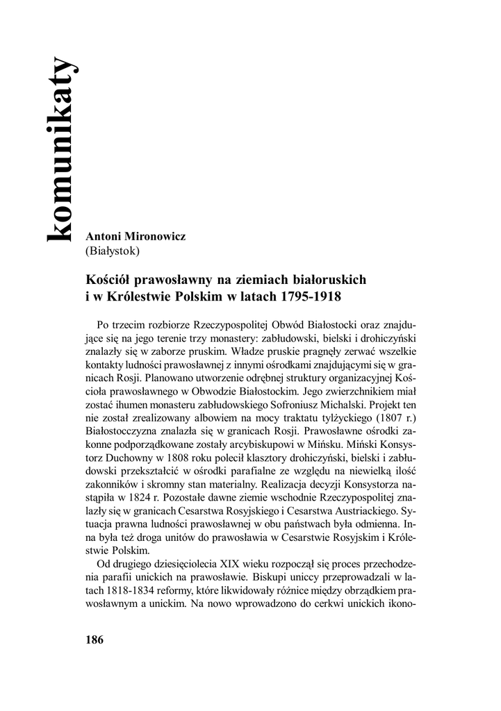 komunikaty Antoni Mironowicz (Białystok) Kościół prawosławny na ziemiach białoruskich i w Królestwie Polskim w latach 1795-1918 Po trzecim rozbiorze Rzeczypospolitej Obwód Białostocki oraz znajdujące się na jego terenie trzy monastery: zabłudowski, bielski i drohiczyński znalazły się w zaborze pruskim. Władze pruskie pragnęły zerwać wszelkie kontakty ludności prawosławnej z innymi ośrodkami znajdującymi się w granicach Rosji. Planowano utworzenie odrębnej struktury organizacyjnej Kościoła prawosławnego w Obwodzie Białostockim. Jego zwierzchnikiem miał zostać ihumen monasteru zabłudowskiego Sofroniusz Michalski. Projekt ten nie został zrealizowany albowiem na mocy traktatu tylżyckiego (1807 r.) Białostocczyzna znalazła się w granicach Rosji. Prawosławne ośrodki zakonne podporządkowane zostały arcybiskupowi w Mińsku. Miński Konsystorz Duchowny w 1808 roku polecił klasztory drohiczyński, bielski i zabłudowski przekształcić w ośrodki parafialne ze względu na niewielką ilość zakonników i skromny stan materialny. Realizacja decyzji Konsystorza nastąpiła w 1824 r. Pozostałe dawne ziemie wschodnie Rzeczypospolitej znalazły się w granicach Cesarstwa Rosyjskiego i Cesarstwa Austriackiego. Sytuacja prawna ludności prawosławnej w obu państwach była odmienna. Inna była też droga unitów do prawosławia w Cesarstwie Rosyjskim i Królestwie Polskim. Od drugiego dziesięciolecia XIX wieku rozpoczął się proces przechodzenia parafii unickich na prawosławie. Biskupi uniccy przeprowadzali w latach 1818-1834 reformy, które likwidowały różnice między obrządkiem prawosławnym a unickim. Na nowo wprowadzono do cerkwi unickich ikono- 186 stasy oraz księgi liturgiczne i kanonicznie zgodne z prawosławiem. Jeszcze przed soborem w Połocku (1839 r.) duchowni greckokatoliccy stanęli przed alternatywą: albo mieli zostać całkowicie wchłonięci przez Kościół rzymskokatolicki albo przyłączyć się do Kościoła prawosławnego. Pierwsze rozwiązanie oznaczało ich szybką latynizację i polonizację, drugie zaś dawało szansę zachowania wschodniej tradycji kościelnej. Rozdźwięk wśród unitów nastąpił zwłaszcza po powstaniu styczniowym. Jego klęska przyśpieszyła proces przechodzenia unitów na prawosławie. Świadom konieczności tej decyzji był twórca synodu zjednoczeniowego Józef Siemaszko, stojący wówczas w centrum spraw obrządku greckokatolickiego. Józef Siemaszko urodził się 25 grudnia 1798 r. we wsi Pawłówka, powiatu lipowickiego. Ojciec jego, Timofiej Siemaszko, był duchownym unickim1. Początki swej edukacji Siemaszko zdobywał u prawosławnego diakona Boczkowskiego, a następnie w niemirowskim gimnazjum. W 1816 roku wstąpił do Głównego Seminarium w Wilnie, gdzie po czteroletniej nauce uzyskał tytuł doktora teologii. W 1820 roku został wyświęcony przez władykę unickiego Jakuba Martusiewicza na duchownego. Z uwagi na zdolności organizacyjne i intelektualne Józefa Siemaszkę wybrano na członka Konsystorza diecezji łuckiej. W 1822 roku został przewodniczącym tego Konsystorza i dziekanem łuckim. W tym samym roku wyznaczono go na przedstawiciela unickiego departamentu w kolegium rzymskokatolickim w Petersburgu. Siemaszko rozpoczął starania na rzecz poprawy materialnego i prawnego położenia unitów w Cesarstwie Rosyjskim. W Petersburgu pogłębiło się wyniesione z dzieciństwa przywiązanie Józefa Siemaszki do prawosławia. Oczarowała go architektura sakralna, malarstwo i śpiew. Doznania artystyczne nie przysłoniły mu różnic dogmatycznych i organizacyjnych obu Kościołów. Świadomość ich przezwyciężenia legła u postaw przyszłej działalności duchownego unickiego. Pomogło mu w tym poznanie w Petersburgu teologii prawosławnej i bogactwa wartości religijnej prawosławia. Kilkanaście lat później Józef Siemaszko napisał: „(..) dawno przekonałem się do prawosławia Cerkwi wschodniej, a to dzięki czytaniu i szczegółowym poszukiwaniom, a jednocześnie należałem do Kościoła zachodniego”2. Podjęcie działalności w kierunku zjednoczenia unitów z Cerkwią prawosławną napotkało szereg przeciwności. Przeciwne zjednoczeniu było duchowieństwo rzymskokatolickie i znaczna część unickiego. Niekonsekwentną politykę w stosunku do unitów prowadziła hierar1 2 Dane o życiu Józefa Siemaszki zostały zaczerpnięte z opracowanych przez niego zapisów, por.: I. Siemaszko, Zapiski mitropolita litowskogo izdannyja Impieratorskoju Akadiemijeju Nauk po zawieszczaniju awtora, t. I, Sankt-Pietierburg 1893. Biografia Józefa Siemaszki znajduje się w Podręcznej Encyklopedii Katolickiej, t. XXXVXXXVI, Warszawa 1912. I. Siemaszko, Zapiski..., s. 30. 187 chia Kościoła rosyjskiego i administracja carska. Jedynie dzięki szczególnym zdolnościom organizacyjnym Józefa Siemaszki udało się zahamować latynizację obrządku unickiego i zainteresować planem zjednoczenia swych współwyznawców oraz wpływowe osoby w Moskwie i Petersburgu. Działalność tę Siemaszko mógł podjąć po objęciu w Konsystorzu wszystkich spraw związanych z funkcjonowaniem Kościoła greckokatolickiego w Rosji. Będąc w Petersburgu Siemaszko doprowadził w latach dwudziestych XIX wieku do powrotu z katolicyzmu 20 tysięcy unitów, do wydania przez cara Mikołaja w 1826 r. edyktu zakazującego budowy kościołów łacińskich wśród ludności unickiej i zakazu z 1827 r. wstępowania do klasztorów bazyliańskich nie unitów3. W 1827 r. Józef Siemaszko opracował memoriał o stanie Kościoła greckokatolickiego w Rosji, w którym przeanalizował dzieje unii i przedłożył plan zjednoczenia unitów z Cerkwią prawosławną. Projekt zyskał poparcie cara Mikołaja I. W 1828 r. nastąpiły pierwsze istotne posunięcia oddzielające unitów od katolików, m.in. powołanie niezależnego kolegium greckokatolickiego i reorganizacja Kościoła. Z czterech diecezji unickich utworzono dwa biskups