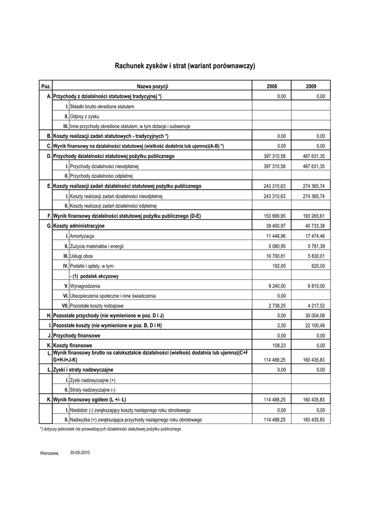 Rachunek zysków i strat (wariant porównawczy) Poz. Nazwa pozycji A. Przychody z działalności statutowej tradycyjnej *) 2008 2009 0,00 0,00 B. Koszty realizacji zadań statutowych - tradycyjnych *) 0,00 0,00 C. Wynik finansowy na działalności statutowej (wielkość dodatnia lub ujemna)(A-B) *) 0,00 0,00 397 310,58 467 631,35 397 310,58 467 631,35 243 310,63 274 365,74 243 310,63 274 365,74 153 999,95 193 265,61 39 400,97 40 733,38 11 448,96 17 474,46 5 080,95 5 781,39 10 700,81 5 830,01 192,00 620,00 9 240,00 6 810,00 I. Składki brutto określone statutem II. Odpisy z zysku III. Inne przychody określone statutem, w tym dotacje i subwencje D. Przychody działalności statutowej pożytku publicznego I. Przychody działalności nieodpłatnej II. Przychody działalności odpłatnej E. Koszty realizacji zadań działalności statutowej pożytku publicznego I. Koszty realizacji zadań działalności nieodpłatnej II. Koszty realizacji zadań działalności odpłatnej F. Wynik finansowy działalności statutowej pożytku publicznego (D-E) G. Koszty administracyjne I. Amortyzacja II. Zużycie materiałów i energii III. Usługi obce IV. Podatki i opłaty, w tym: - (1) podatek akcyzowy V. Wynagrodzenia VI. Ubezpieczenia społeczne i inne świadczenia VII. Pozostałe koszty rodzajowe 0,00 2 738,25 4 217,52 H. Pozostałe przychody (nie wymienione w poz. D i J) 0,00 30 004,08 I. Pozostałe koszty (nie wymienione w poz. B, D i H) 2,50 22 100,48 J. Przychody finansowe 0,00 0,00 108,23 0,00 114 488,25 160 435,83 0,00 0,00 114 488,25 160 435,83 0,00 0,00 114 488,25 160 435,83 K. Koszty finansowe L. Wynik finansowy brutto na całokształcie działalności (wielkość dodatnia lub ujemna)(C+F G+H-I+J-K) Ł. Zyski i straty nadzwyczajne I. Zyski nadzwyczajne (+) II. Straty nadzwyczajne (-) K. Wynik finansowy ogółem (L +/- Ł) I. Niedobór (-) zwiększający koszty następnego roku obrotowego II. Nadwyżka (+) zwiększająca przychody następnego roku obrotowego *) dotyczy jednostek nie prowadzących działalności statutowej pożytku publicznego Warszawa, 30-05-2010