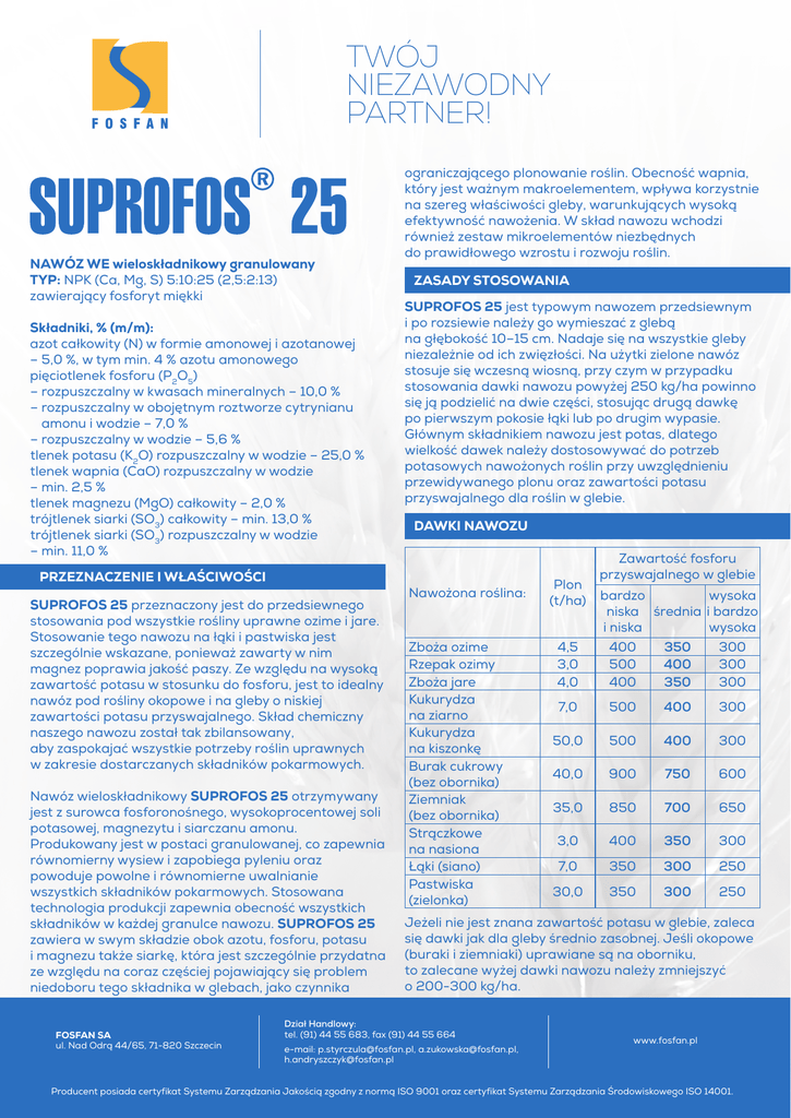 TWÓJ NIEZAWODNY PARTNER! NAWÓZ WE wieloskładnikowy granulowany TYP: NPK (Ca, Mg, S) 5:10:25 (2,5:2:13) zawierający fosforyt miękki Składniki, % (m/m): azot całkowity (N) w formie amonowej i azotanowej – 5,0 %, w tym min. 4 % azotu amonowego pięciotlenek fosforu (P2O5) – rozpuszczalny w kwasach mineralnych – 10,0 % – rozpuszczalny w obojętnym roztworze cytrynianu amonu i wodzie – 7,0 % – rozpuszczalny w wodzie – 5,6 % tlenek potasu (K2O) rozpuszczalny w wodzie – 25,0 % tlenek wapnia (CaO) rozpuszczalny w wodzie – min. 2,5 % tlenek magnezu (MgO) całkowity – 2,0 % trójtlenek siarki (SO3) całkowity – min. 13,0 % trójtlenek siarki (SO3) rozpuszczalny w wodzie – min. 11,0 % PRZEZNACZENIE I WŁAŚCIWOŚCI SUPROFOS 25 przeznaczony jest do przedsiewnego stosowania pod wszystkie rośliny uprawne ozime i jare. Stosowanie tego nawozu na łąki i pastwiska jest szczególnie wskazane, ponieważ zawarty w nim magnez poprawia jakość paszy. Ze względu na wysoką zawartość potasu w stosunku do fosforu, jest to idealny nawóz pod rośliny okopowe i na gleby o niskiej zawartości potasu przyswajalnego. Skład chemiczny naszego nawozu został tak zbilansowany, aby zaspokajać wszystkie potrzeby roślin uprawnych w zakresie dostarczanych składników pokarmowych. Nawóz wieloskładnikowy SUPROFOS 25 otrzymywany jest z surowca fosforonośnego, wysokoprocentowej soli potasowej, magnezytu i siarczanu amonu. Produkowany jest w postaci granulowanej, co zapewnia równomierny wysiew i zapobiega pyleniu oraz powoduje powolne i równomierne uwalnianie wszystkich składników pokarmowych. Stosowana technologia produkcji zapewnia obecność wszystkich składników w każdej granulce nawozu. SUPROFOS 25 zawiera w swym składzie obok azotu, fosforu, potasu i magnezu także siarkę, która jest szczególnie przydatna ze względu na coraz częściej pojawiający się problem niedoboru tego składnika w glebach, jako czynnika FOSFAN SA ul. Nad Odrą 44/65, 71-820 Szczecin ograniczającego plonowanie roślin. Obecność wapnia, który jest ważnym makroelementem, wpływa korzystnie na szereg właściwości gleby, warunkujących wysoką efektywność nawożenia. W skład nawozu wchodzi również zestaw mikroelementów niezbędnych do prawidłowego wzrostu i rozwoju roślin. ZASADY STOSOWANIA SUPROFOS 25 jest typowym nawozem przedsiewnym i po rozsiewie należy go wymieszać z glebą na głębokość 10–15 cm. Nadaje się na wszystkie gleby niezależnie od ich zwięzłości. Na użytki zielone nawóz stosuje się wczesną wiosną, przy czym w przypadku stosowania dawki nawozu powyżej 250 kg/ha powinno się ją podzielić na dwie części, stosując drugą dawkę po pierwszym pokosie łąki lub po drugim wypasie. Głównym składnikiem nawozu jest potas, dlatego wielkość dawek należy dostosowywać do potrzeb potasowych nawożonych roślin przy uwzględnieniu przewidywanego plonu oraz zawartości potasu przyswajalnego dla roślin w glebie. DAWKI NAWOZU Nawożona roślina: Zboża ozime Rzepak ozimy Zboża jare Kukurydza na ziarno Kukurydza na kiszonkę Burak cukrowy (bez obornika) Ziemniak (bez obornika) Strączkowe na nasiona Łąki (siano) Pastwiska (zielonka) Plon (t/ha) 4,5 3,0 4,0 Zawartość fosforu przyswajalnego w glebie bardzo wysoka niska średnia i bardzo i niska wysoka 400 350 300 500 400 300 400 350 300 7,0 500 400 300 50,0 500 400 300 40,0 900 750 600 35,0 850 700 650 3,0 400 350 300 7,0 350 300 250 30,0 350 300 250 Jeżeli nie jest znana zawartość potasu w glebie, zaleca się dawki jak dla gleby średnio zasobnej. Jeśli okopowe (buraki i ziemniaki) uprawiane są na oborniku, to zalecane wyżej dawki nawozu należy zmniejszyć o 200-300 kg/ha. Dział Handlowy: tel. (91) 44 55 683, fax (91) 44 55 664 e-mail: [email protected], [email protected], [email protected] www.fosfan.pl Producent posiada certyfikat Systemu Zarządzania Jakością zgodny z normą ISO 9001 oraz certyfikat Systemu Zarządzania Ś rodowiskowego ISO 14001.