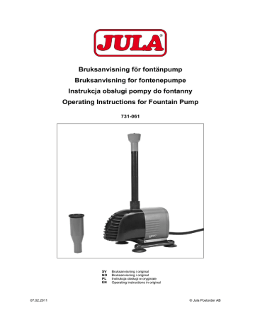 Bruksanvisning för fontänpump Bruksanvisning for fontenepumpe Instrukcja obsługi pompy do fontanny Operating Instructions for Fountain Pump 731-061 SV NO PL EN 07.02.2011 Bruksanvisning i original Bruksanvisning i original Instrukcja obsługi w oryginale Operating instructions in original © Jula Postorder AB SVENSKA SVENSK A SÄKERHETSANVISNINGAR Läs bruksanvisningen noggrant innan användning! Spara bruksanvisningen för framtida referens. Pumpen får endast användas tillsammans med jordfelsbrytare med max utlösande märkström på 30 mA. Pumpen måste anslutas till skyddsjordat nätuttag. Pumpen får inte användas i pooler, bassänger eller i vattendrag där det finns risk för att personer vistas. Pumpen är endast avsedd för utomhusbruk. Koppla bort pumpen från nätspänning innan servicearbete eller liknande. Skadad nätkabel får inte repareras. Om nätkabeln uppvisar skador ska den kasseras. Pumpen får endast användas tillsammans med vatten. Pumpen får inte hänga i tryckledningen eller nätkabeln. Pumpen ska skyddas från frost och minusgrader. Pumpen ska placeras så att den är oåtkomlig för barn. Vattnets temperatur får inte understiga 4°C och överstiga 35°C. Sand och vattenföroreningar sliter på pumpens mekaniska delar. Håll dammen ren för att maximera pumpens livslängd. TEKNISKA DATA Märkspänning Effekt Varvtal Maxflöde Max. uppfordringshöjd Max. nedsänkningsdjup Kapslingsklass Anslutningskabelns längd 230 V / 50 Hz 28 W 2800 v/min 950 l/h 1,9 m 3m IP68 10 m BESKRIVNING 1. 2. 3. 4. 5. 6. 2 Pump Fot Filterbehållare Teleskoprör Kaskadfontän Kupfontän SVENSKA HANDHAVANDE OBS! Starta inte pumpen om den inte är placerad i vatten. Torrkörning kan leda till överhettning av pumpen. 1. Placera pumpen på en plan yta i botten av dammen. Se till att pumpen placeras lite högre än den omgivande bottnen för att undvika att bottensmutsen hamnar i pumpen. 2. Anslut nätkabeln till ett skyddsjordat nätuttag. UNDERHÅLL OBS! Se till att pumpen inte är ansluten till nätspänning vid rengöring eller service. När spruthöjden eller den pumpade vattenmängden avtar ska filtret rengöras med ljummet vatten. Rengör pumpens roterande delar med jämna mellanrum om vattnet är kalkhaltigt. SPRÄNGSKISS 3 SVENSKA Med reservation för tryckfel och konstruktionsändringar som vi inte kan råda över. Vid eventuella problem, kontakta vår serviceavdelning på telefon: 0200-88 55 88. Jula Postorder AB, Box 363, 532 24 SKARA www.jula.se 4 NORSK NORSK SIKKERHETSANVISNINGER Les bruksanvisningen nøye før bruk! Ta vare på bruksanvisningen for fremtidig bruk. Pumpen skal bare brukes sammen med jordfeilbryter med maks. utløsende merkestrøm på 30 mA. Pumpen skal kobles til et beskyttelsesjordet nettuttak. Pumpen skal ikke brukes i bassenger eller vassdrag der det er fare for at personer oppholder seg. Pumpen er kun beregnet på utendørs bruk. Koble pumpen fra nettspenningen før servicearbeid eller lignende. Skadet strømkabel skal ikke repareres. Strømkabelen må kasseres hvis den er skadet. Pumpen skal bare brukes sammen med vann. Pumpen må ikke henge etter trykkledningen eller strømkabelen. Pumpen skal beskyttes mot frost og minusgrader. Pumpen skal plasseres slik at den er utilgjengelig for barn. Vannets temperatur må ikke være under 4 °C eller over 35 °C. Sand og vannforurensning sliter på pumpens mekaniske deler. Hold dammen ren for å gi pumpen lengst mulig levetid. TEKNISKE DATA Merkespenning Effekt Turtall Maks. kapasitet Maks. pumpehøyde Maks. nedsenkningsdybde Kapslingsklasse Tilkoblingskabelens lengde 230 V / 50 Hz 28 W 2800 o/min 950 l/t 1,9 m 3m IP68 10 m BESKRIVELSE 1. 2. 3. 4. 5. 6. 5 Pumpe Fot Filterbeholder Teleskoprør Kaskadefontene Kuppelfontene NORSK BRUK OBS! Ikke start pumpen hvis den ikke er plassert i vann. Tørrkjøring kan føre til overoppheting av pumpen. 1. Plasser pumpen på en jevn overflate i bunnen av dammen. Pass på at pumpen plasseres litt høyere enn bunnen rundt for å unngå at bunnsmussen havner i pumpen. 2. Koble strømkabelen til et beskyttelsesjordet nettuttak. VEDLIKEHOLD OBS! Kontroller at pumpen ikke er koblet til nettspenningen ved rengjøring eller service. Når sprutehøyden eller den pumpede vannmengden avtar, skal filteret rengjøres med lunkent vann. Rengjør pumpens roterende deler med jevne mellomrom hvis vannet er kalkholdig. SPRENGSKISSE 6 NORSK Med forbehold om trykkfeil og konstruksjonsendringer utenfor vår kontroll. Ved eventuelle problemer kan du kontakte vår serviceavdeling på telefon: 67 90 01 34. Jula Norge AS, Solheimsveien 6–8, 1471 LØRENSKOG www.jula.no 7 POLSKI POL SKI PRZEPISY BEZPIECZEŃSTWA Przed użyciem uważnie przeczytaj instrukcję obsługi! Zachowaj niniejszą instrukcję obsługi w celu przyszłego użycia. Pompy należy używać wyłącznie z bezpiecznikiem różnicowoprądowym z poziomem prądu wyzwalania 30 mA. Pompa powinna być podłączona do uziemionego gniazdka sieciowego. Pompy nie należy używać w basenach, zbiornikach oraz ciekach wodnych, gdzie mogą przebywać ludzie. Pompa jest przeznaczona wyłącznie do użytku na zewnątrz pomieszczeń. Przed rozpoczęciem prac serwisowych itp. odłącz pompę od zasilania elektrycznego. Uszkodzonego kabla zasilającego nie należy naprawiać. Uszkodzony kabel należy zutylizować. Pompa jest przeznaczona wyłącznie do pompowania wody. Pompy nie należy zawieszać na przewodzie tłocznym ani na kablu zasilającym. Pompę należy chronić przed mrozem. Pompę należy umieścić w miejscu niedostępnym dla dzieci. Temperatura wody nie powinna być mniejsza niż 4°C ani większa niż 35°C. Piasek oraz zanieczyszczenia powodują zużycie części mechanicznych pompy. W celu wydłużenia żywotności pompy oczko wodne należy utrzymywać w czystości. DANE TECHNICZNE Napięcie znamionowe Moc Prędkość obrotowa Maksymalny przepływ wody Maks. wysokość tłoczenia Maks. głębokość zanurzenia Stopień ochrony obudowy